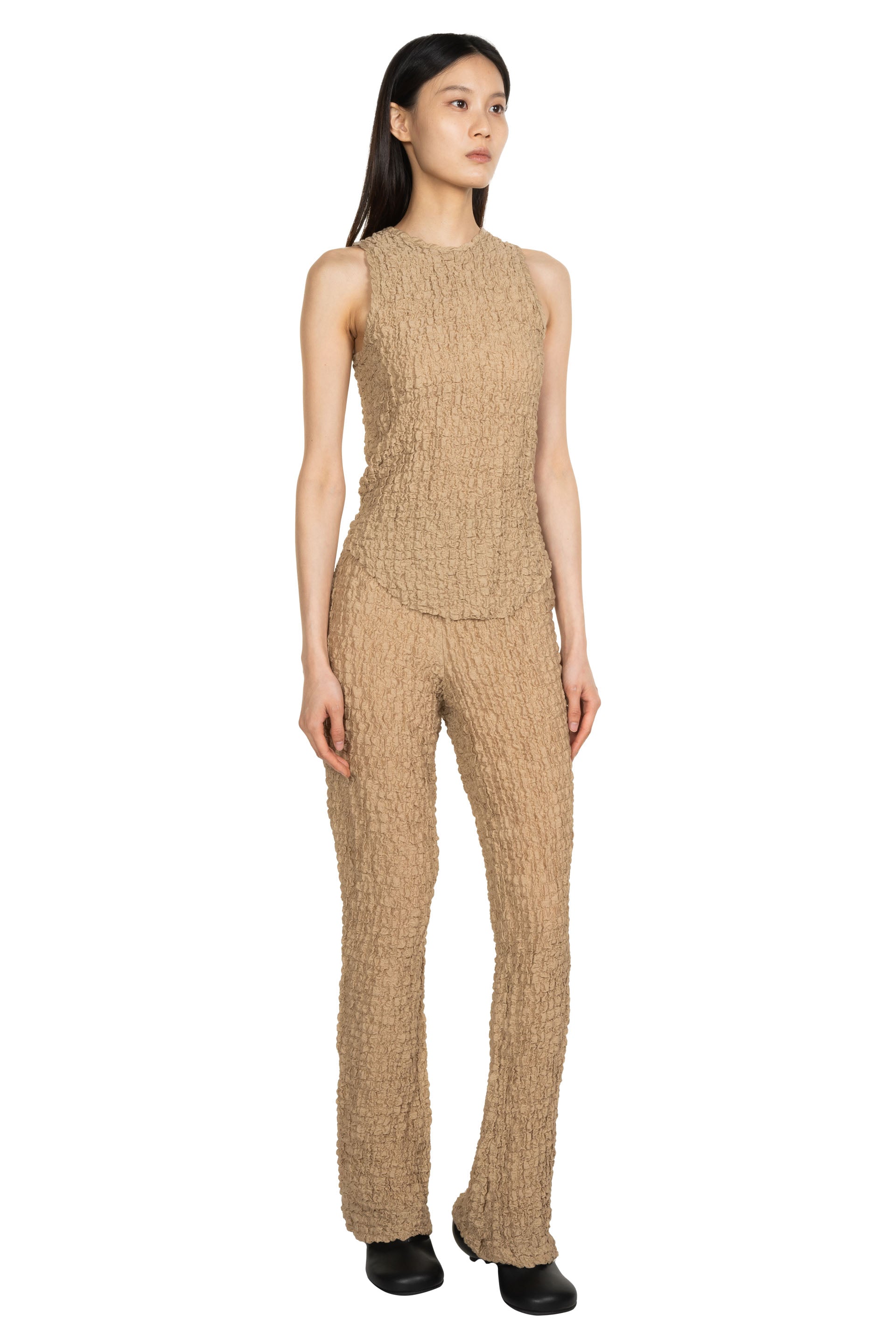 Founded in 2010 by childhood friends Melvin Tanaya and Lyna Ty, Song for the Mute is all about choosing materials carefully. The duo meticulously develops, samples, and selects fabrics in collaboration with artisanal Italian and Japanese mills before patterning their intimate, story-driven collections as seen with the Popcorn Jersey Basic Tank Top Camel.
