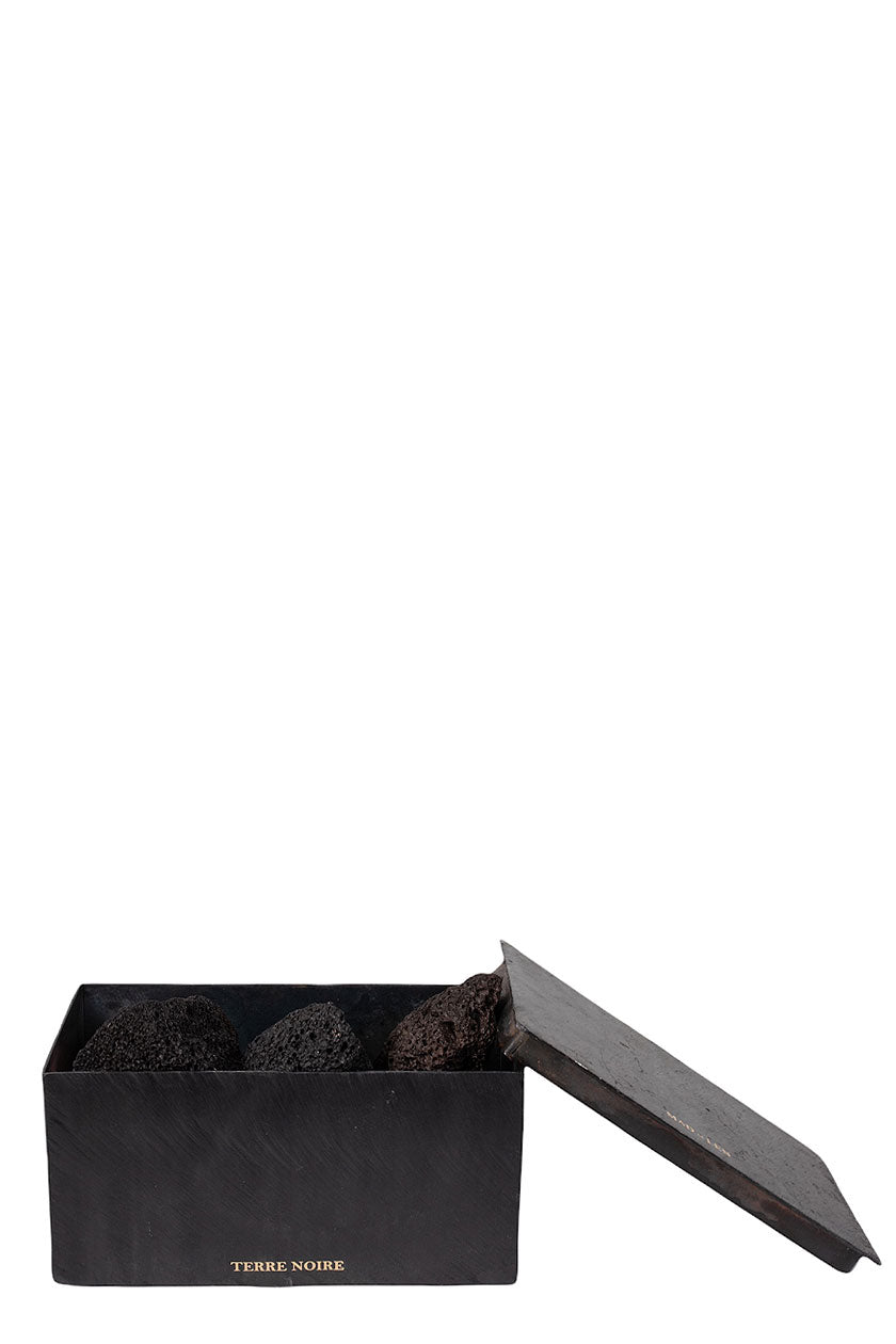 Pot Pourri Lava Rock Terre Noire in a rectangular shape. Stored in Hand hammered iron case with a black fumé finish and a black paper box. Fragrance scent of Black Soil, Earthy, Mineral Note, Ancient woods of Petrified Pine, Rare Aged, Oakwood and Black Land. This pot pourri d’Apothicaire is served with a Terre noire Perfume Recharge 15ml.