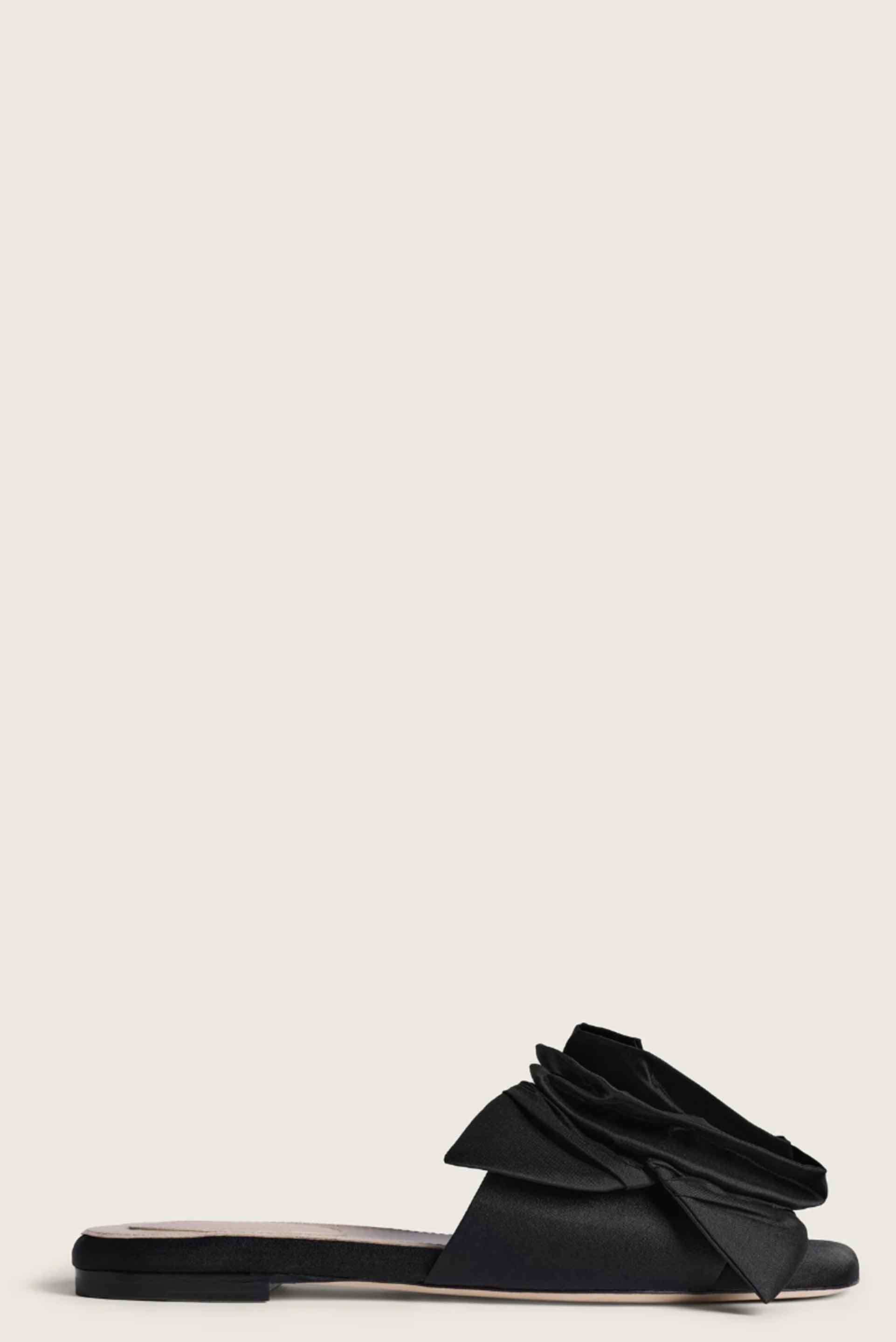 These satin slides feature an emphatic oversized pressed rosette adorning the strap. Lined in supple leather with natural leather soles, combining romantic detail with a polished finish. Slip-on satin slides. Floral appliqué. Padded foot bed. Leather outsole. Heel height 2cm