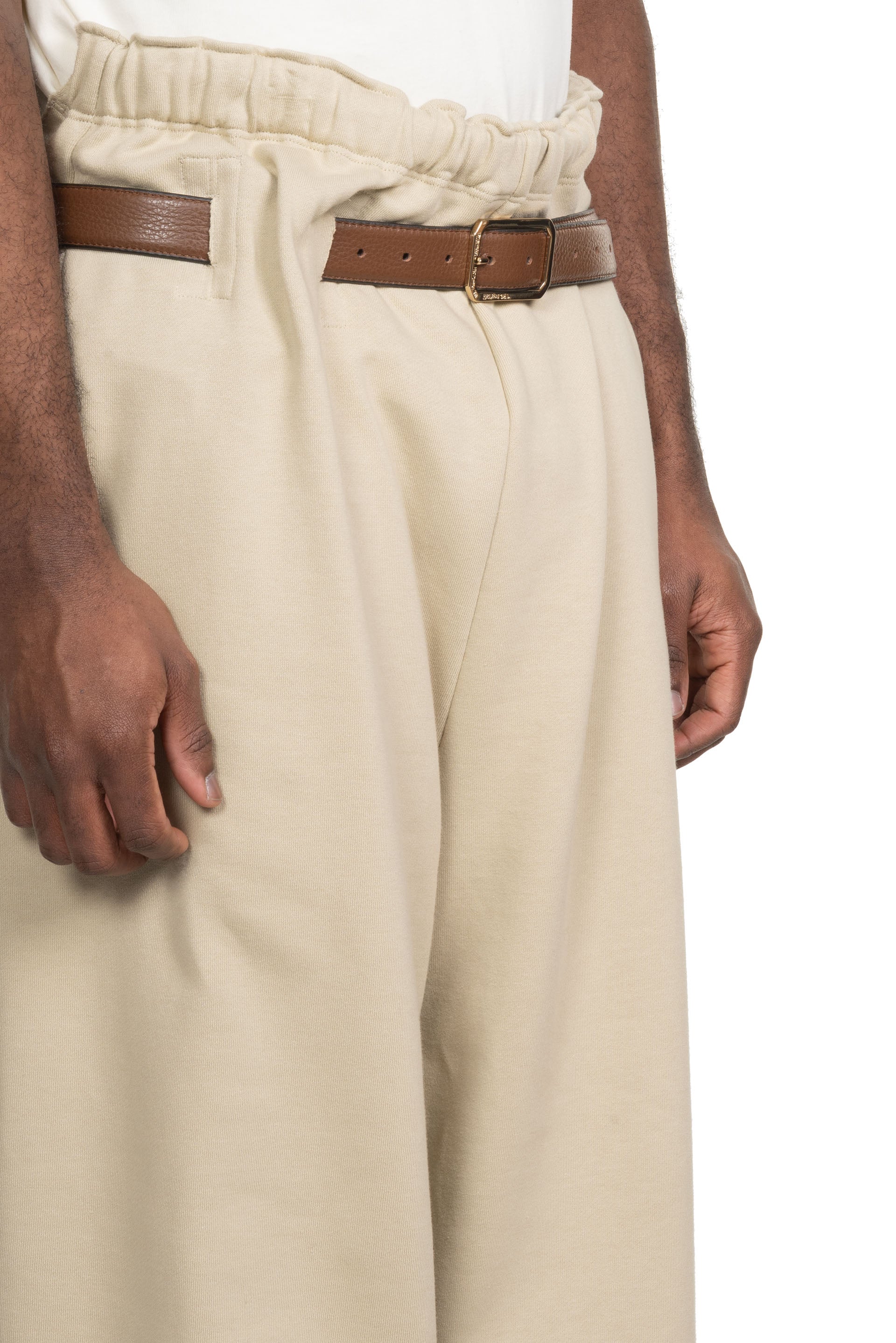 Elastic waist. Bungee tightening cord at front. Two tones details at waist. Magliano embroidery branding at leg. Two side pockets. Elastic cuffs at bottom.