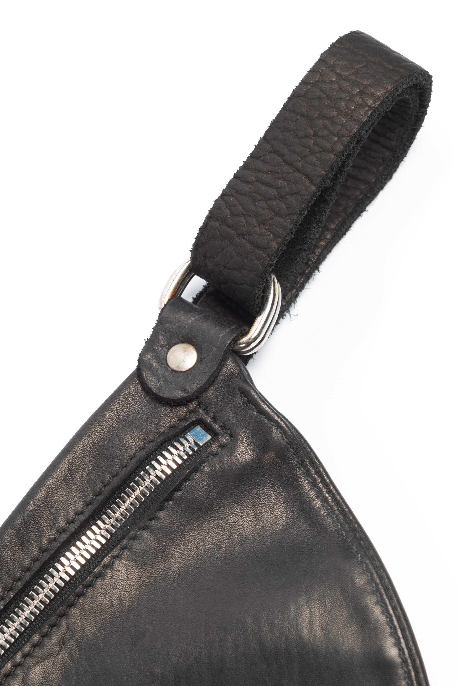 Zip closure. Strap with antique style finishing. Tonal stitching
