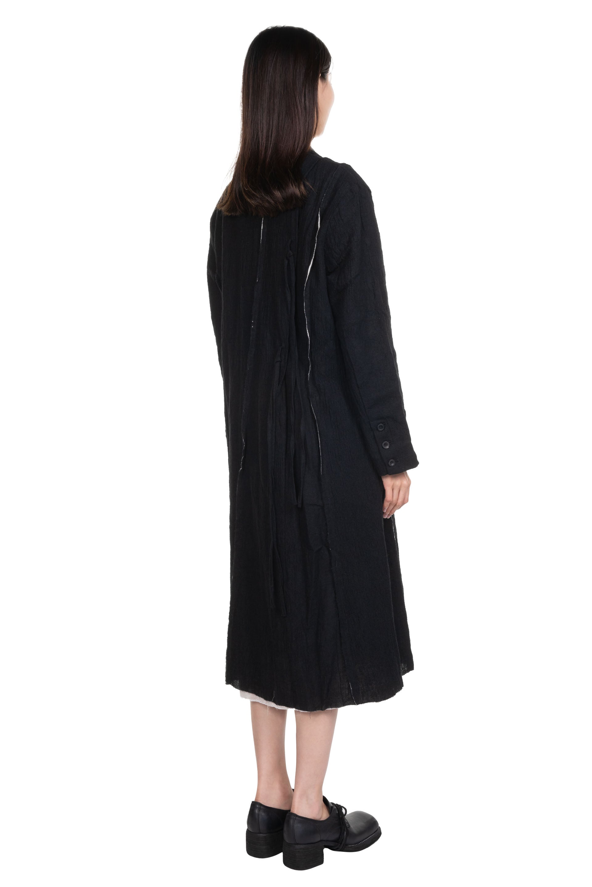 Black Radial Lined Coat from Professor e. Long sleeves. Button closure at front. Single breasted. Button at cuffs. Lined with signature linen lining. Drawstring details at back. Slicing details throughout with contrasting fabric. Two side pockets. Soft textural fabric.