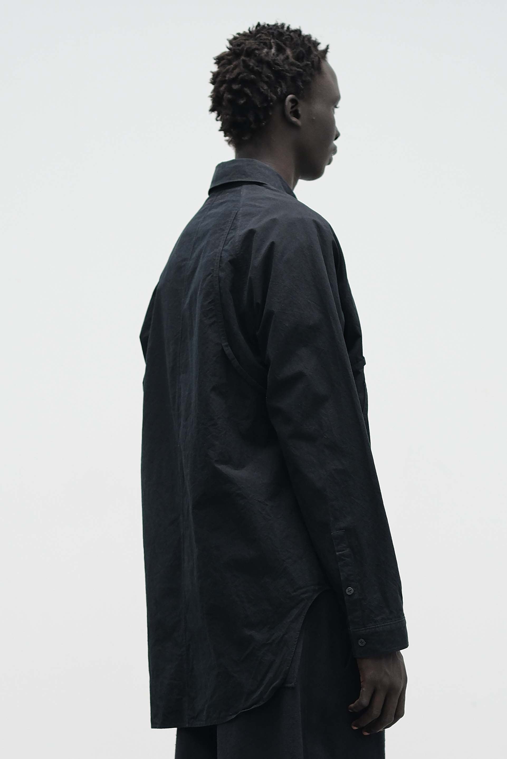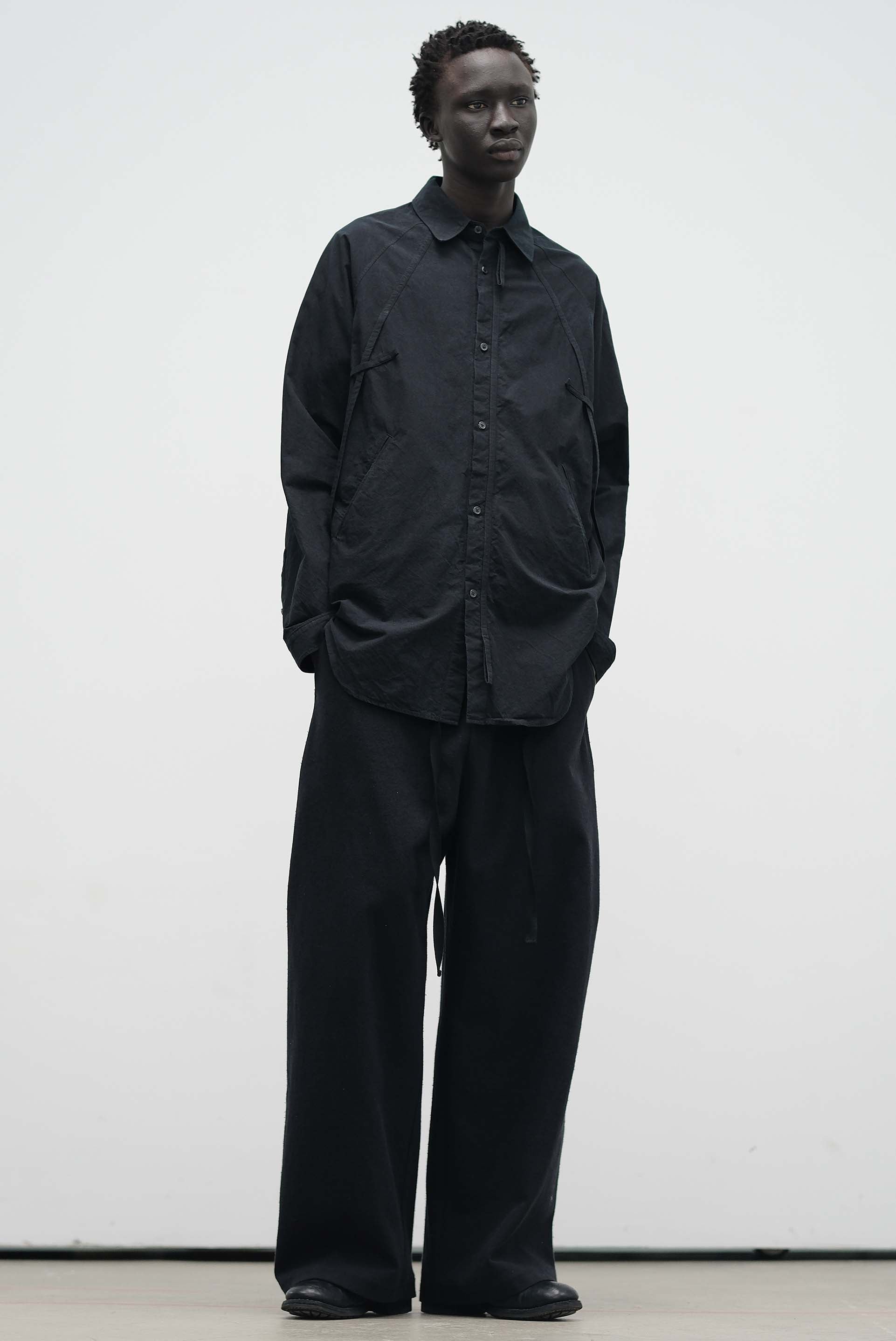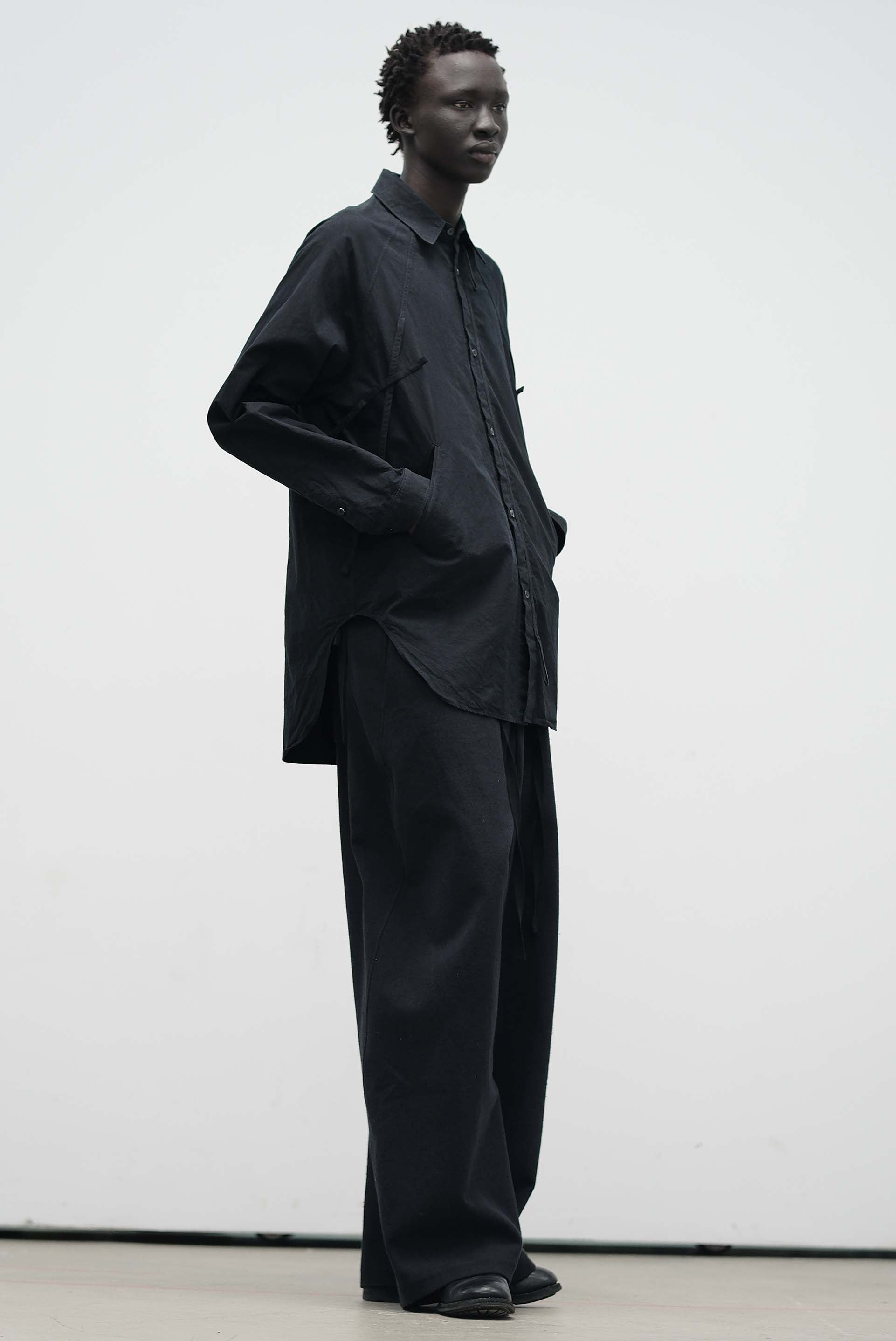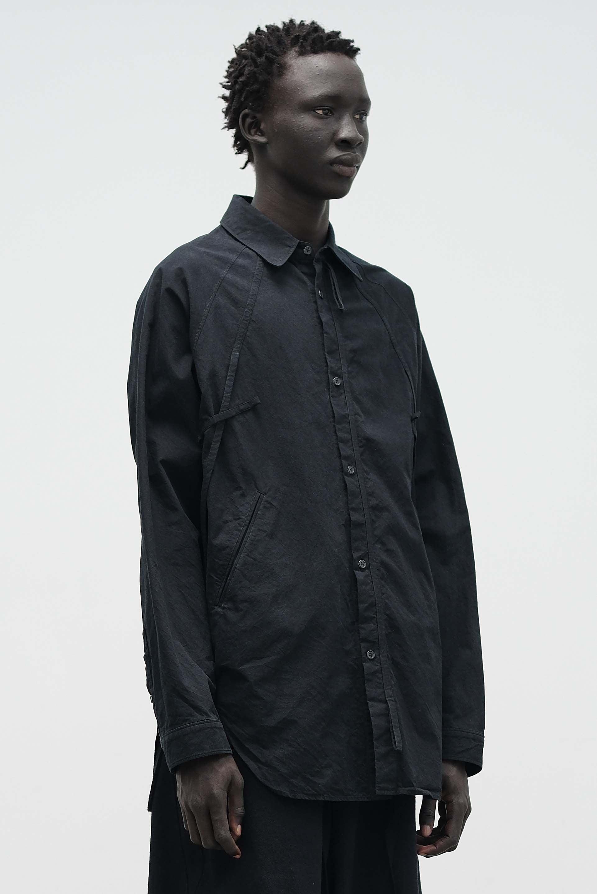 Attempt Raglan Sleeves Tie Shirt Black. Long sleeves. Raglan sleeves. Tie details throughout. Button closure at front. Deconstructed details throughout. Classic collar. Two side pockets