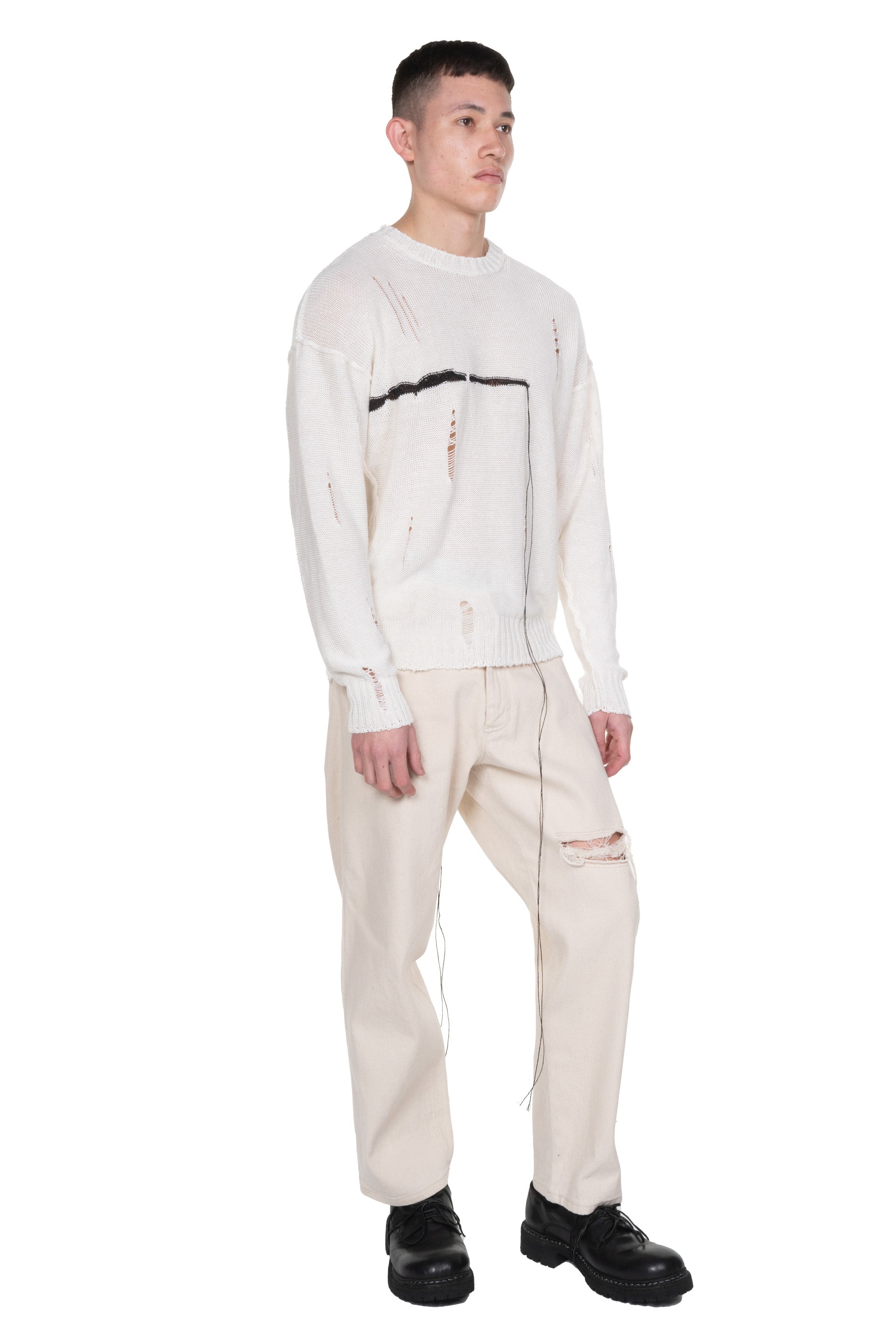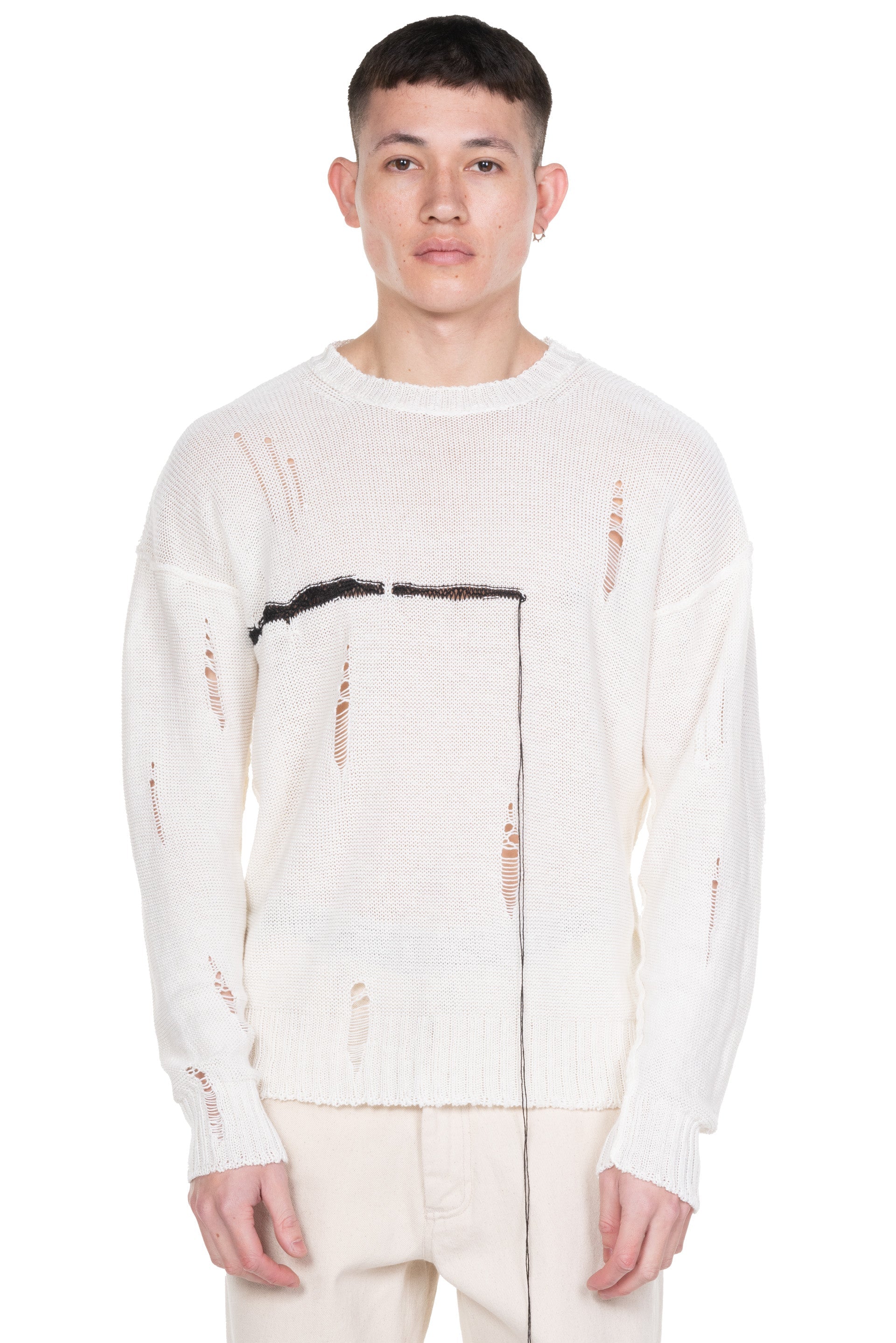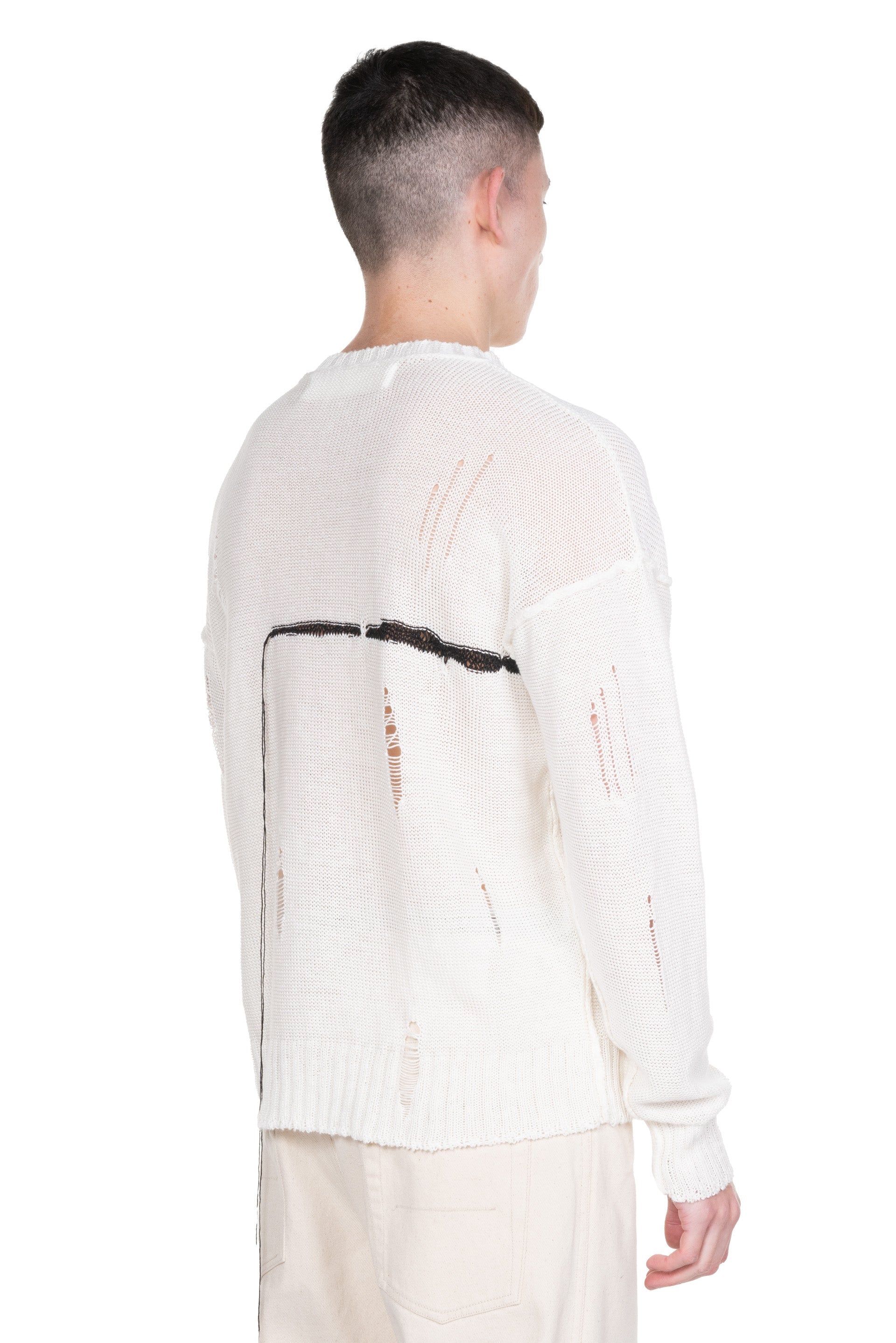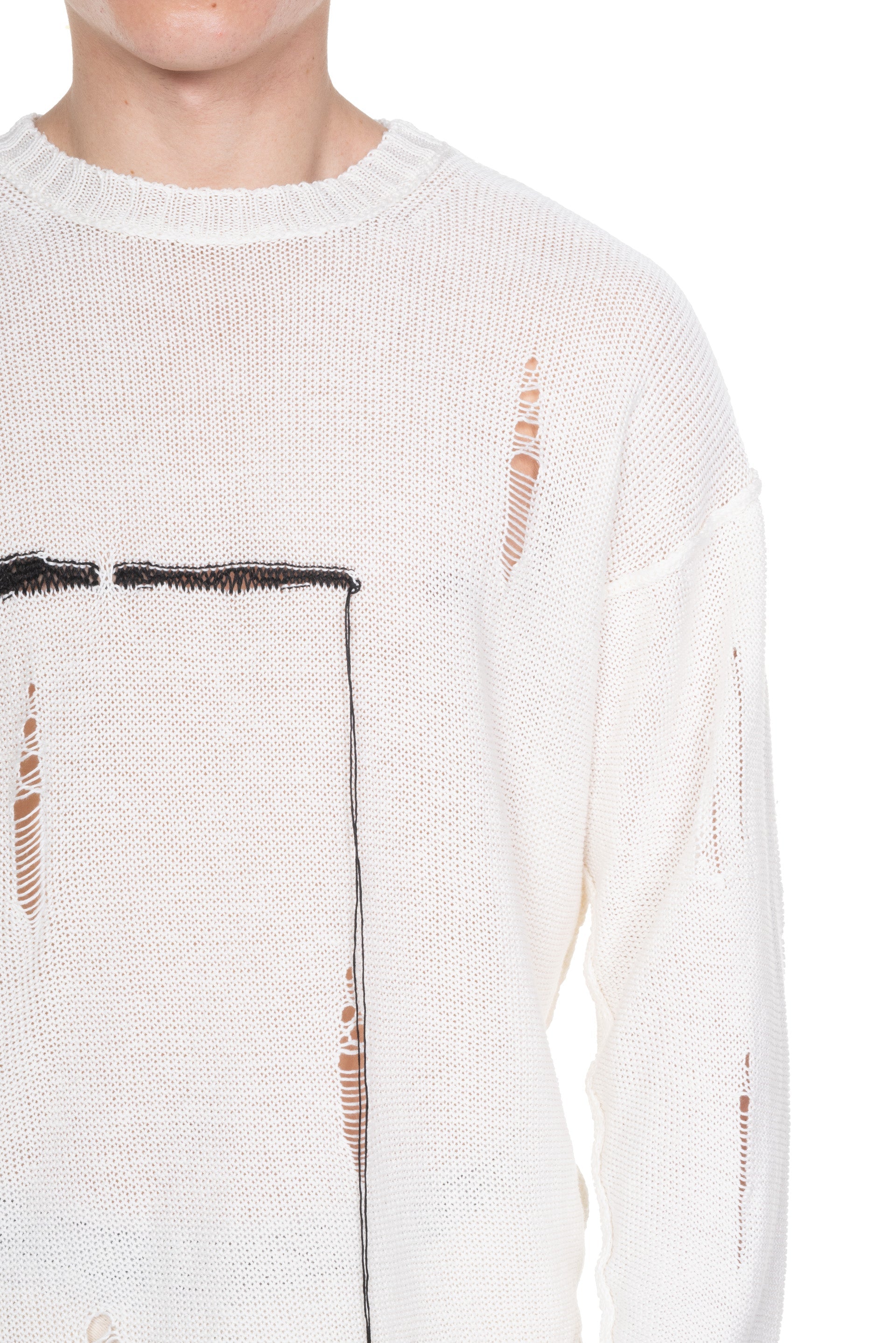 Long sleeves. Round neck. Distressed details throughout. Raw edges throughout. Signature thread details.