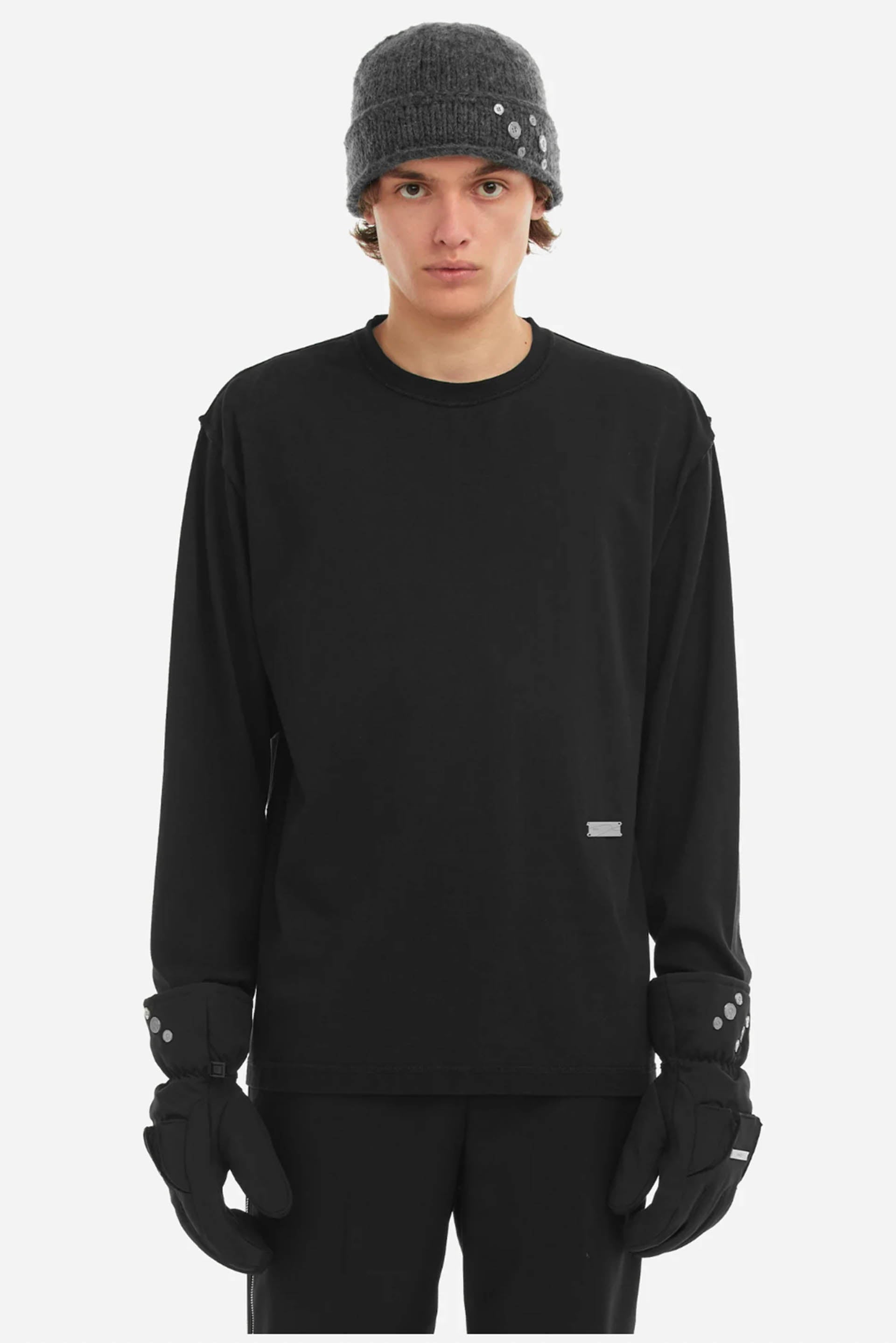 Long Sleeve Cotton Jersey T-shirt. Raw Edge Detail. Rib Knit Collar. Hand Stitched Logo Engraved Metal Tag.