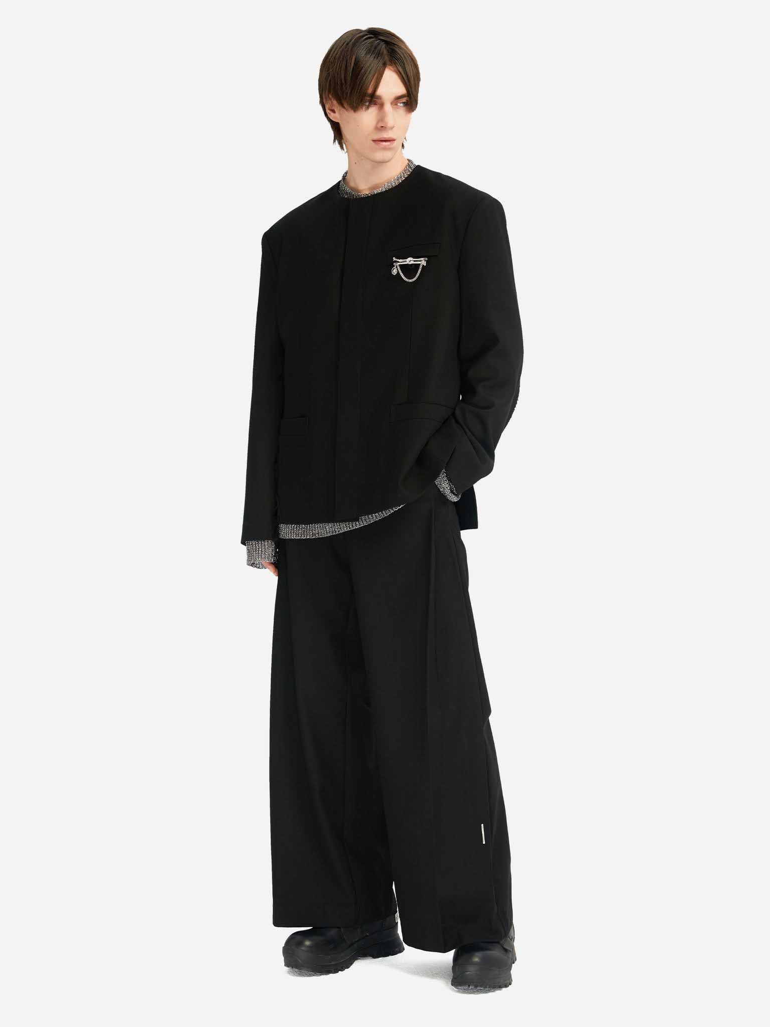 C2H4 concept ranges from hypothetical space scientists producing sport and streetwear-inspired designs creating an intergalactic underground culture. Using her studio as a laboratory, Chen’s meticulously elevates wardrobe cornerstones as seen with the Raw Edge Round Neck Blazer.