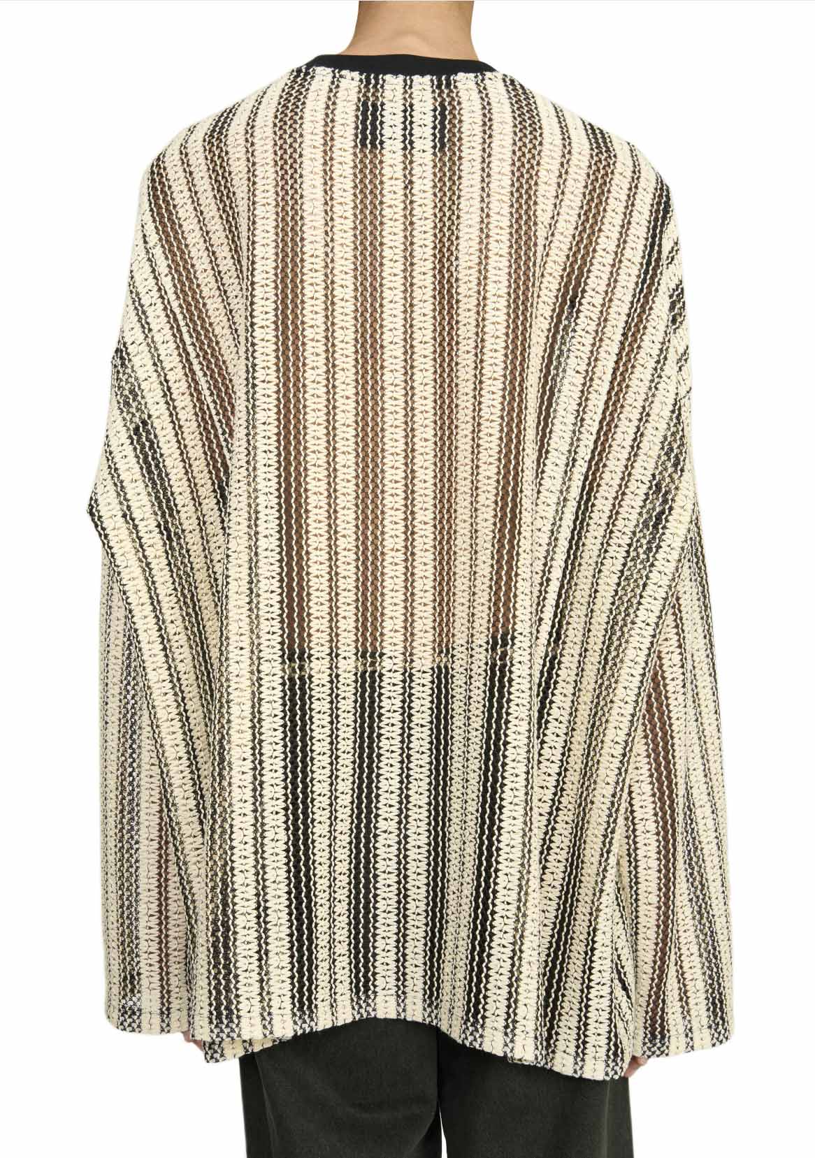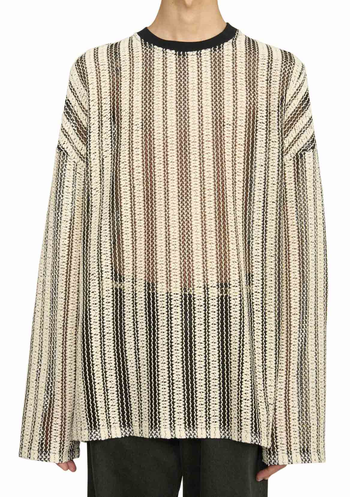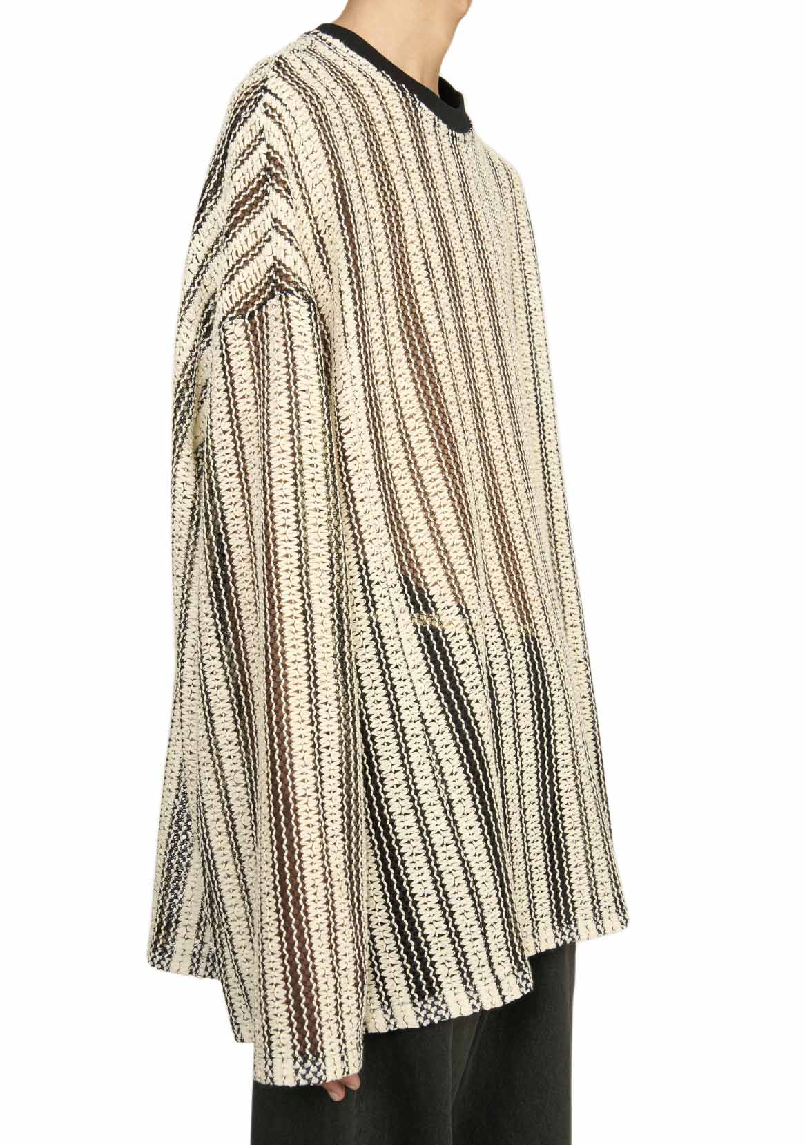 Long sleeve crochet top with rib knit crew collar. Oversized fit.