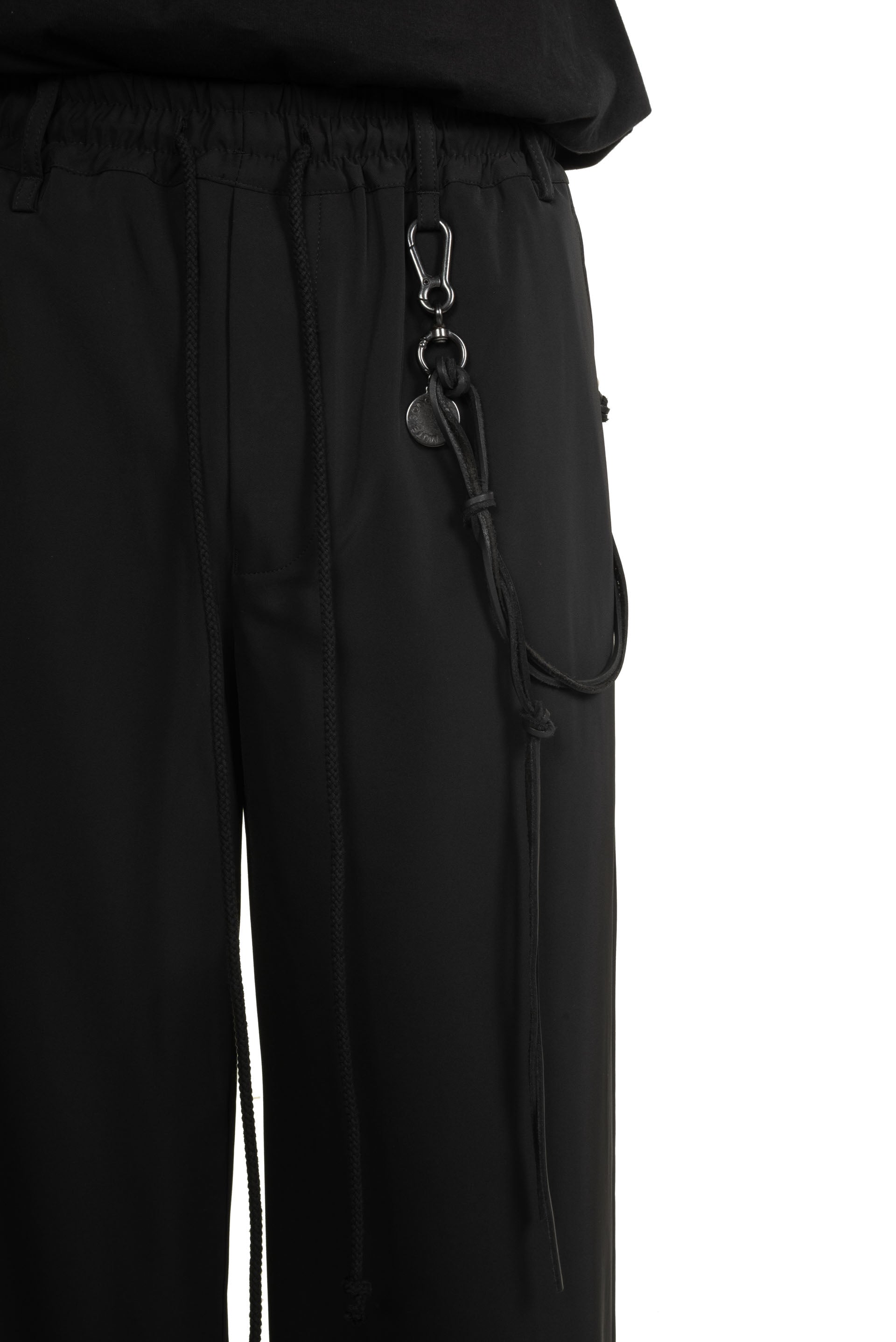Relaxed fit with full length. Structured waistband with belt loops and button fly. Side pockets. Back welt pockets. Seasonal leather details.