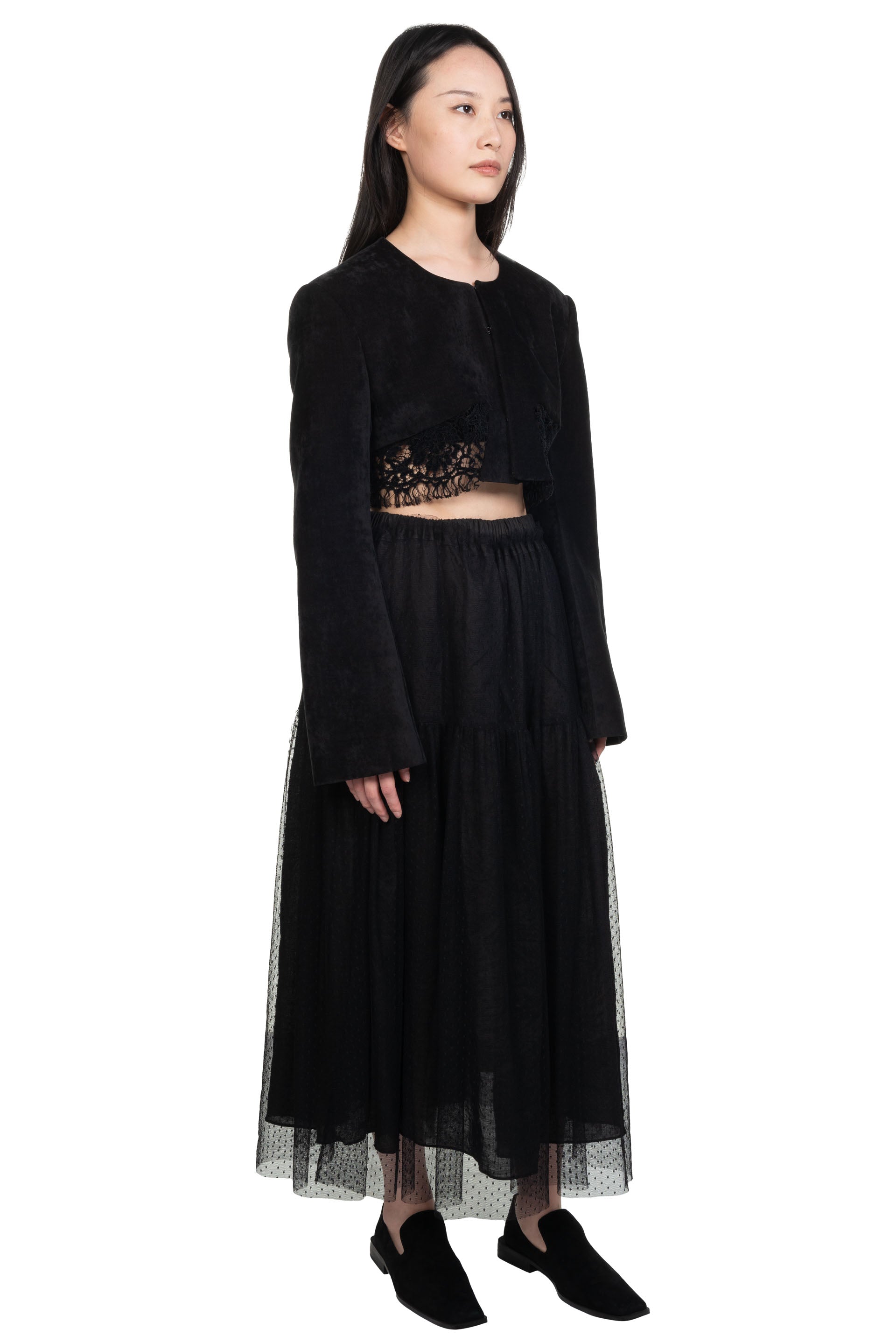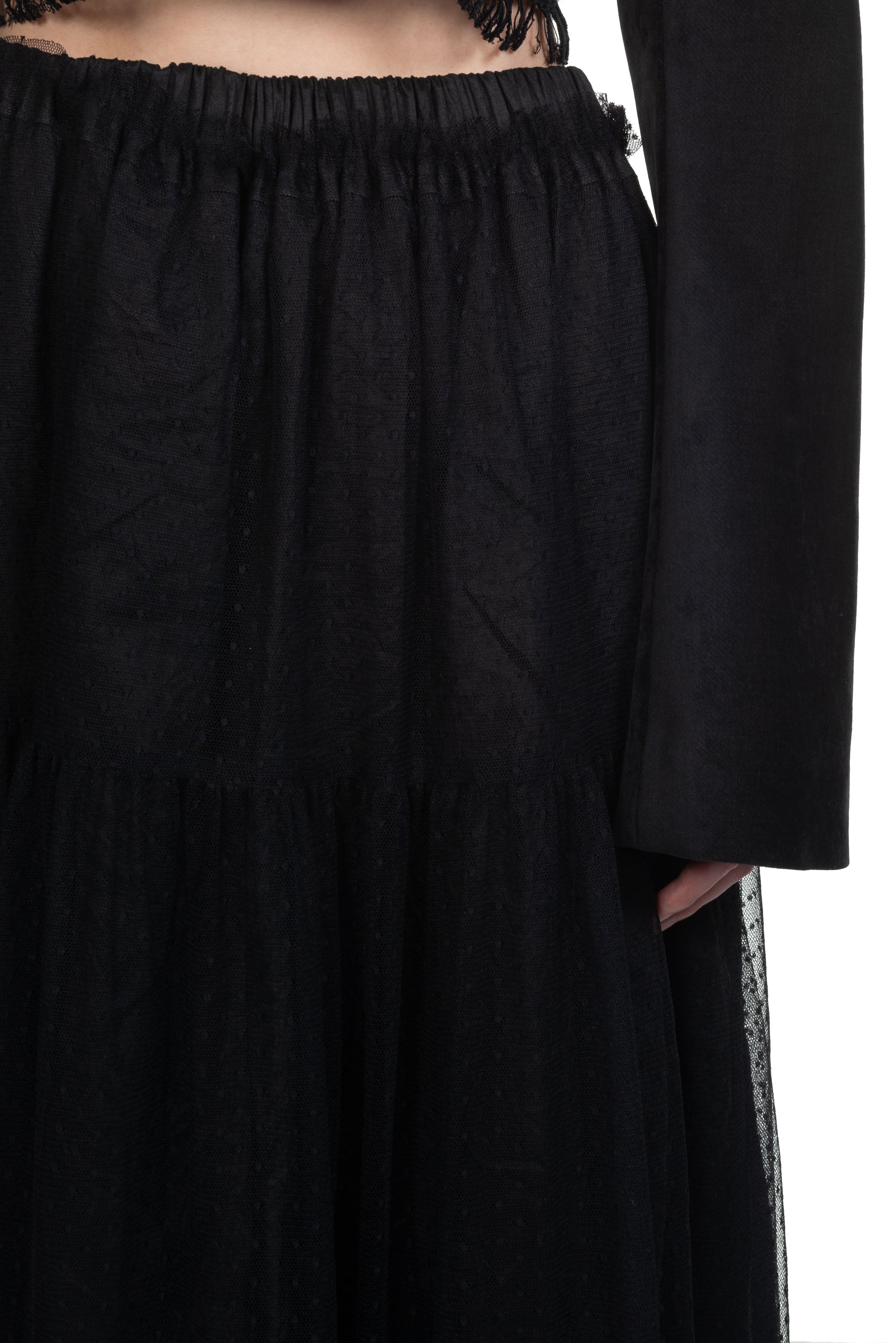A Tentative Atelier aims to explore artistic handicraft elements and innovative forms and silhouettes on garments combining with neo-vintage effect. The label does not only focus on fashion, it is a platform to encourage and sustain the spirit and tradition in craftsmanship to create new form as seen with the Reversible Mesh Skirt.