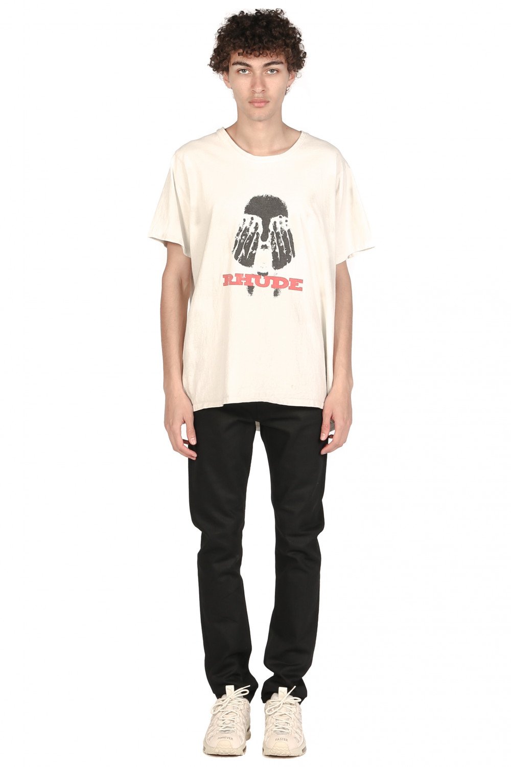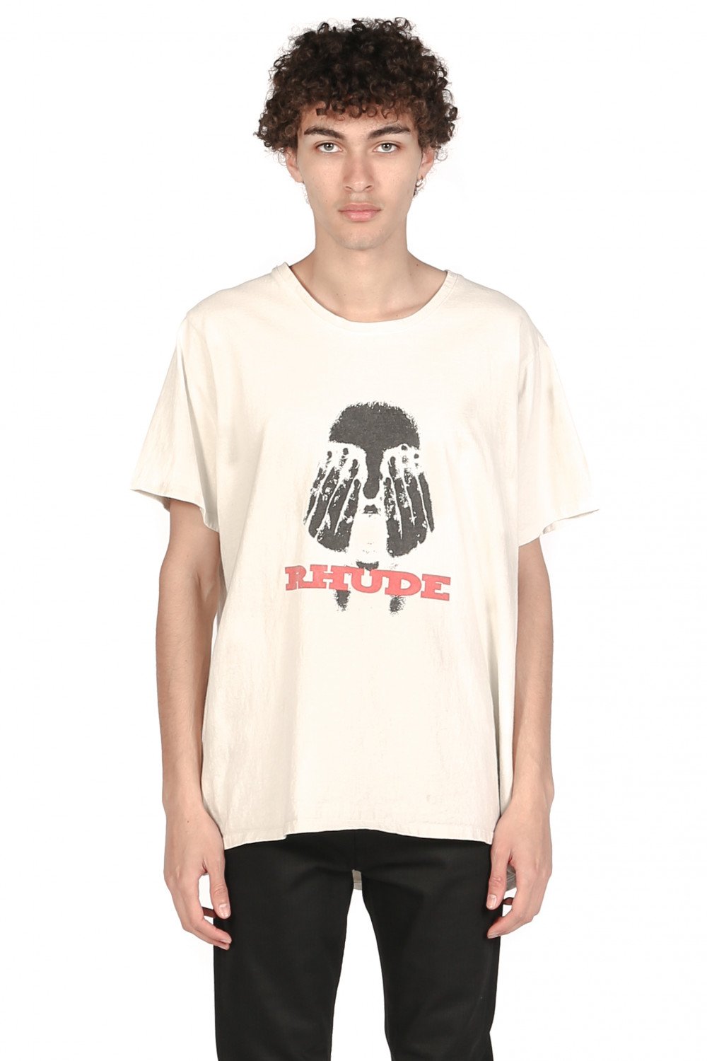 Rhude design merge disparate cultural influences, which combine streetwear style with British punk and high fashion sensibilities. With youthful energy, U.S. based production, and culture-clashed appeal, Rhude acts as a keen reflection of new inroads in men's fashion as seen in the Rhude Hands On Face T-shirt.