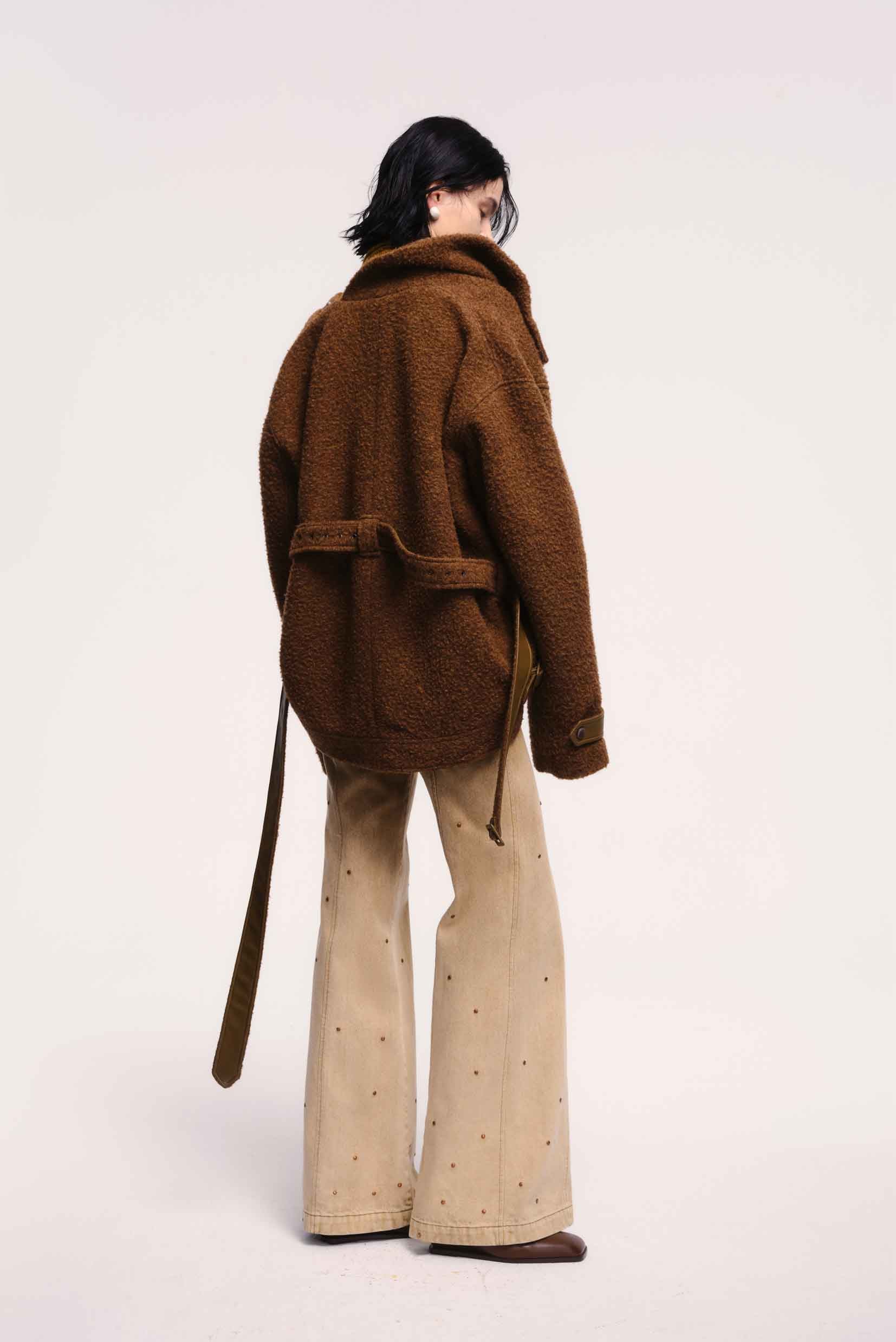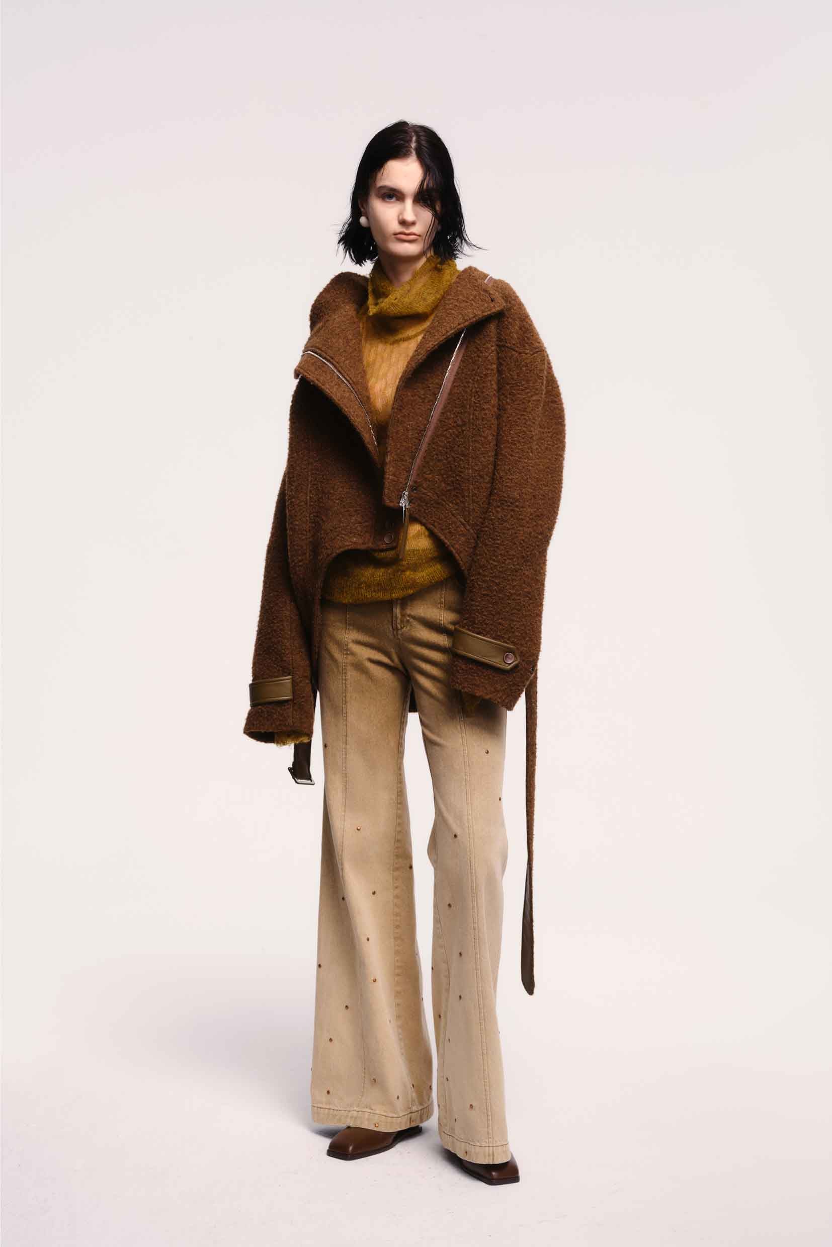 OUDE WAAG strikes a balance between Asian aesthetics and Western cutting. It is at the heart of designer’s philosophy: celebrating the power of women, yet simultaneously critiquing the ongoing objectification and idealisation of the body as you can see in the Oude Waag Burn collection with the Rivetted Wide-Leg Jeans Olive Green.