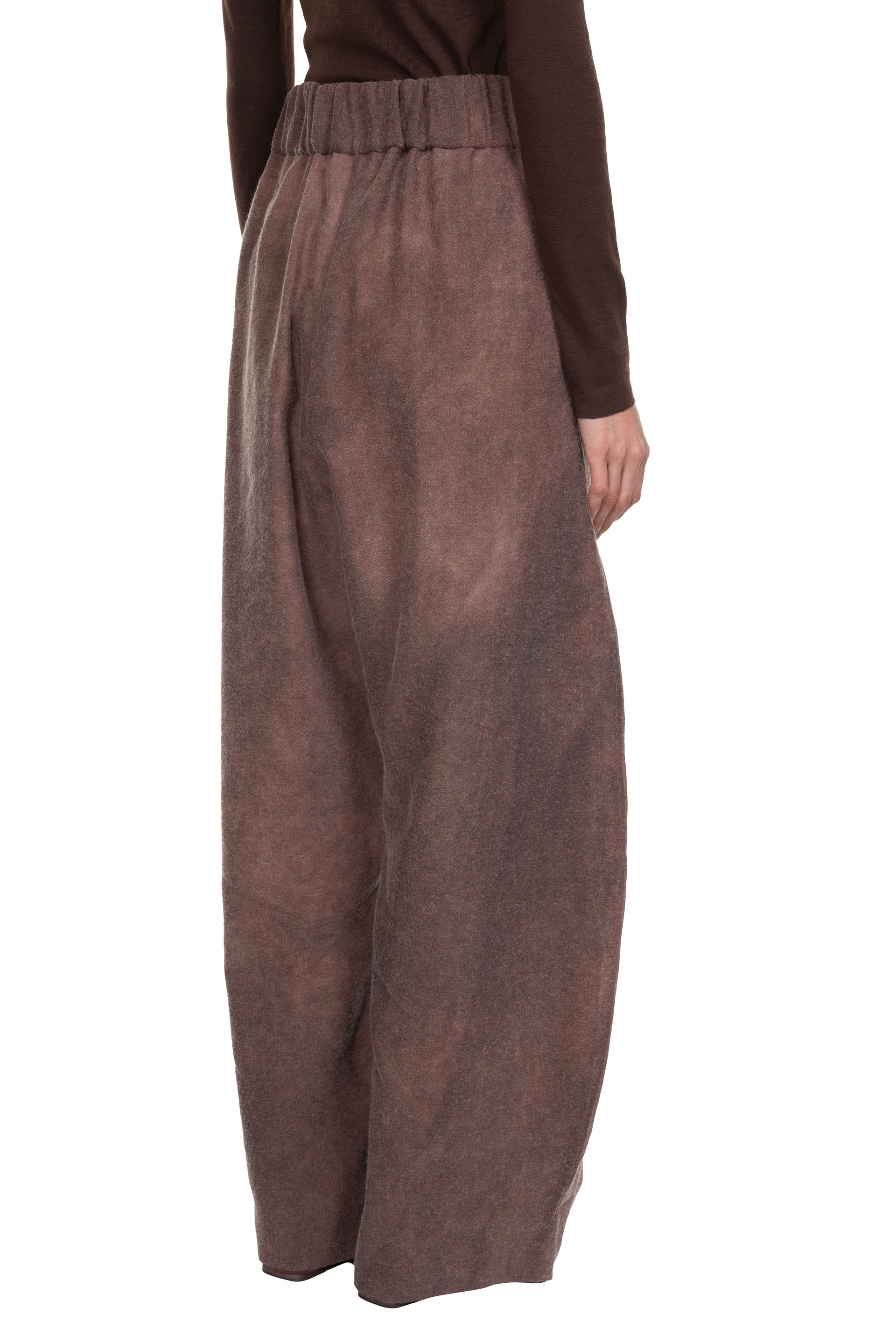 Unisex wide-leg pants made from a fabric that combines linen and virgin wool, with an elastic waist and slightly curved leg.