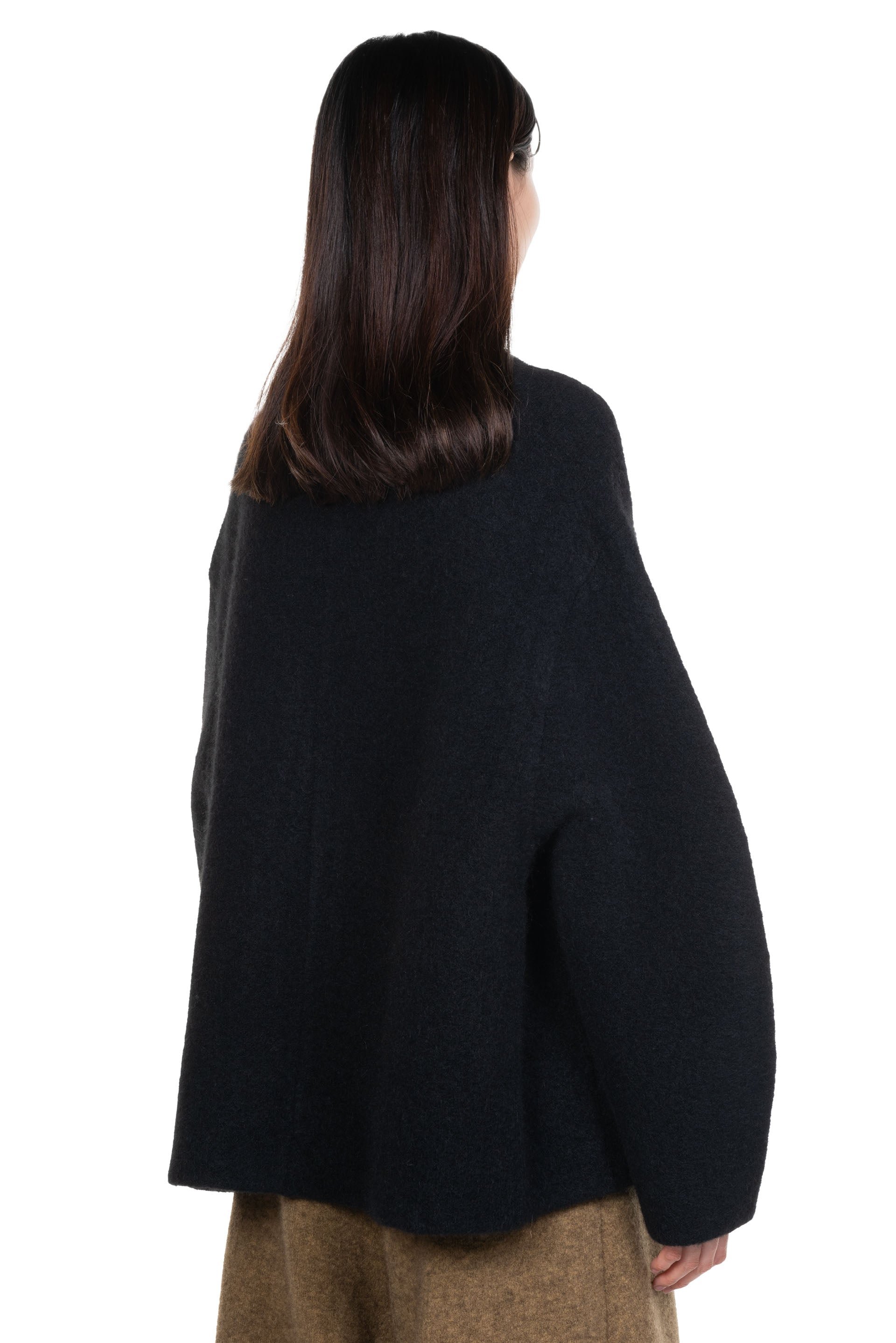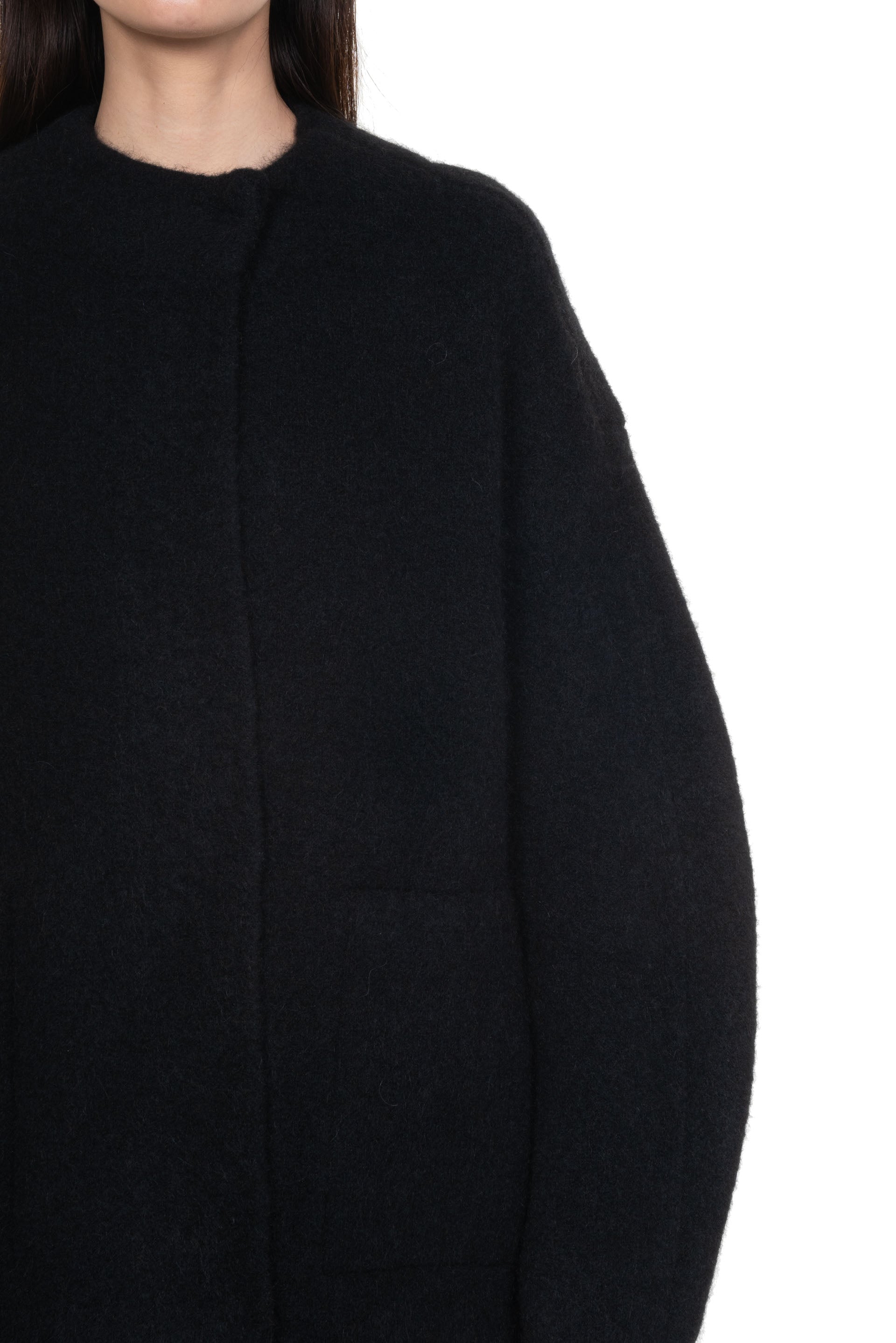Boboutic consider knits an ideal medium, since its versatility allows conceiving unique surfaces and unexpected shapes. The approach to knitwear is unpredictable, aiming at creating a product where materials and structures compensate each other as seen with the Round Neck Jacket Black.