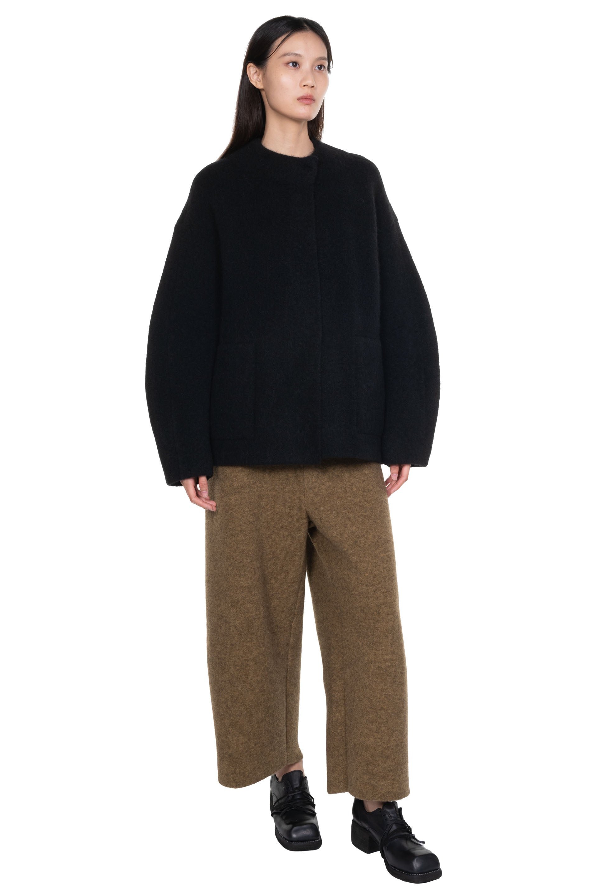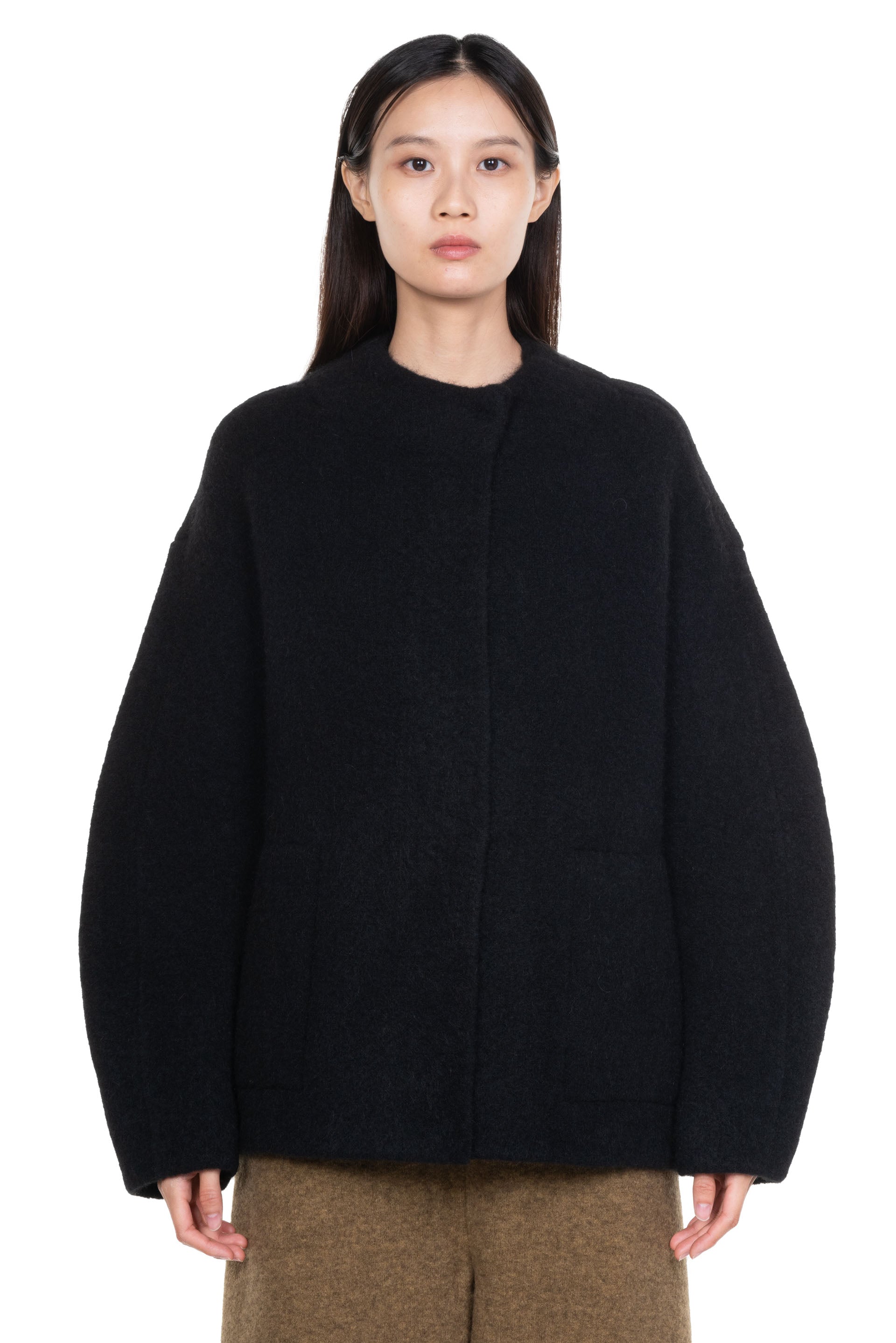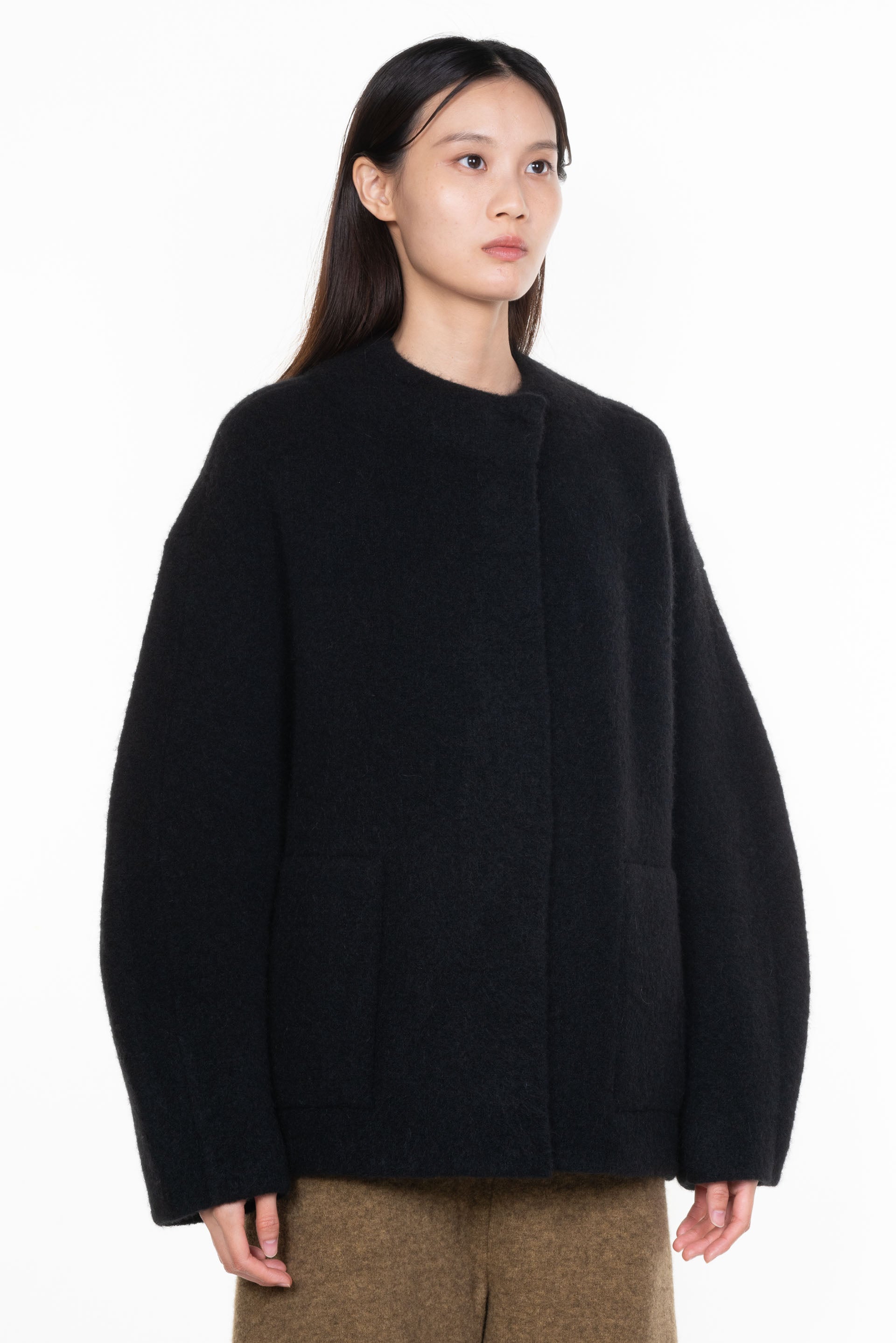 Round Neck Jacket from Boboutic. Round collar. Long sleeves. One pressure button closure at collar. Hidden button system. Two side pockets. Signature Yak mix. Soft textural fabric. Lightweight. Boxy fit.