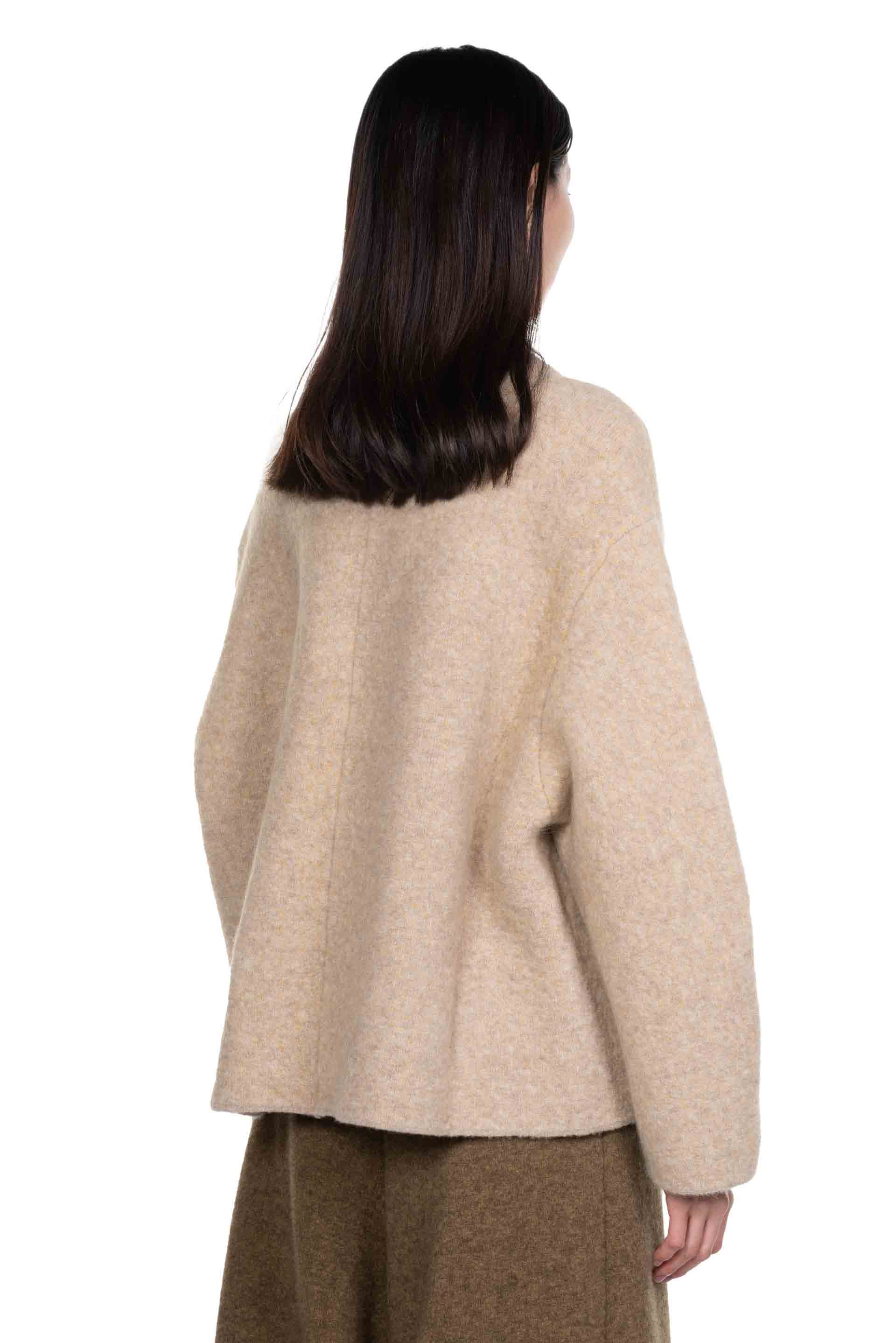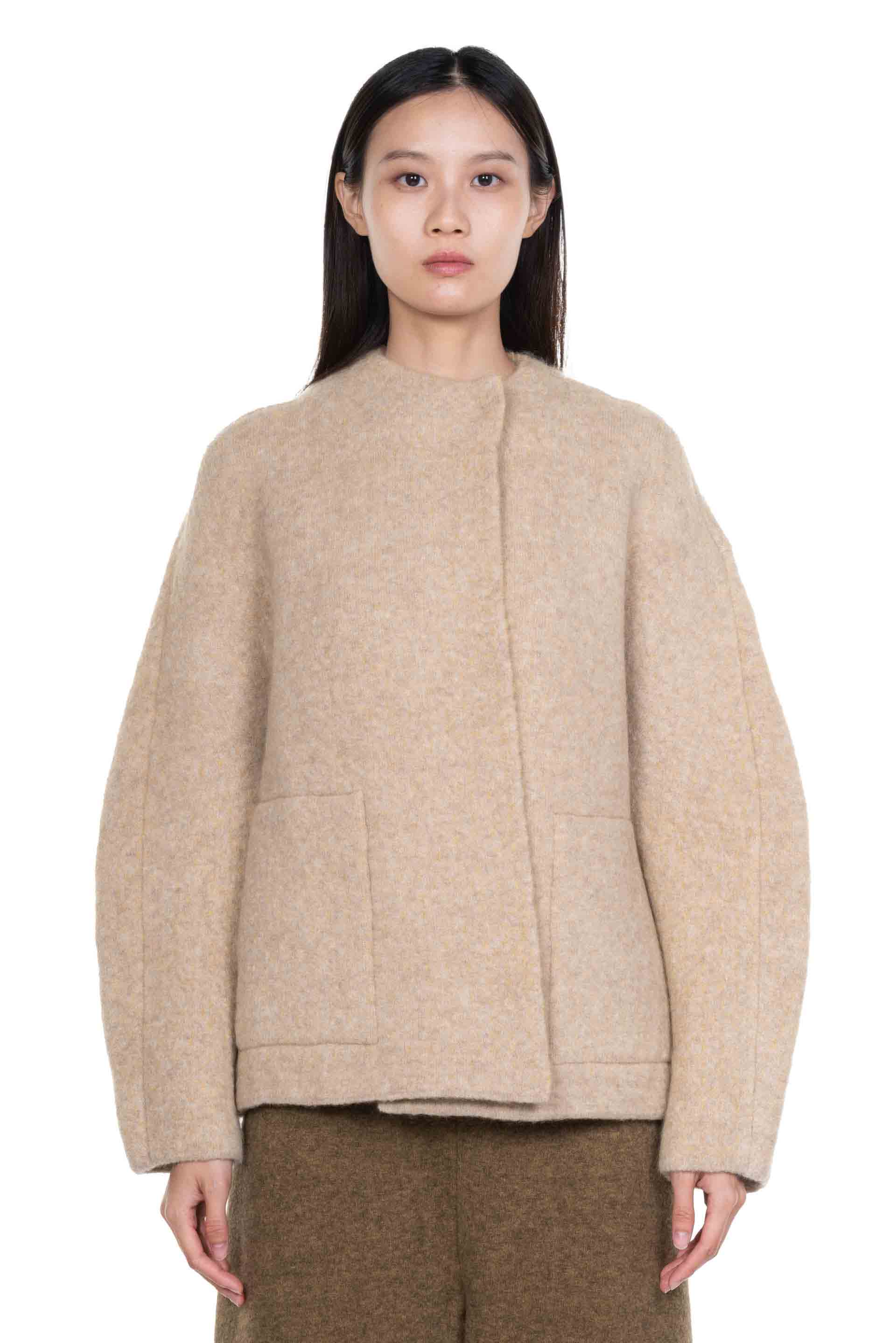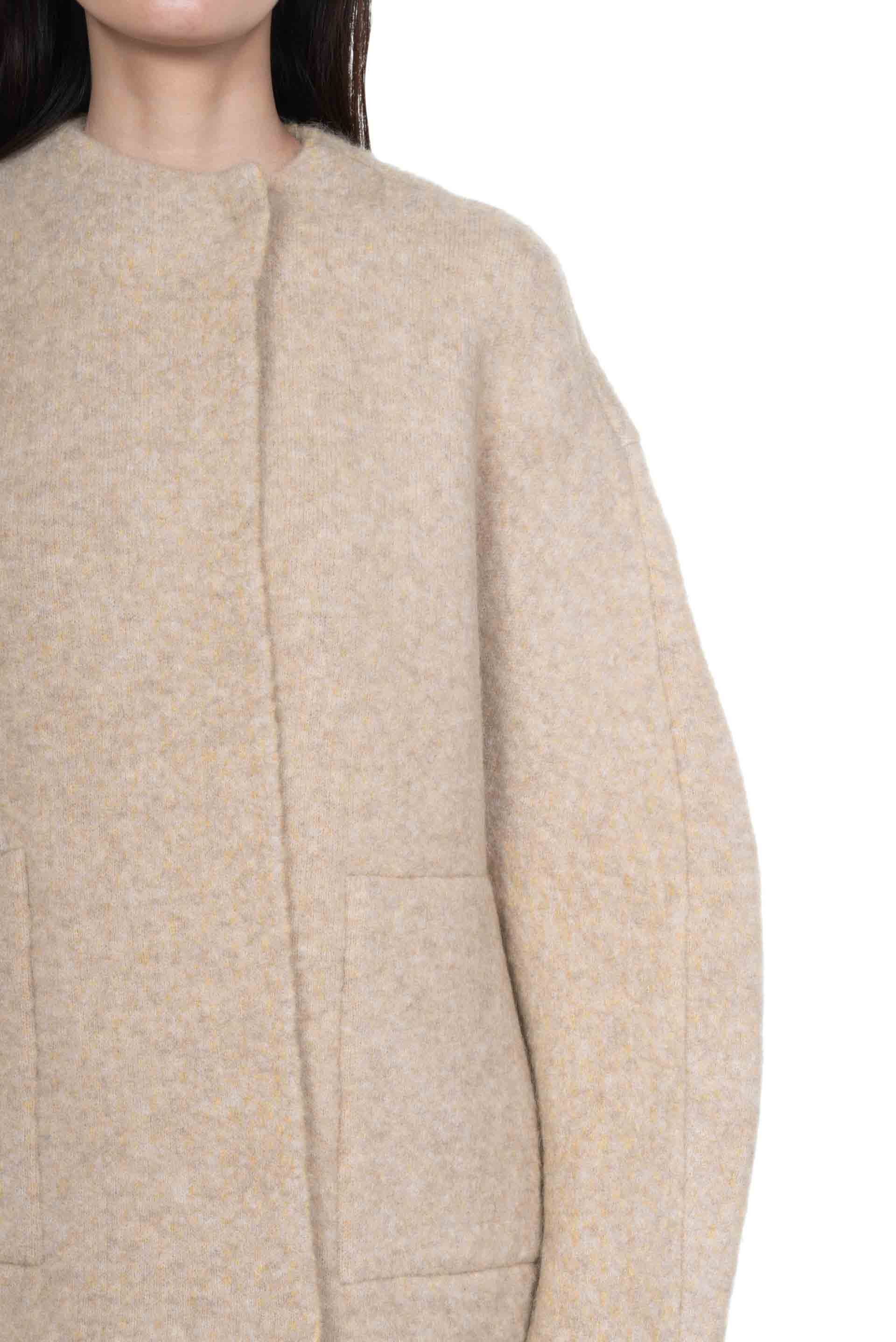 Round Neck Jacket from Boboutic. Round collar. Long sleeves. One pressure button closure at collar. Hidden button system. Two side pockets. Signature Yak mix. Soft textural fabric. Lightweight. Boxy fit.
