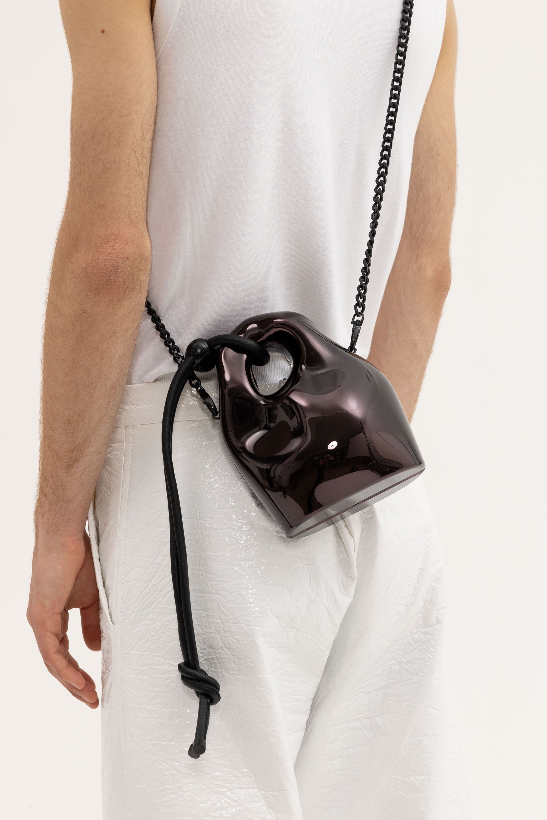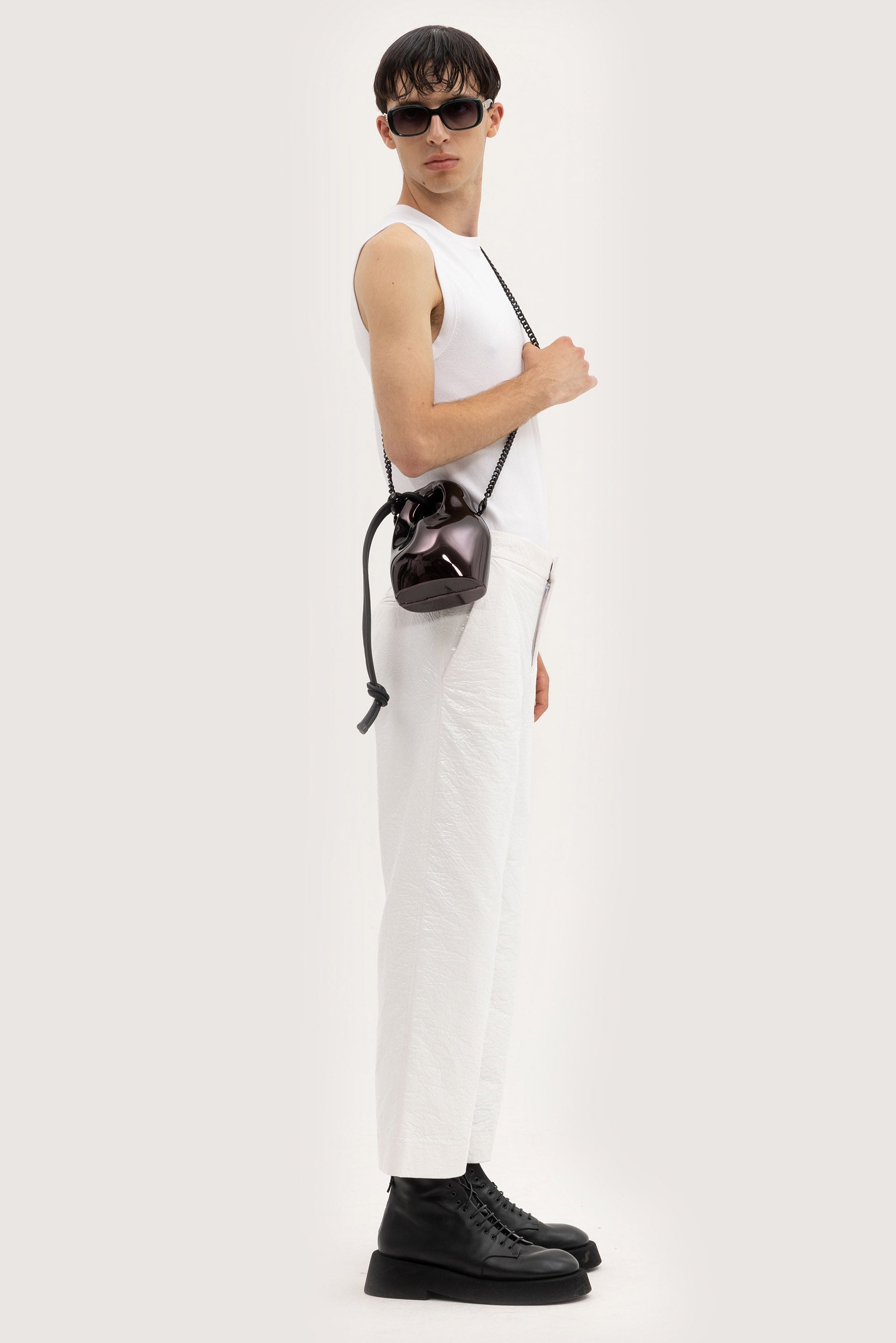 Stone shaped bag with adjustable double rope connector made out of Nappa leather. Soft flock finishing inside.