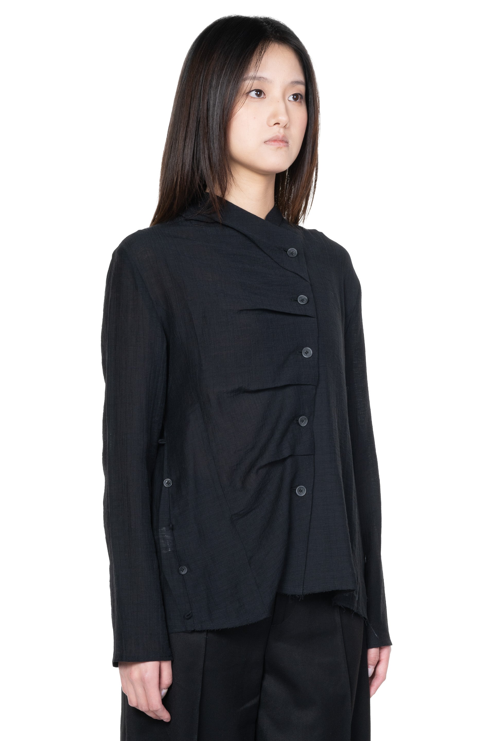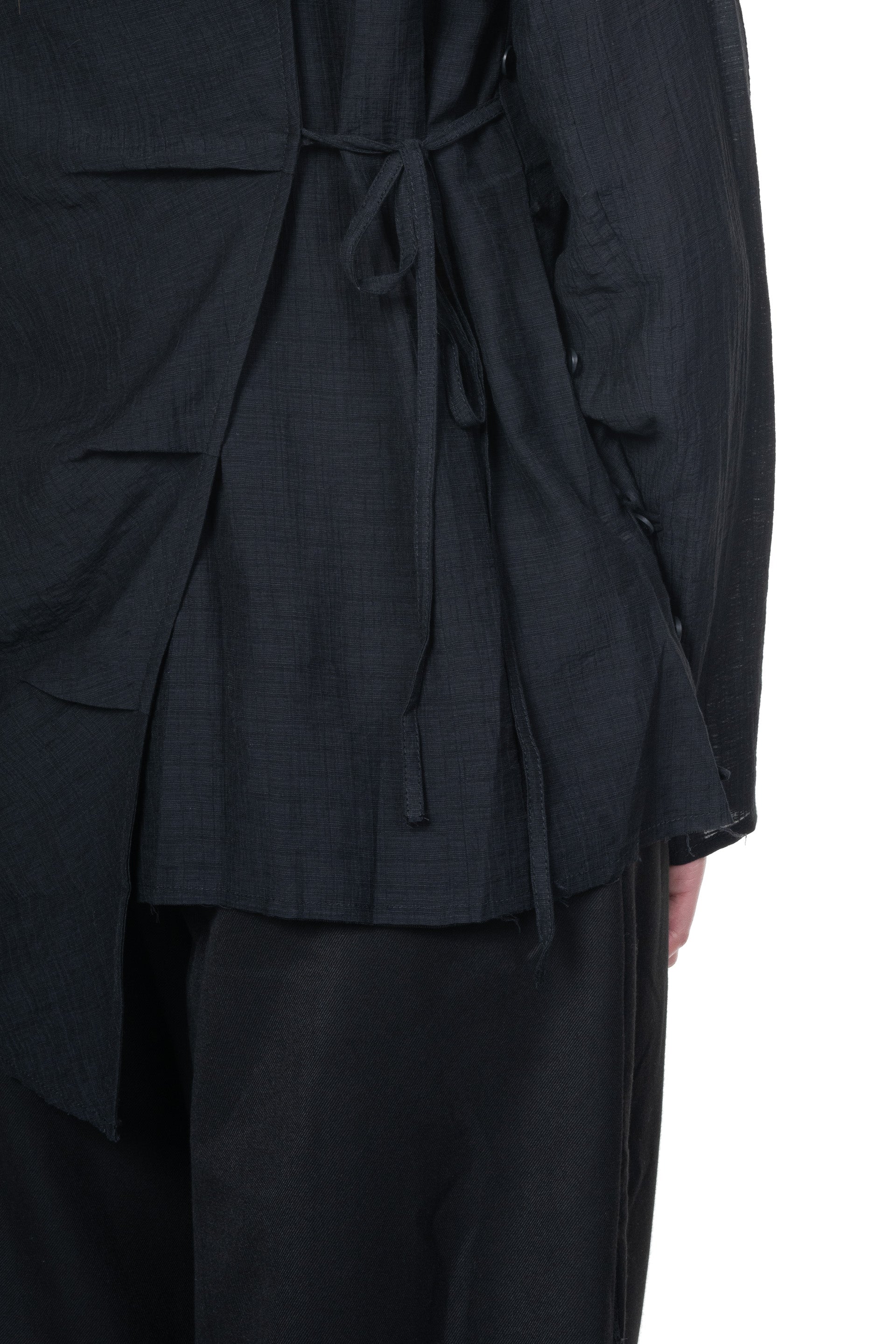 Professor. E understands the time of aesthetics from the use of cotton, hemp and wool. Fabric stitching, patching, designs without edge trimming, deconstruction, and reproduction are all Professor. E's signature elements creating classic immortal designs that can be viewed with the Ruffled Shirt Black.