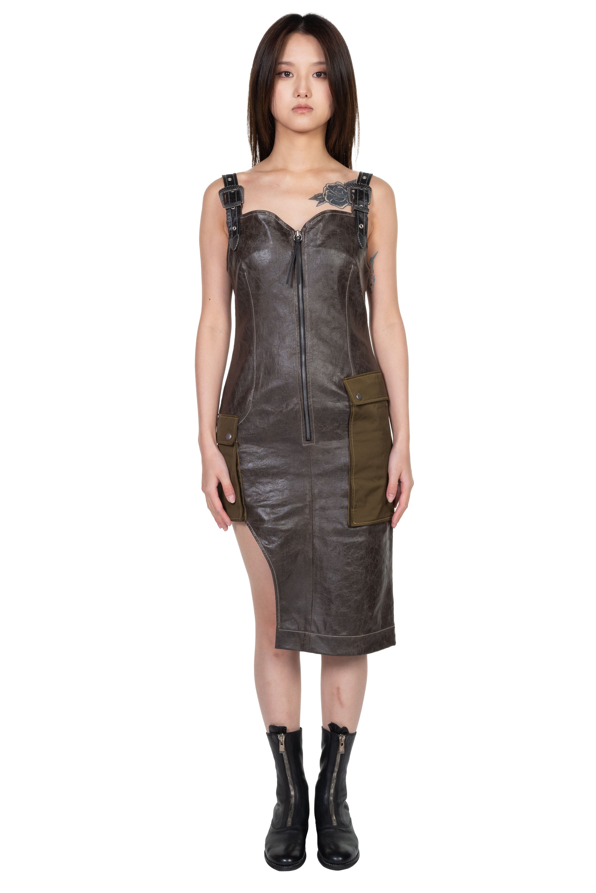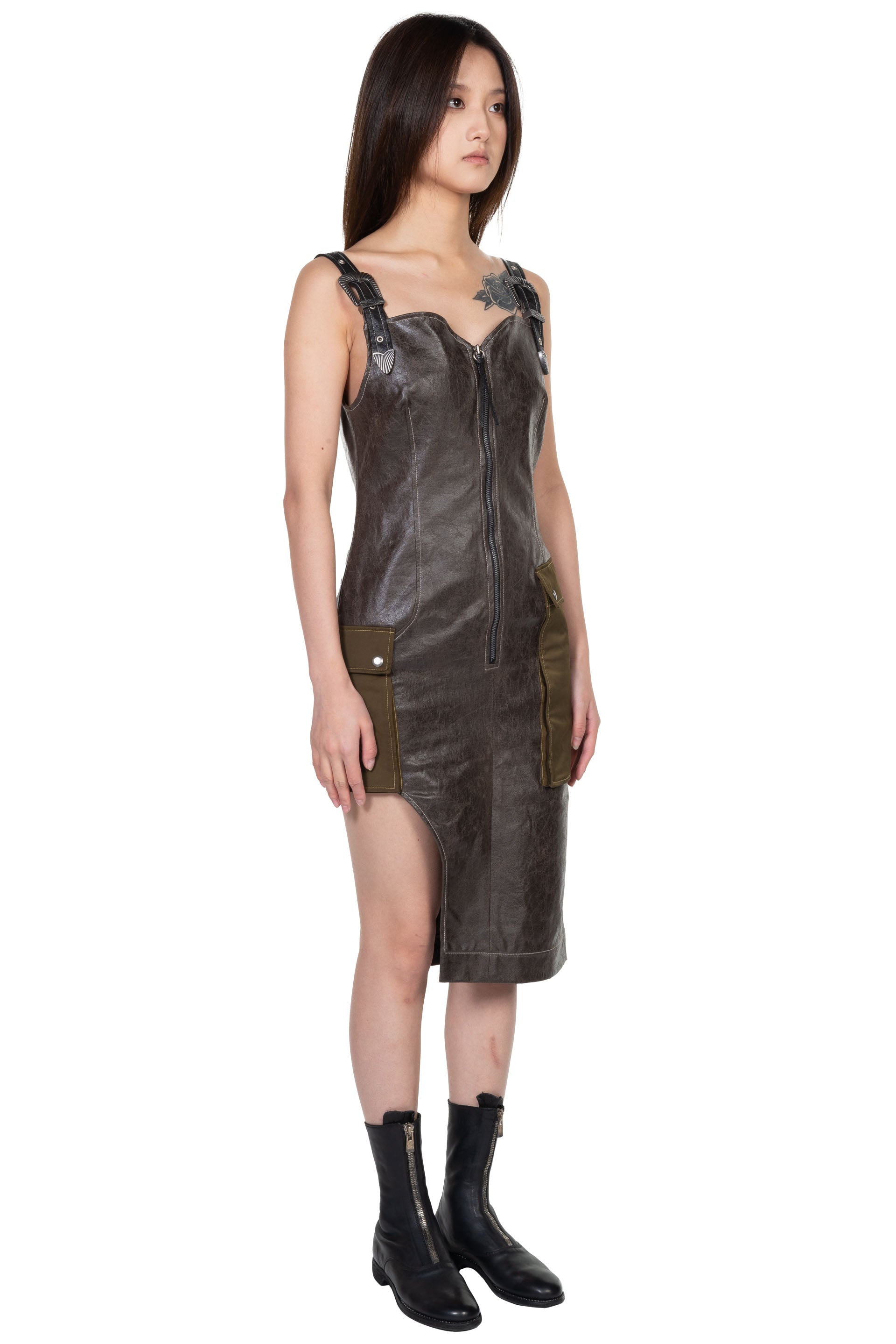 Western shoulder belted faux leather dress. Feminine bustier line. Asymmetric pockets. Cut out detail.