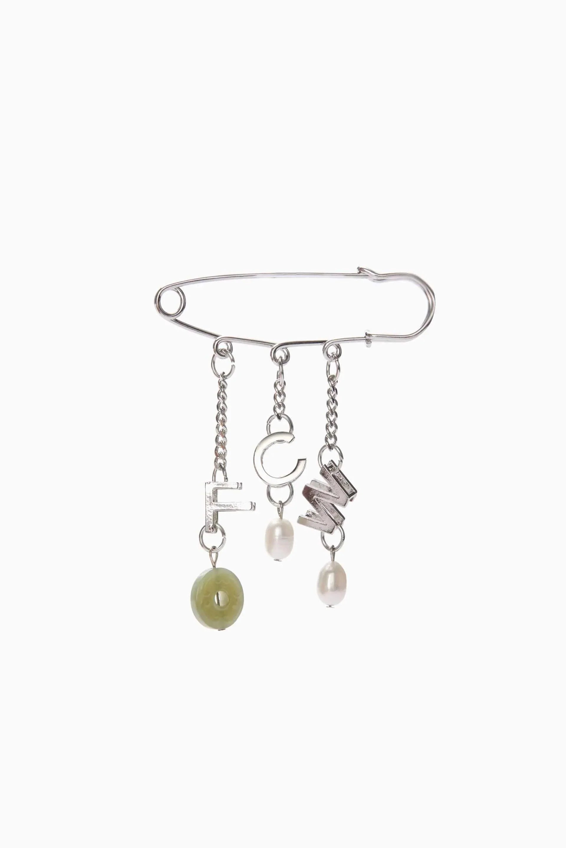 Feng Chen Wang safety pin broach with jade stones and logo letters in silver finish.