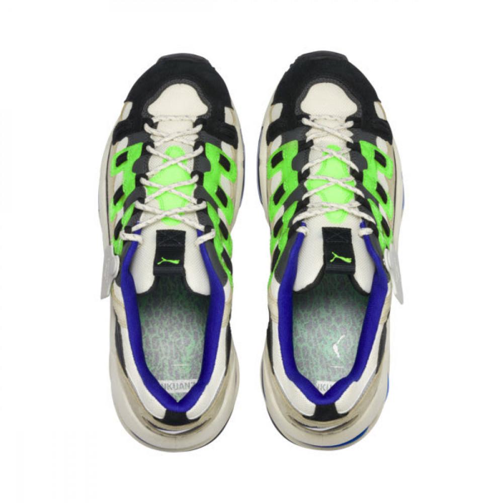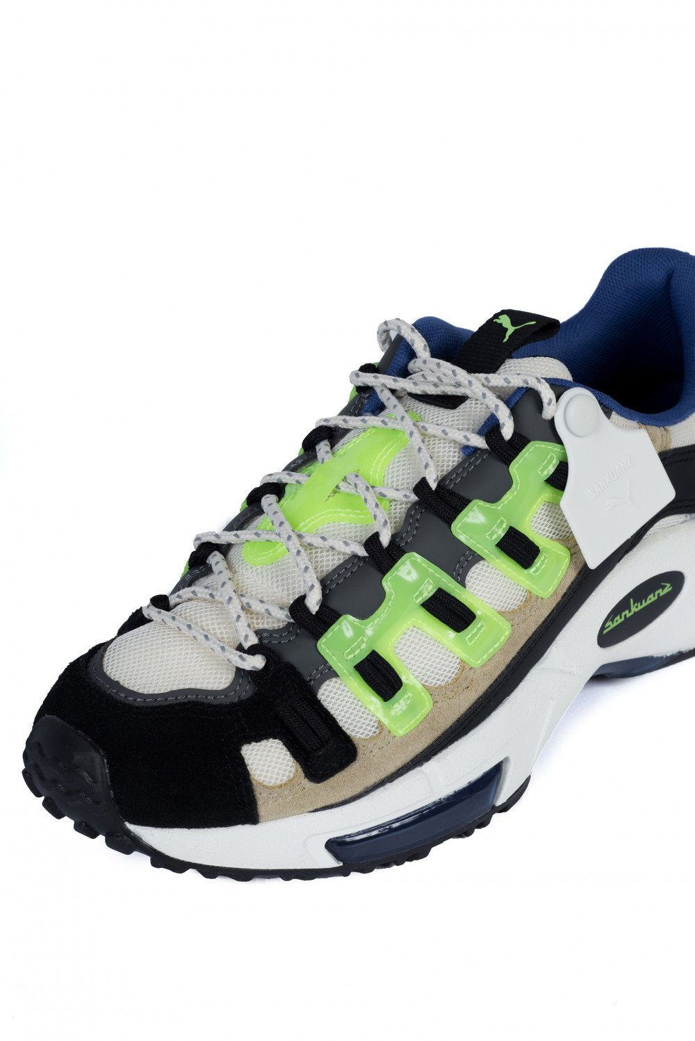Innovative designs take centre stage in the Sankuanz collection at UJNG. Experimental shapes and offbeat graphics create a flamboyant, boundary-pushing look. Find a vibrant colour palette and bold use of textures. Architectural pieces with unexpected embellishments enhance the eye-catching nature of this edit. SS19 sees Sankuanz team up with esteemed sportswear brand Puma, revamping their classic Cell Endura with a flashy futuristic vibe.