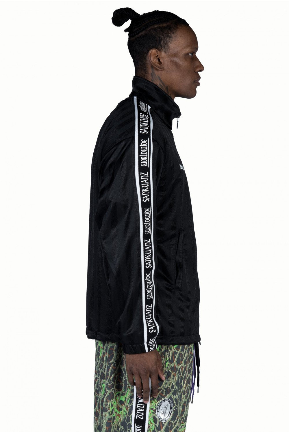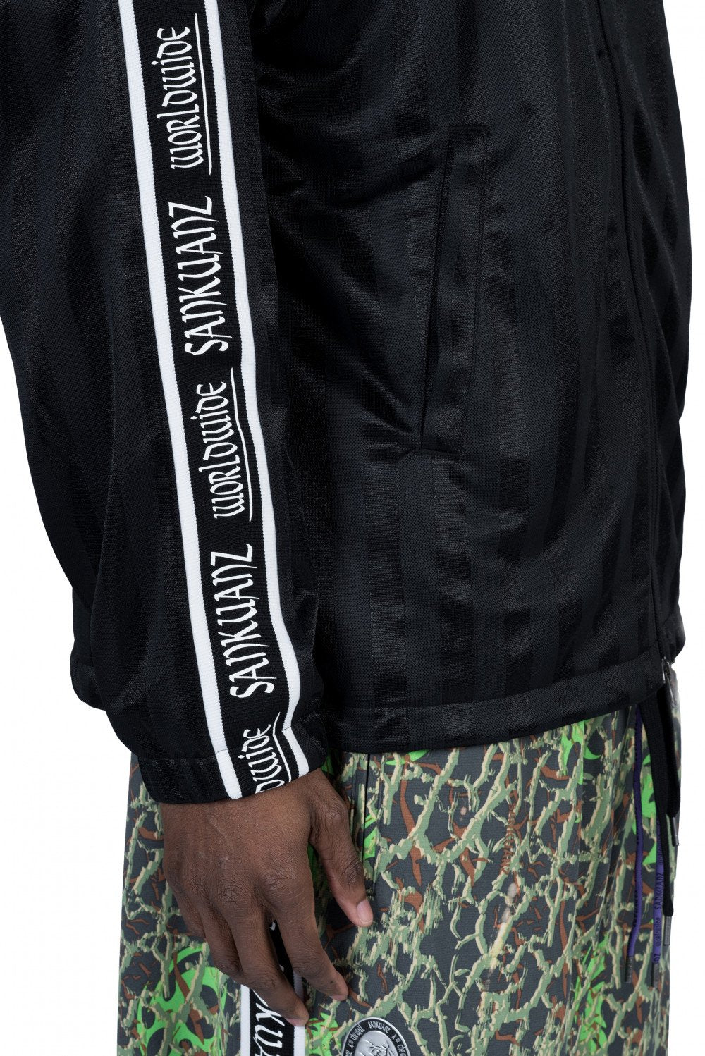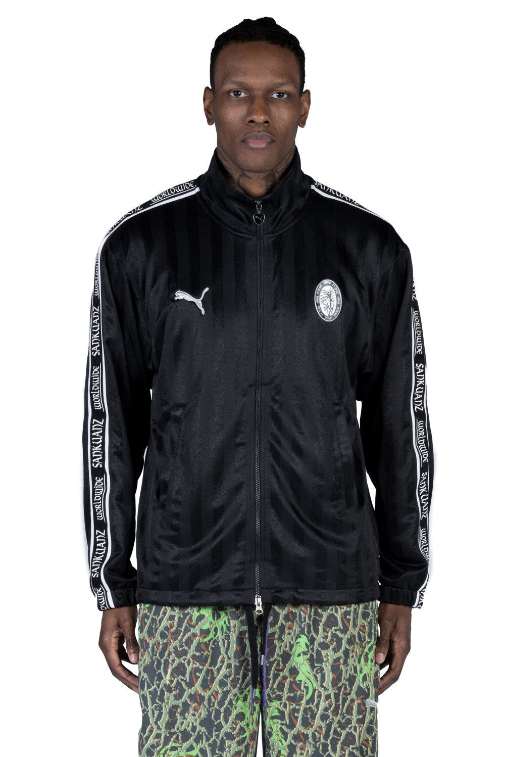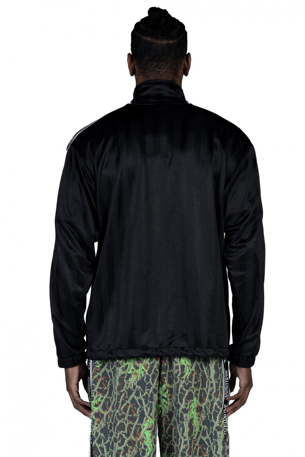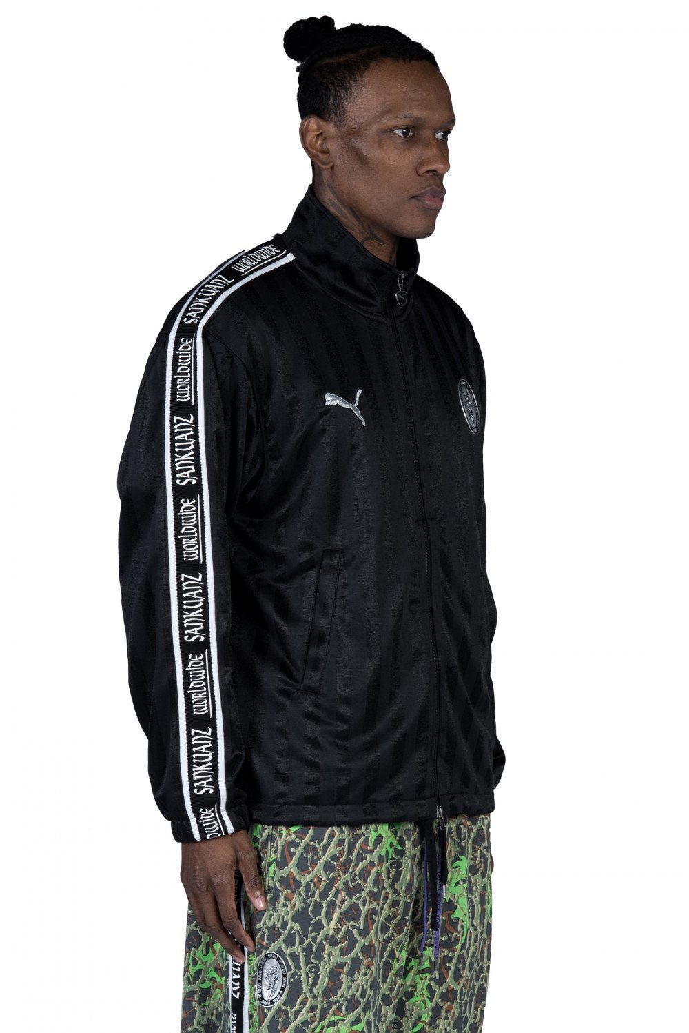 Innovative designs take centre stage in the Sankuanz collection at UJNG. Experimental shapes and offbeat graphics create a flamboyant, boundary-pushing look. Find a vibrant colour palette and bold use of textures. Architectural pieces with unexpected embellishments enhance the eye-catching nature of this edit. SS19 sees Sankuanz team up with esteemed sportswear brand Puma, reworking their retro track top with pops of purple and shows off vertical stripes integrated into its retro jacquard construction.