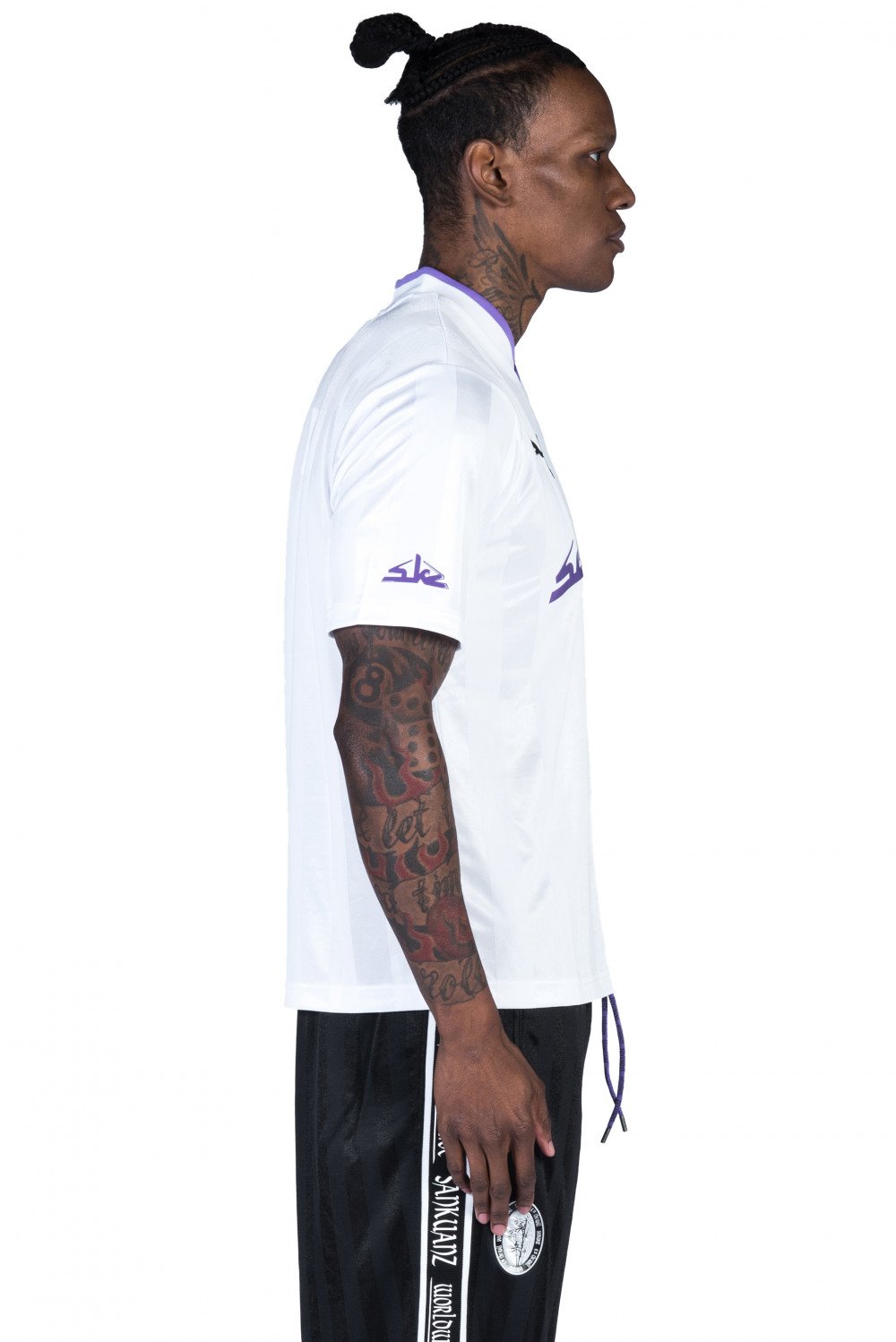 Innovative designs take centre stage in the Sankuanz collection at UJNG. Experimental shapes and offbeat graphics create a flamboyant, boundary-pushing look. Find a vibrant colour palette and bold use of textures. Architectural pieces with unexpected embellishments enhance the eye-catching nature of this edit. SS19 sees Sankuanz team up with esteemed sportswear brand Puma, reworking their retro t-shirt with pops of purple and shows off vertical stripes integrated into its retro jacquard construction.