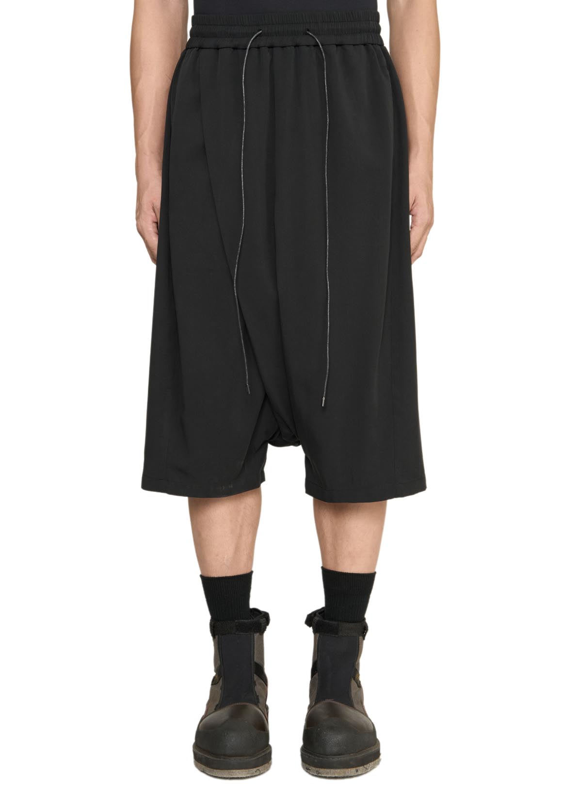 Elastic waist. Two side pockets. Low crotch. Drawstring at waist. Asymmetric details at front.
