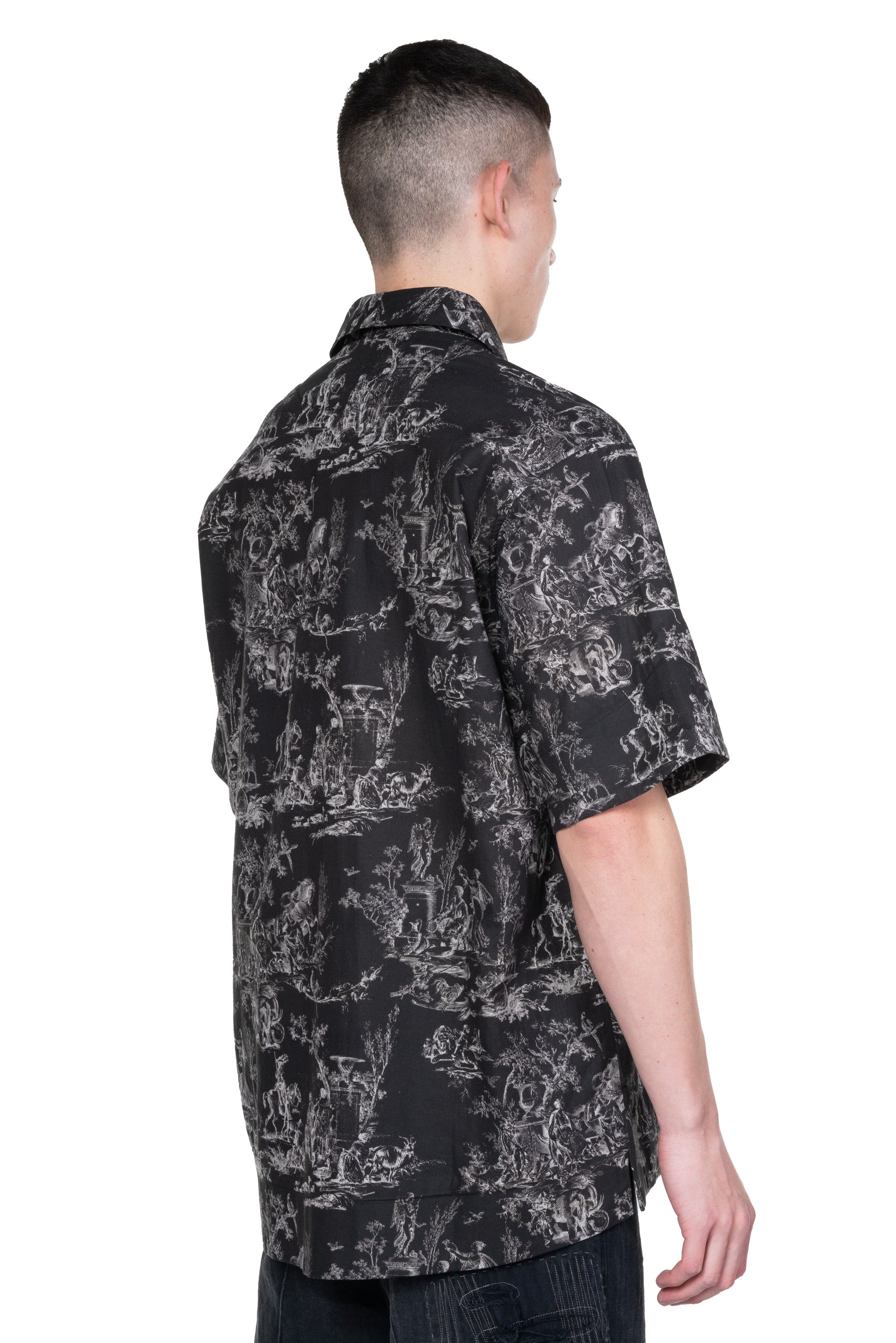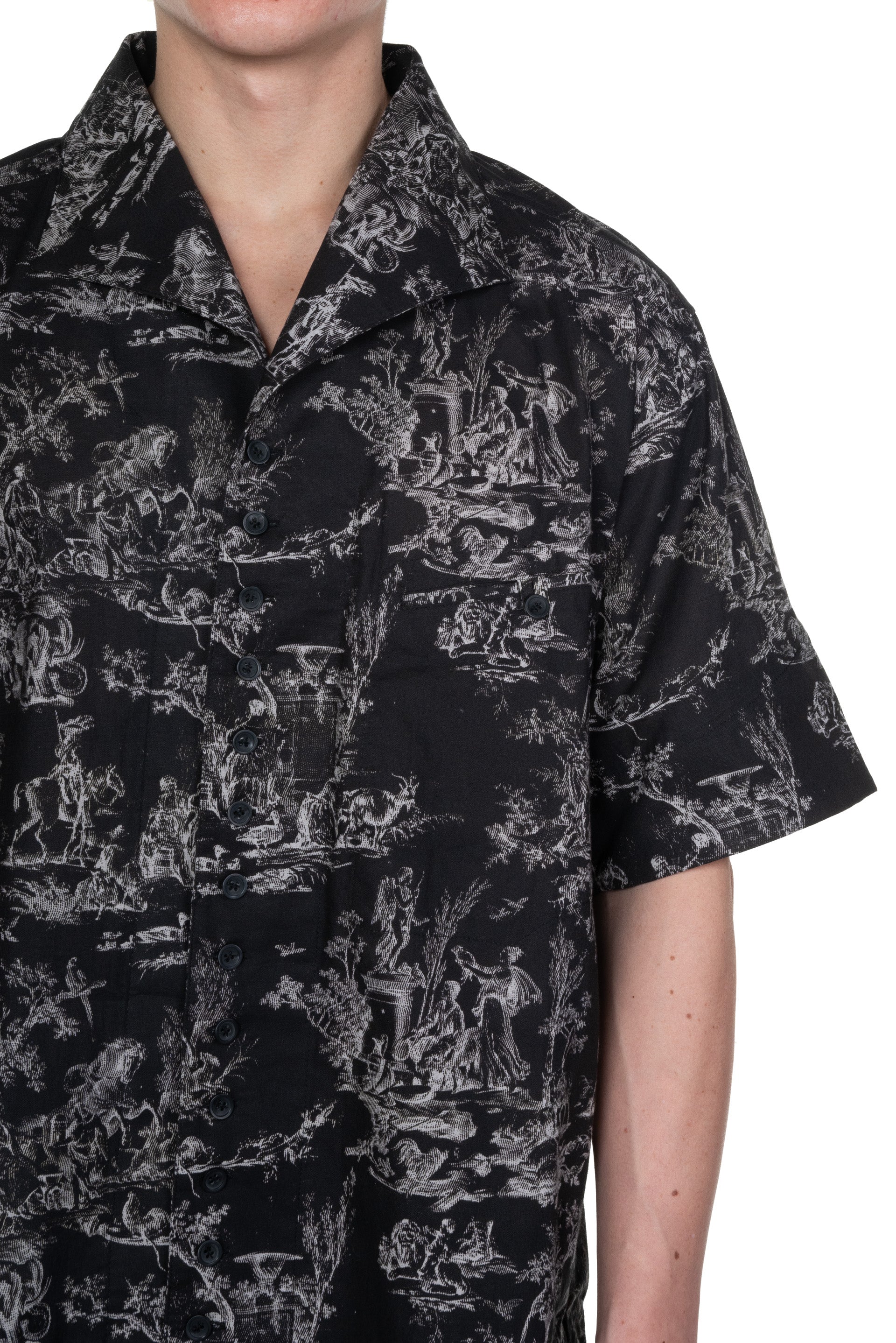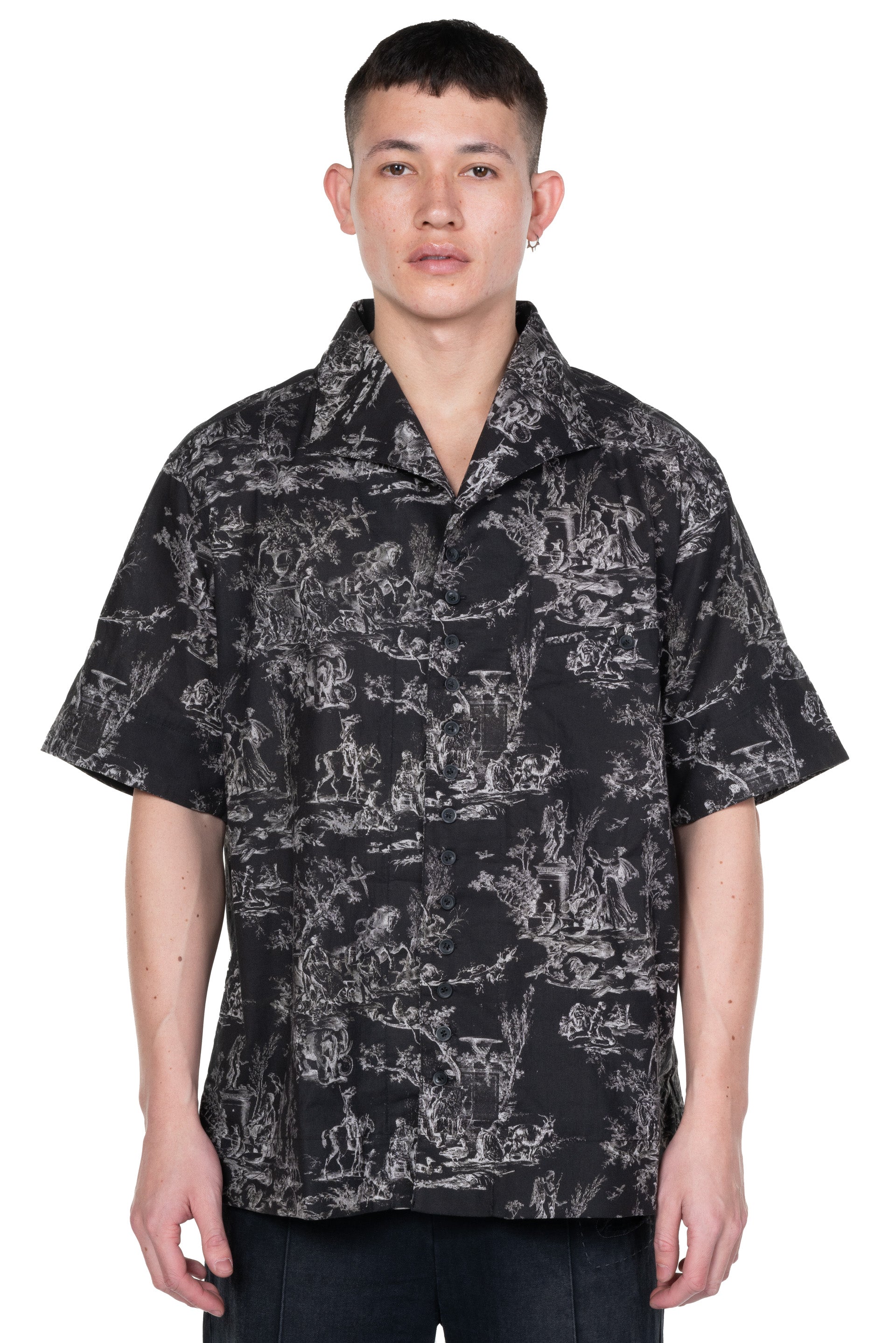 Professor. E Seasonal SS Shirt Black Short. sleeves. Button closure at front. Open collar. Seasonal print throughout. Boxy cut. Pocket at chest.
