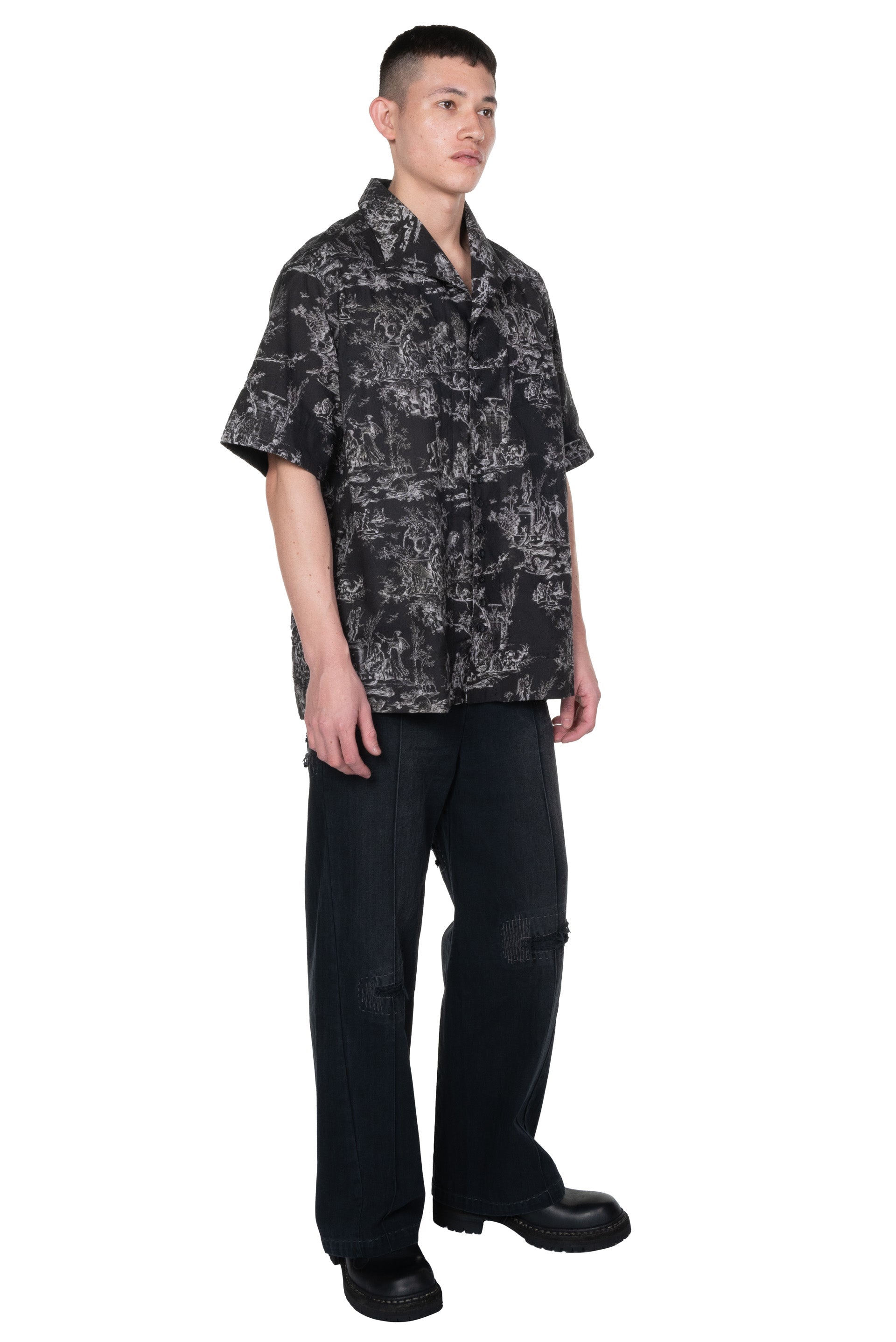 Professor. E understands the time of aesthetics from the use of cotton, hemp and wool. Fabric stitching, patching, designs without edge trimming, deconstruction, and reproduction are all Professor. E's signature elements creating classic immortal designs that can be viewed with the Seasonal SS Shirt Black.