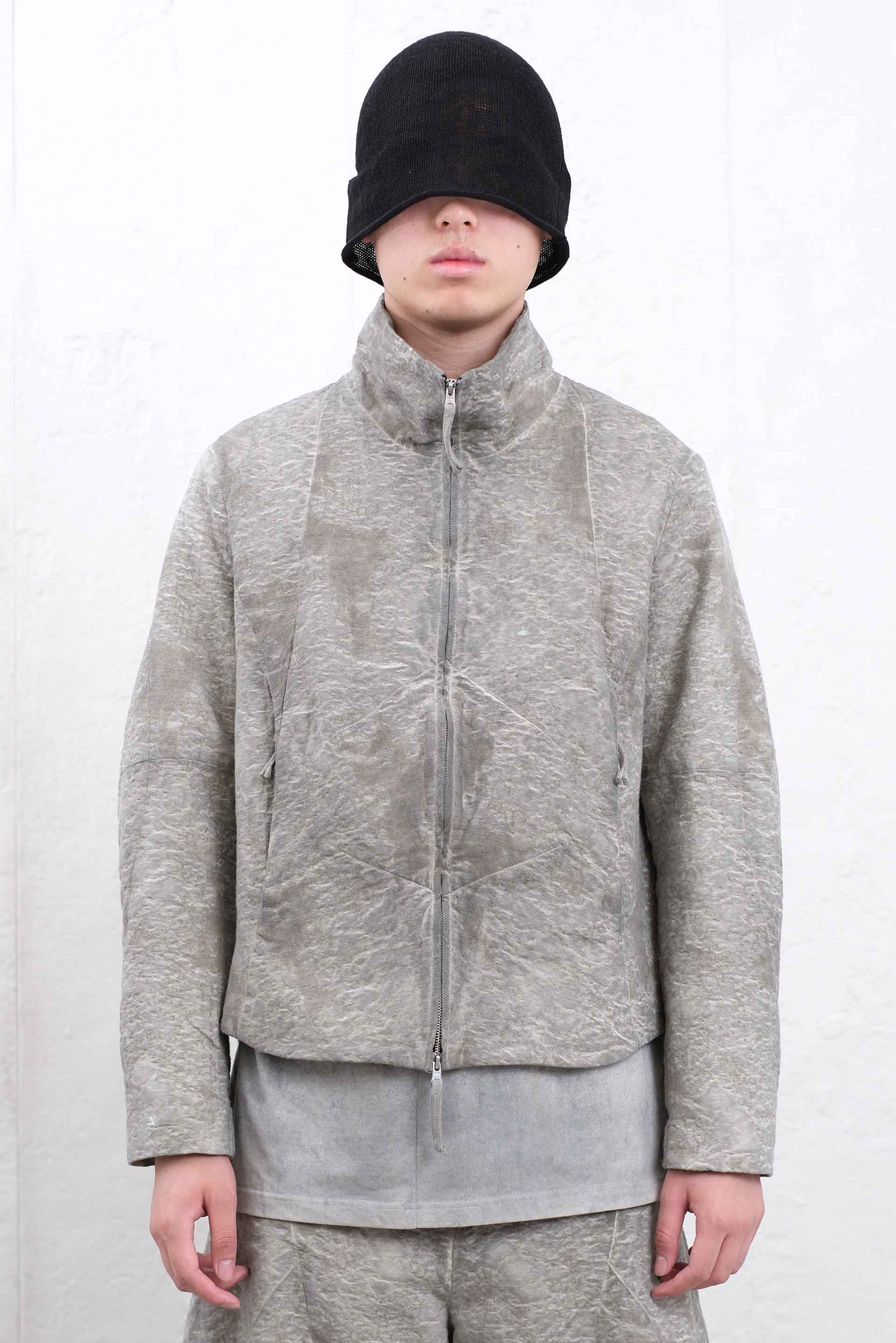 Attempt Project 11 Shaped Sleeve Collarless Jacket. Long sleeves. Double zip closure at front. Two side pockets. Cropped fit. Soft textural Jacquard fabric dyed in Grey.