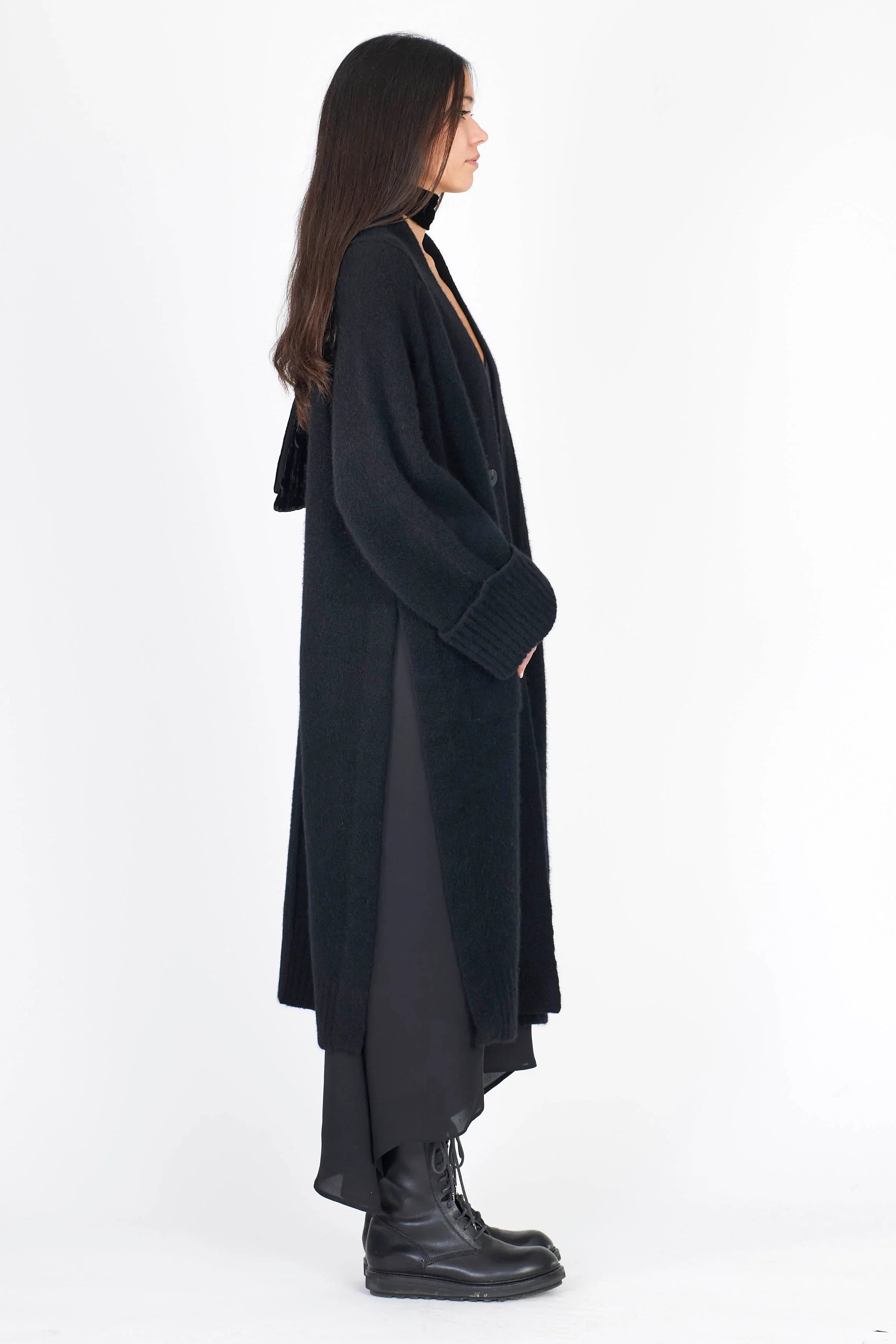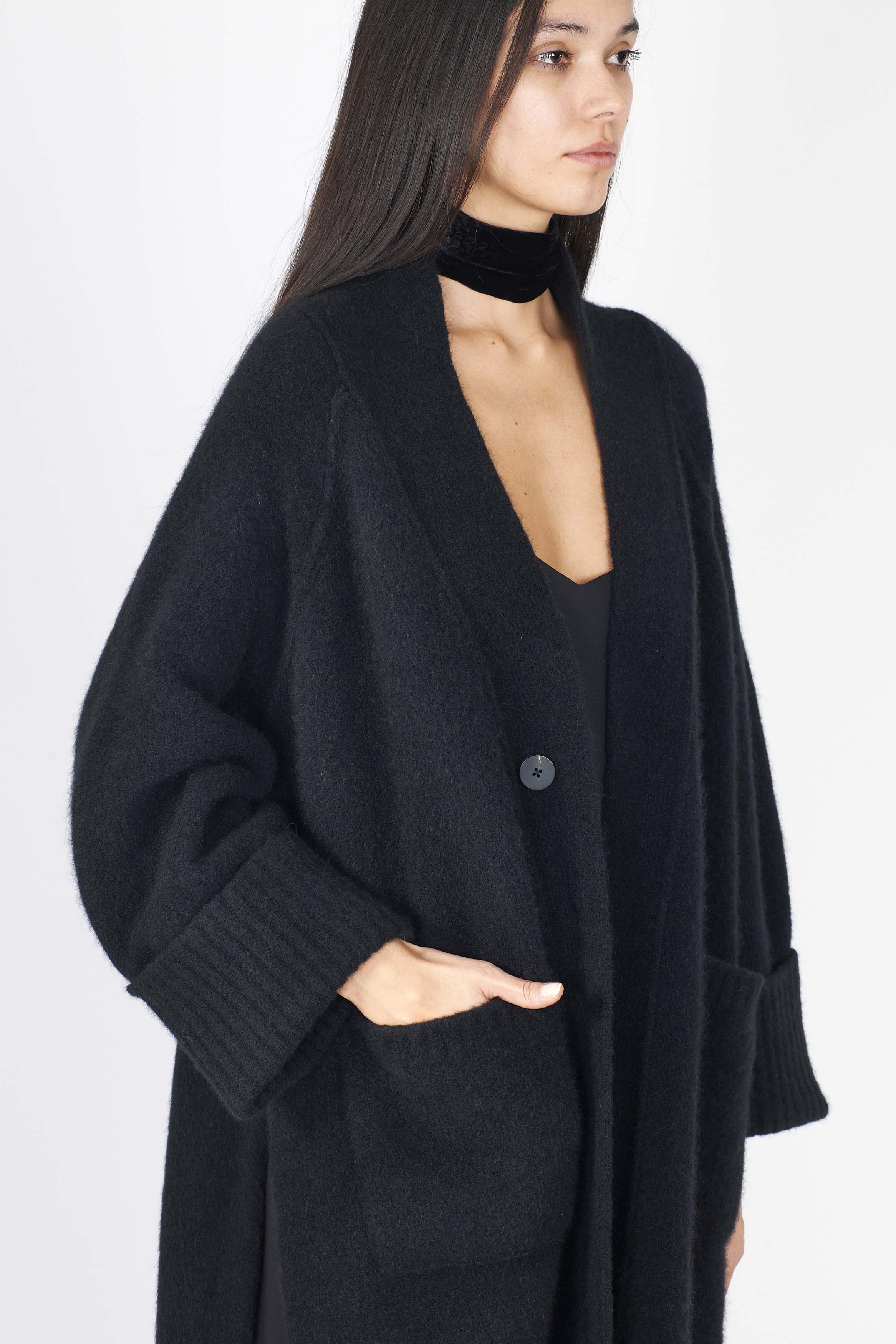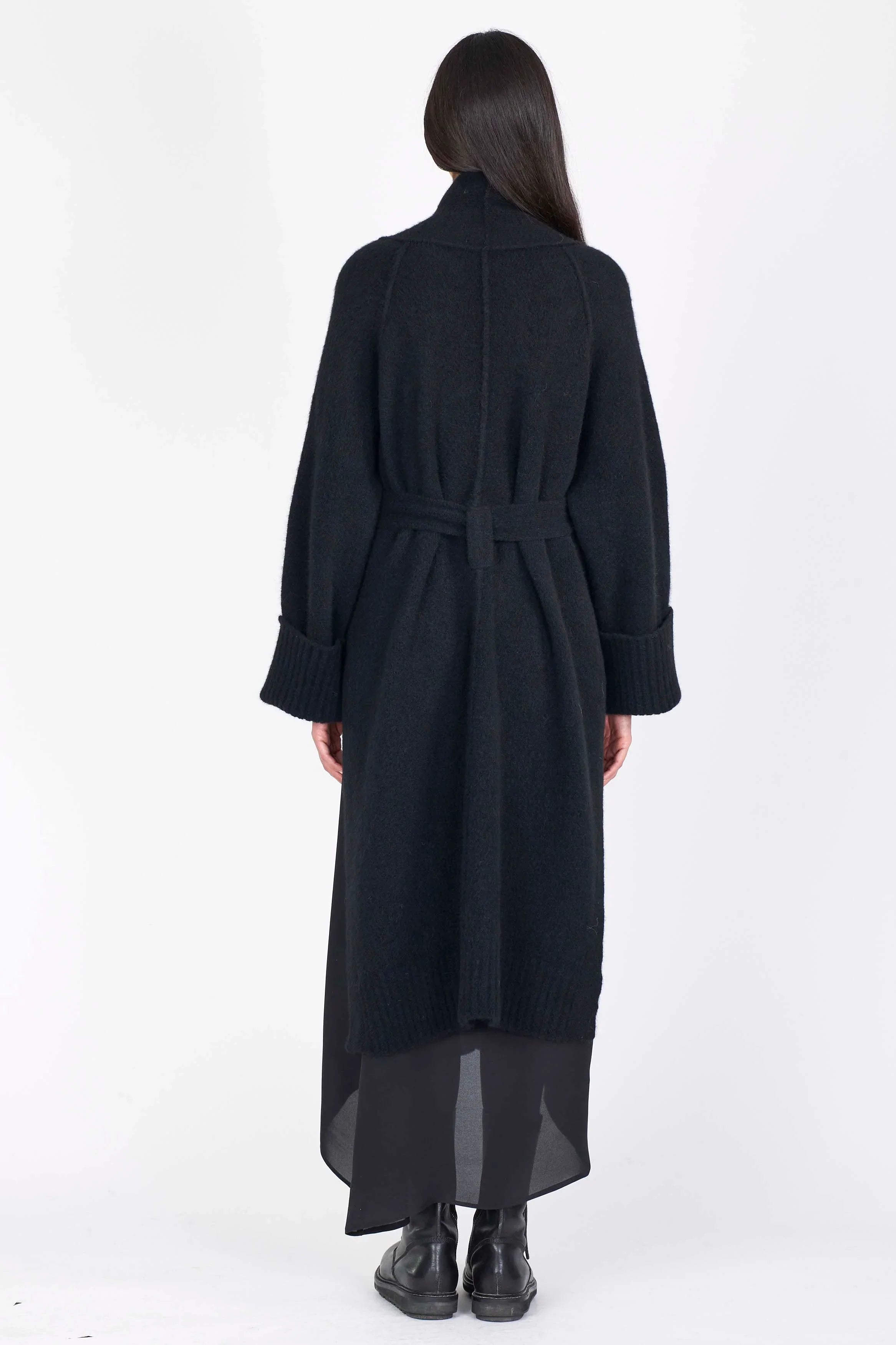 Yak long coat. One button closure. Belt around waist. Deep splits and pockets. Regular fit.Colour: Black. Composition:54% Wool 22% Yak 19% Nylon 5% Elastane