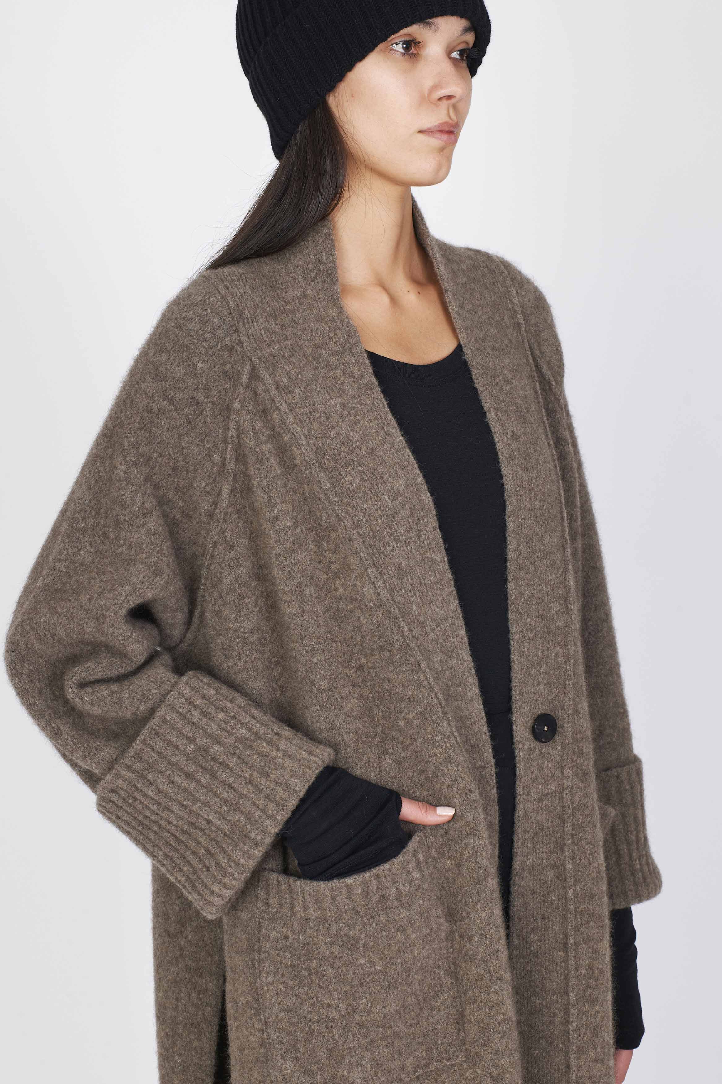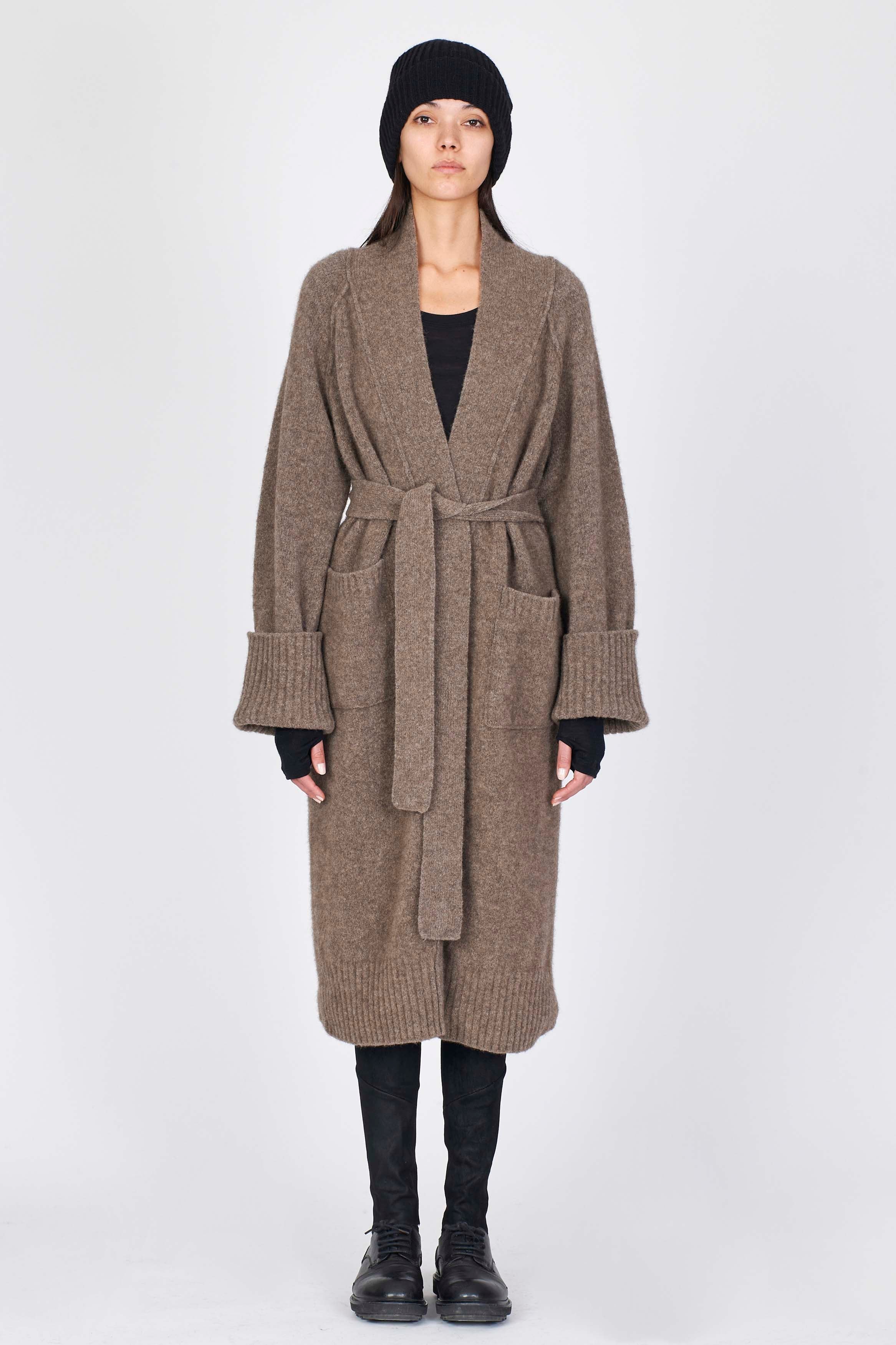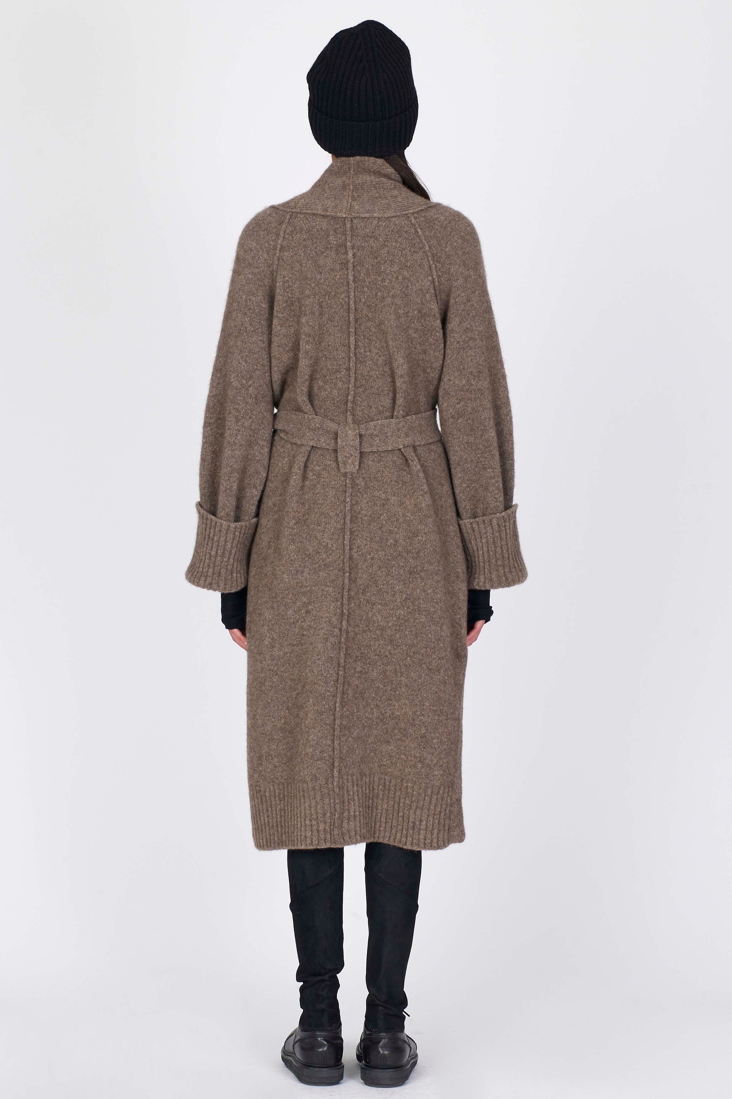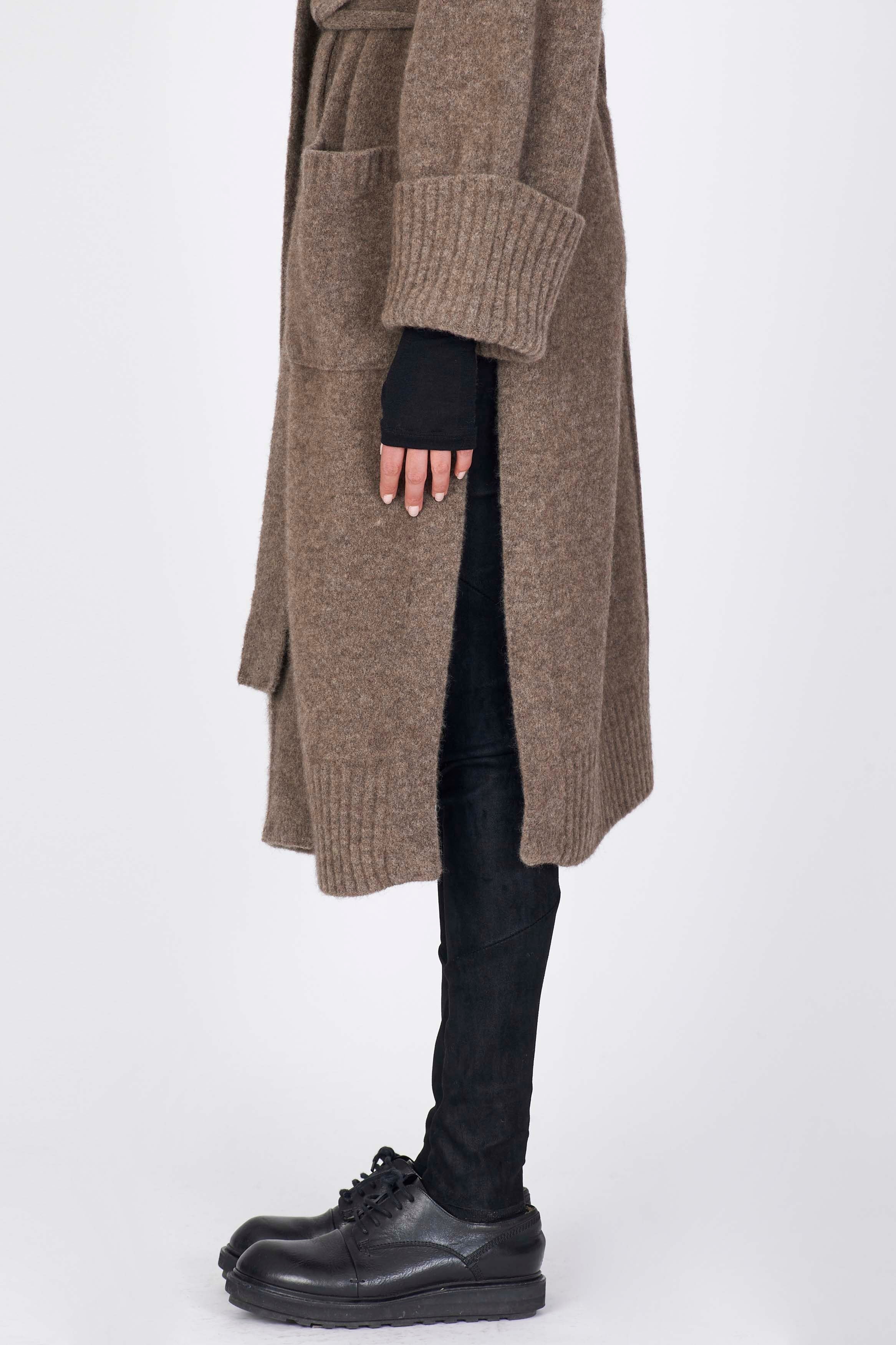 Yak long coat. One button closure. Belt around waist. Deep splits and pockets. Regular fit.