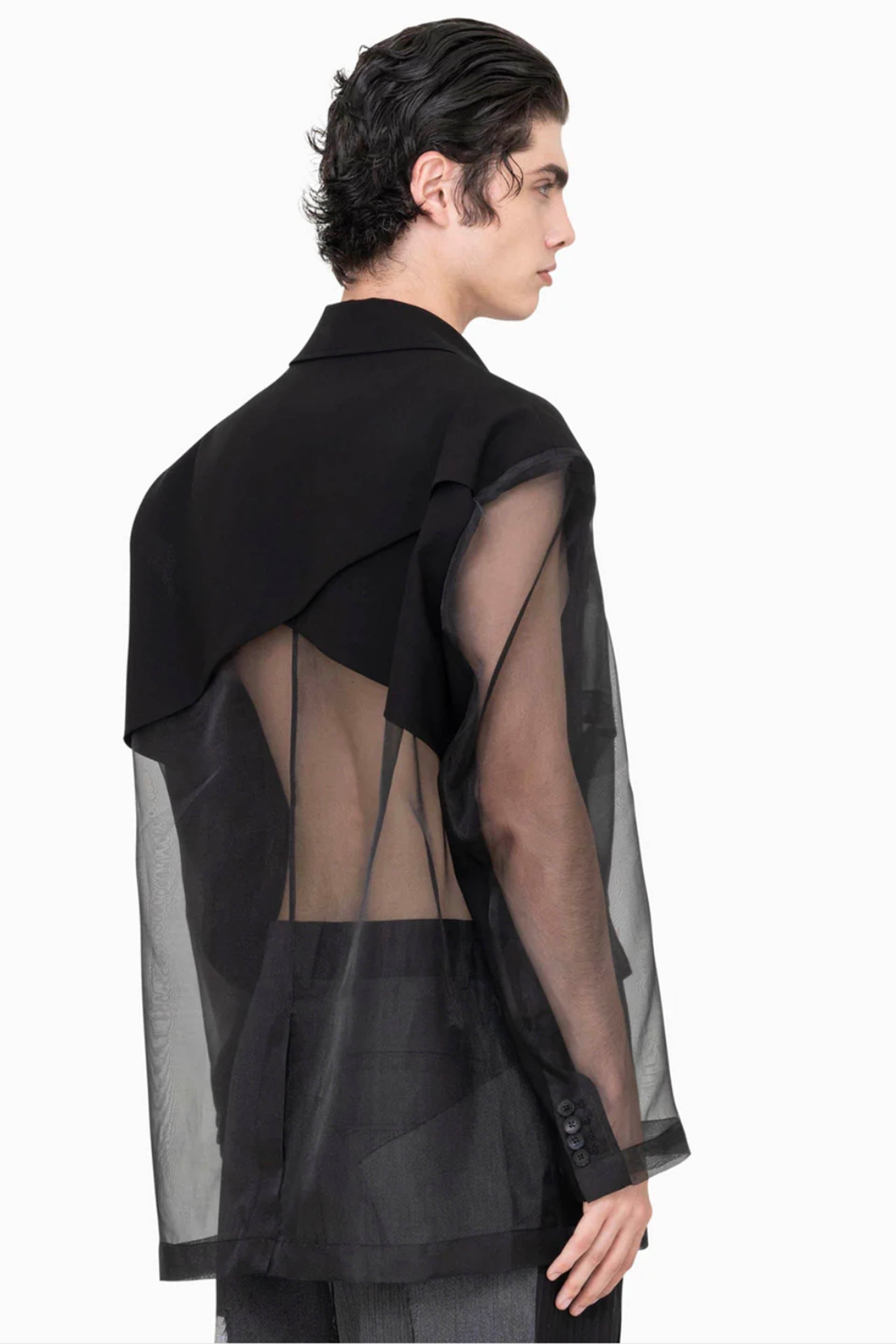 Sheer deconstructed blazer. Structured and padded shoulders. Boxy silhouette. Panel satin pockets. Sharp lapels. Button closure.Colour: Black. Composition: Poly Sheer