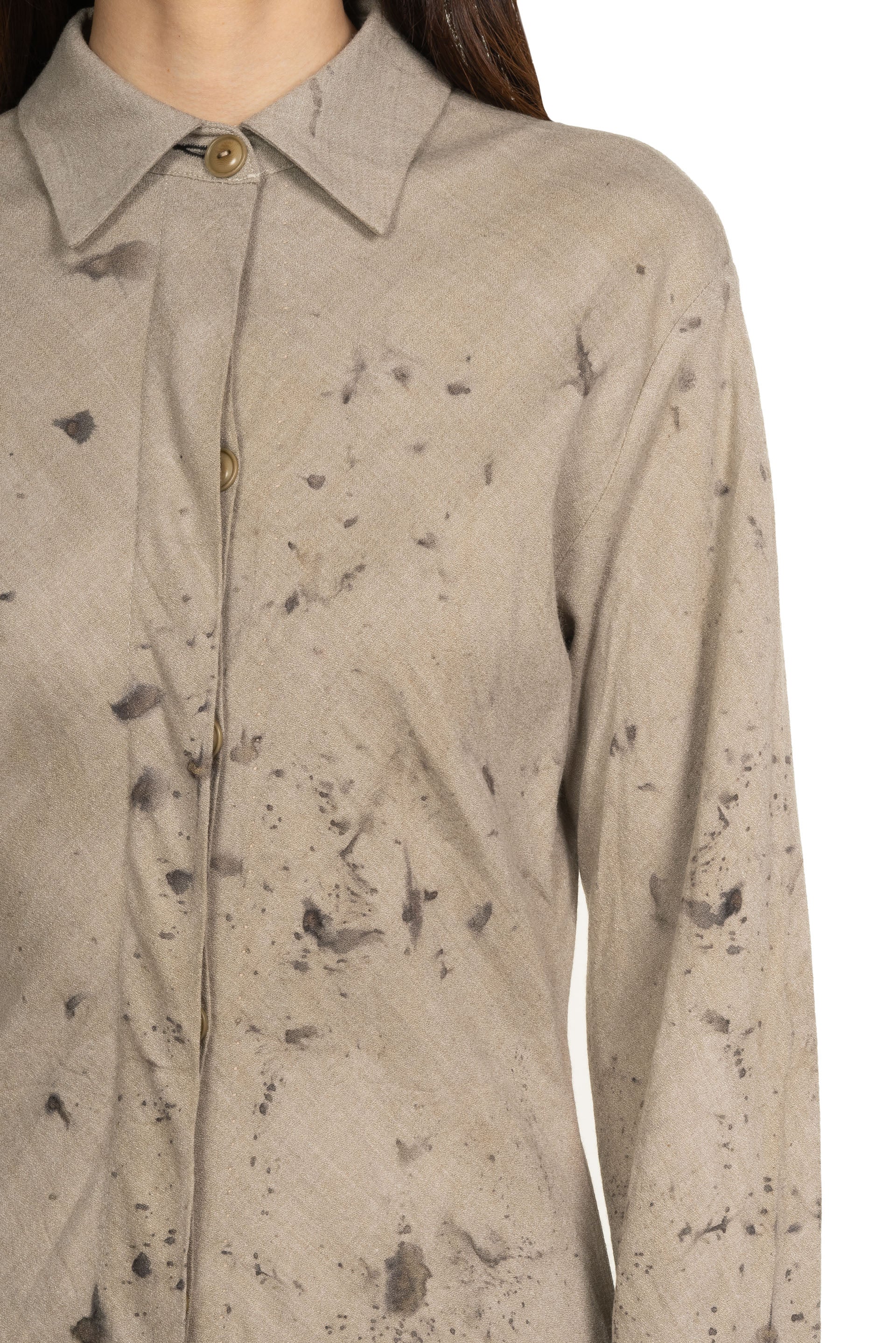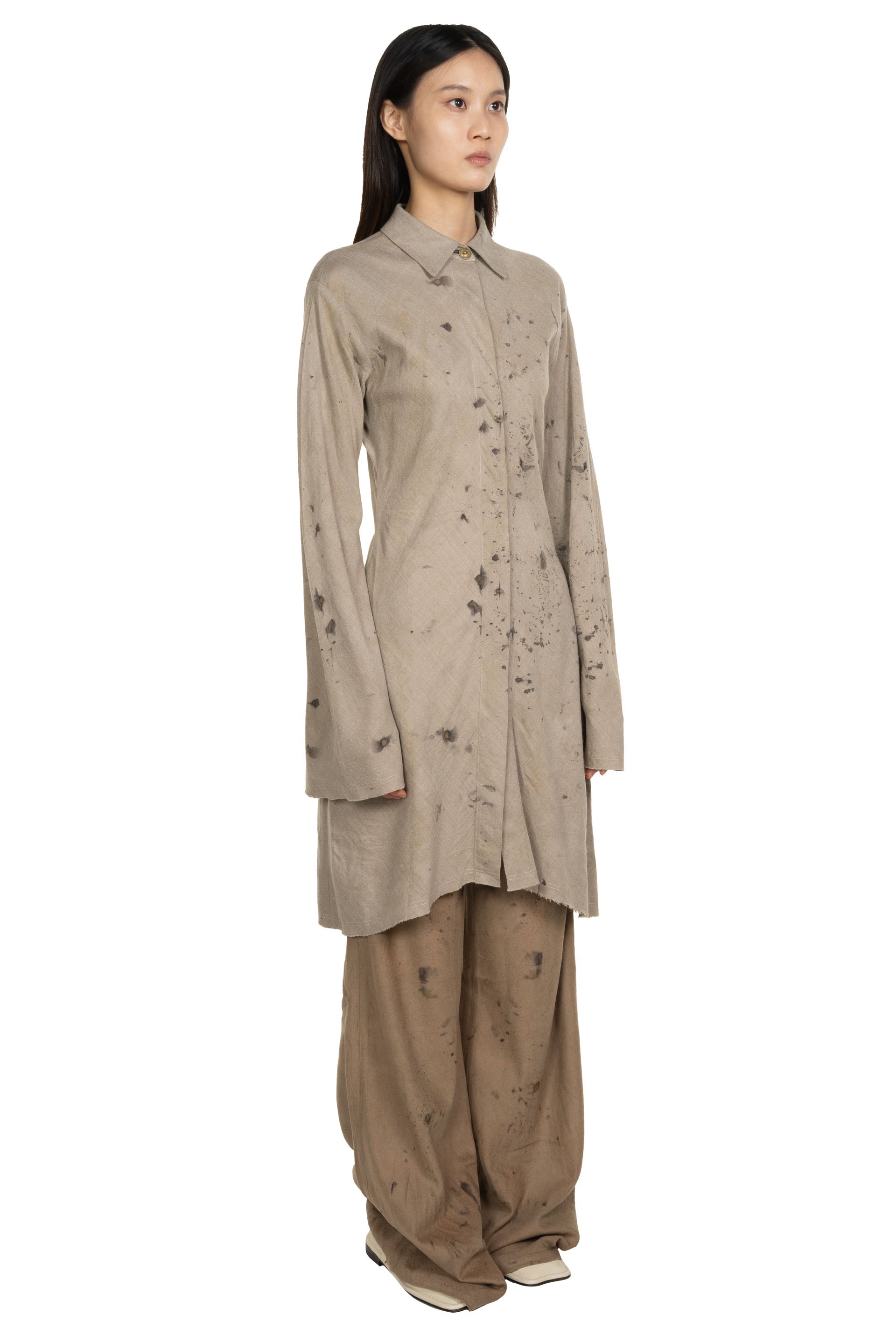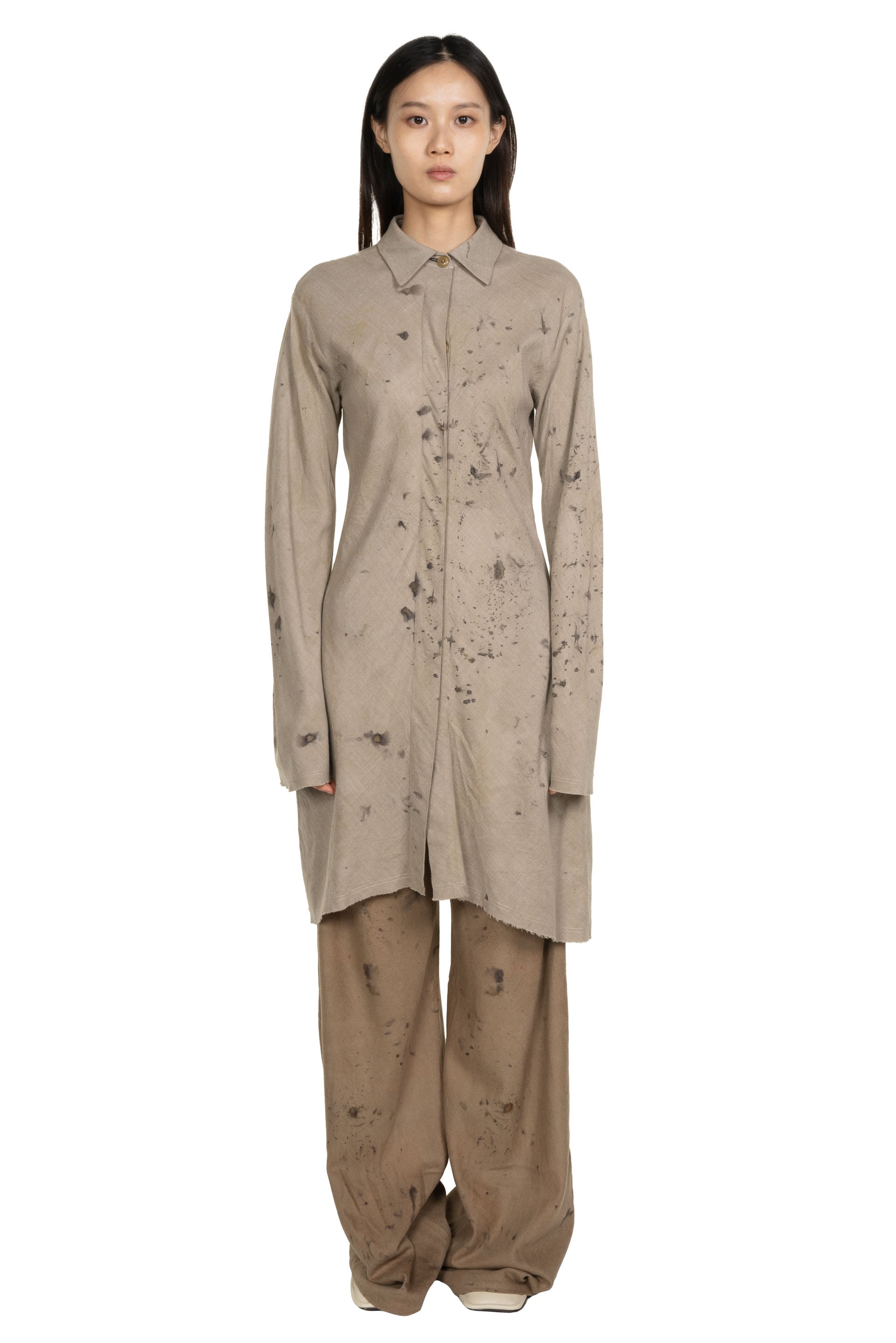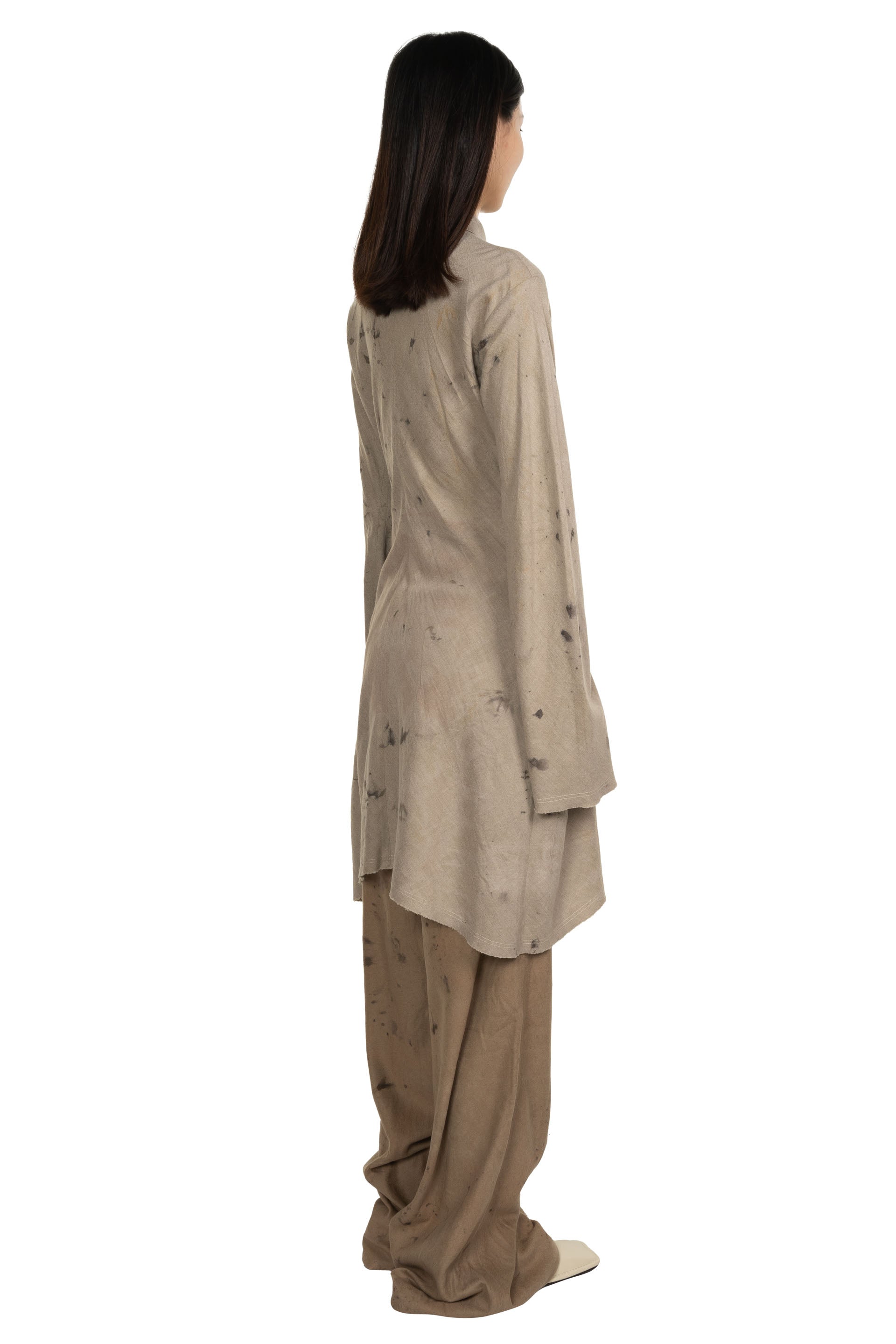 Yu Qun believes that everyone's character is multi-faceted and expressing spiritual independence. Fine hand-stitched threads, old mottled colours and patterns, and unconventional cuts are what Mute Dance has been exploring. The leaves and stems of fresh plants and berries, dried medicinal materials, old metals and so on are combined with the ancient and traditional dyeing technology to dye fabrics and paper as seen with the Shirt Celadon.