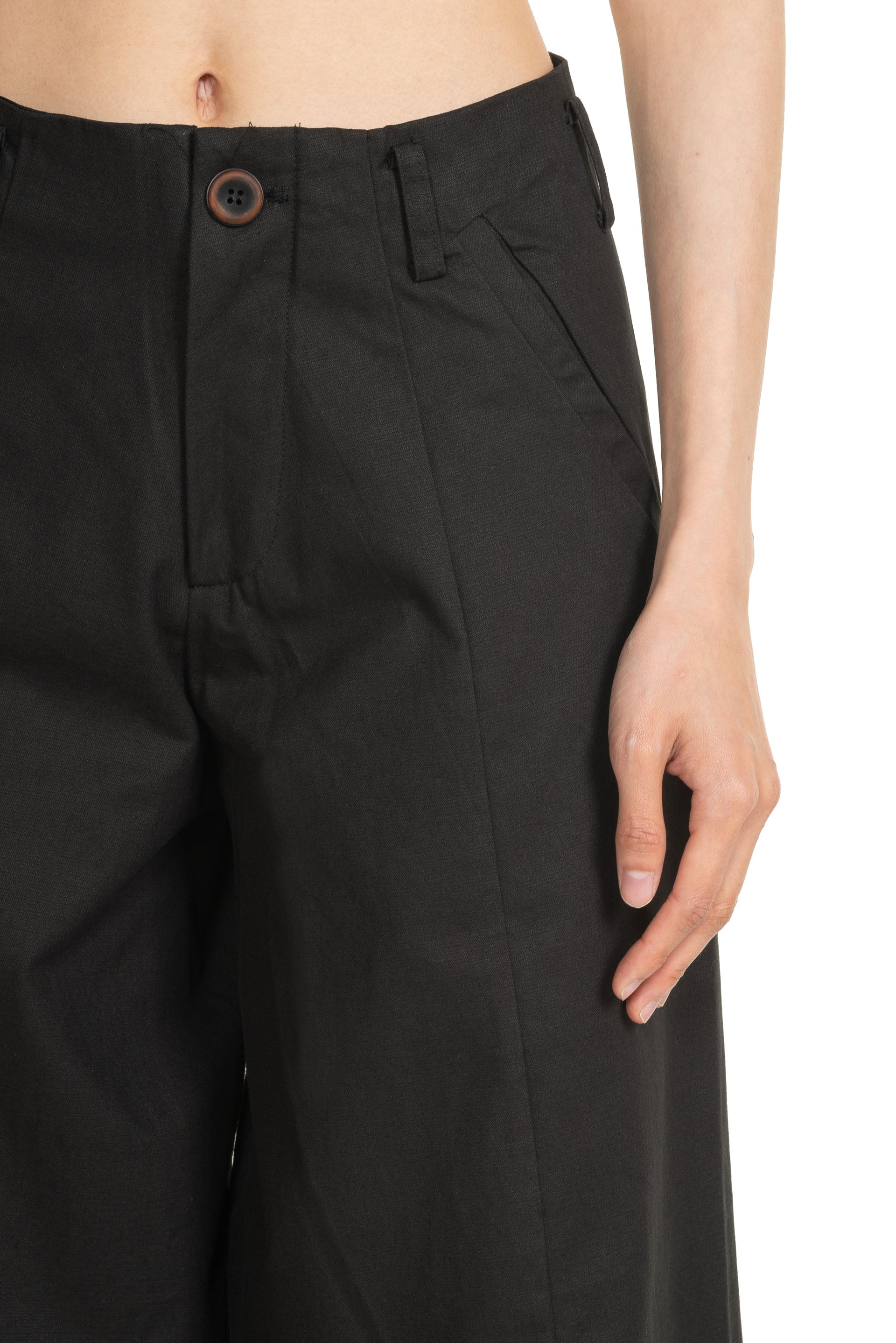 Button closure ate waist. Wooden button. Two side pockets. Curved leg design.