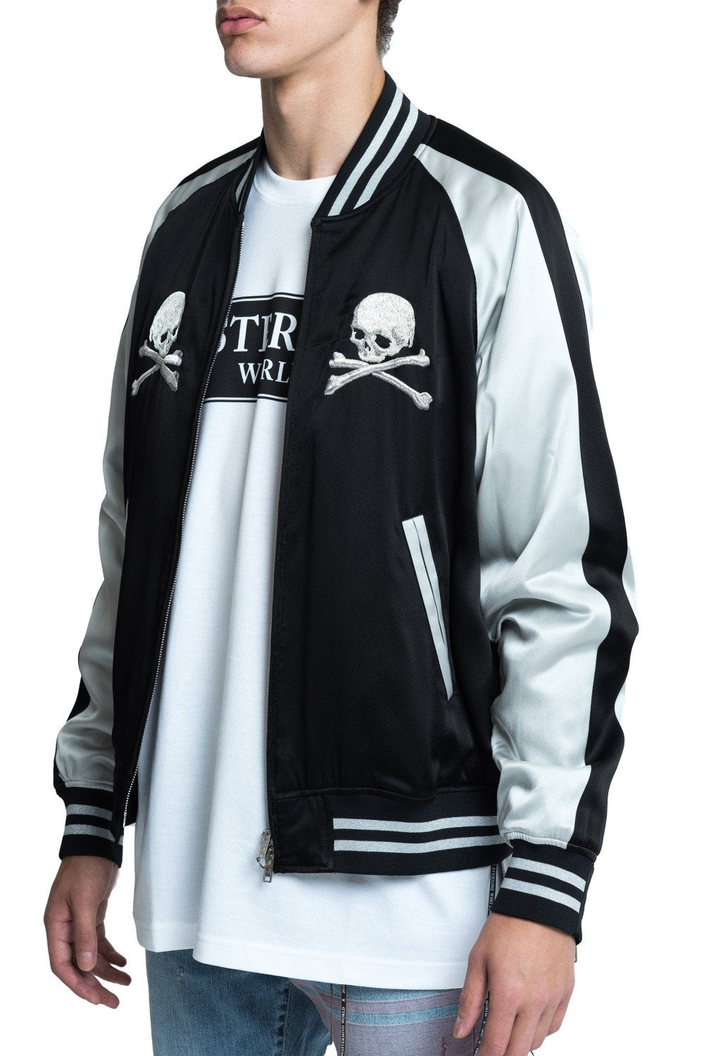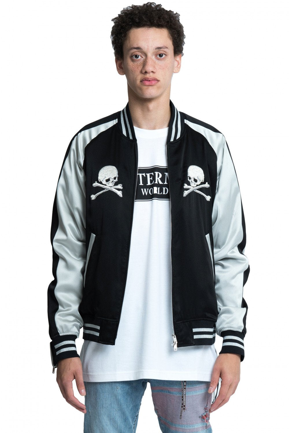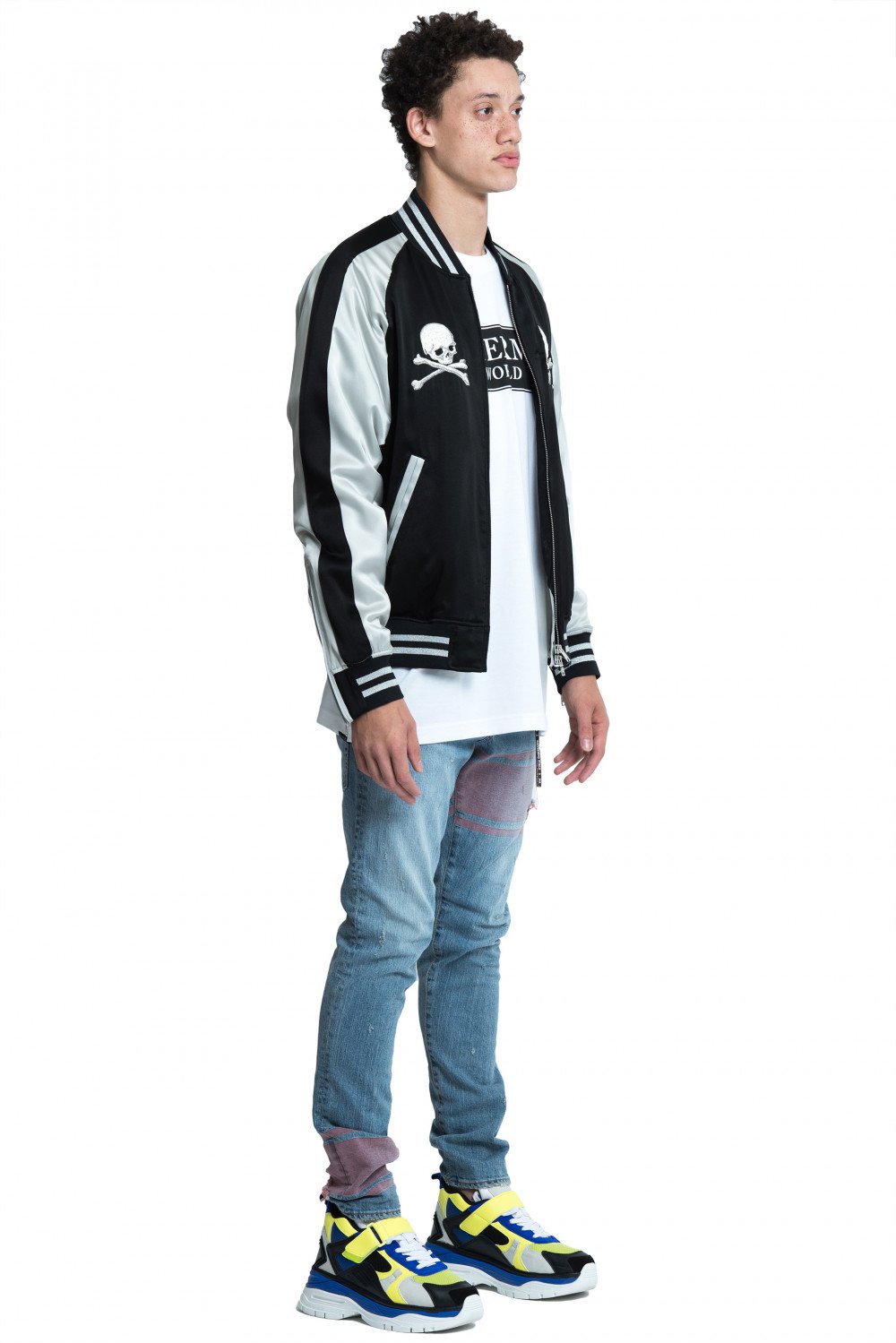 The skull and crossbones motif has now become notorious in luxury streetwear, Mastermind Japan and now Mastermind World has been the original pioneer of the streetwear movement we see today. The Skull Embroidery Souvenir Jacket brought in the Black and Grey colourway is a staple piece in any streetwear collection.
