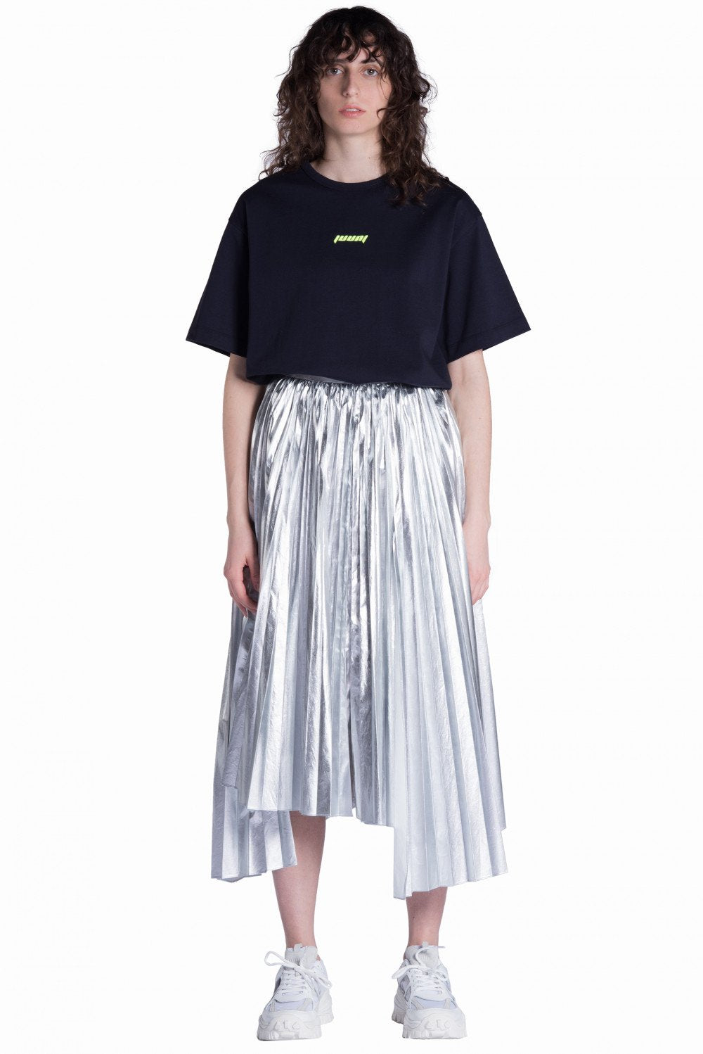 The theme of Juun. J’s SS 19 collection is “Alternative” and featured designs and silhouettes inspired by ’90s sportswear. The collection plays with fabric layering, embroidery and printing as seen in the Silver Pleated Skirt.