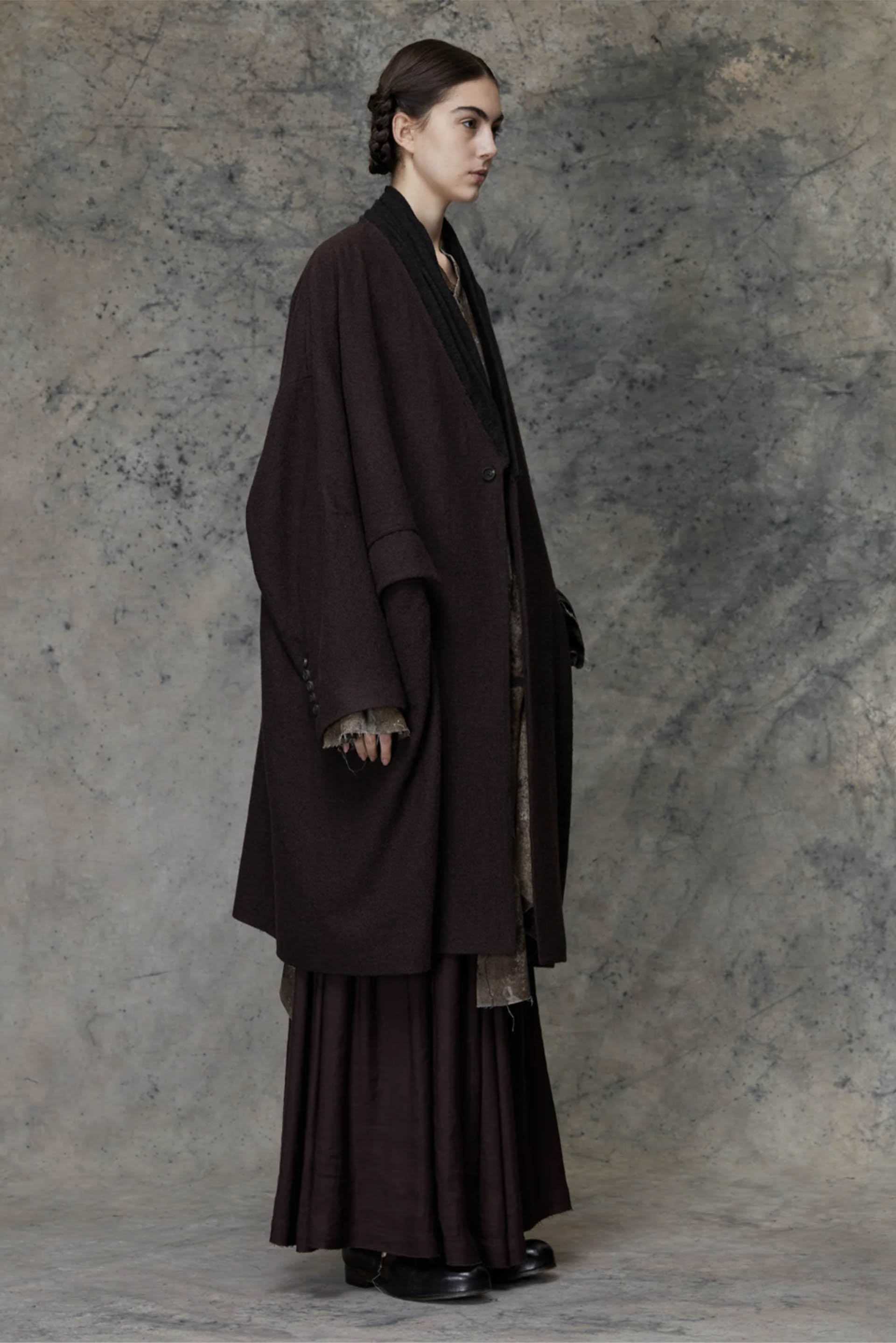 Single button coat. Loose fit. Over the knee length. Pleated shawl collar. Single button closure. Two front panel pockets. Slightly dropped shoulders. Fully lined.