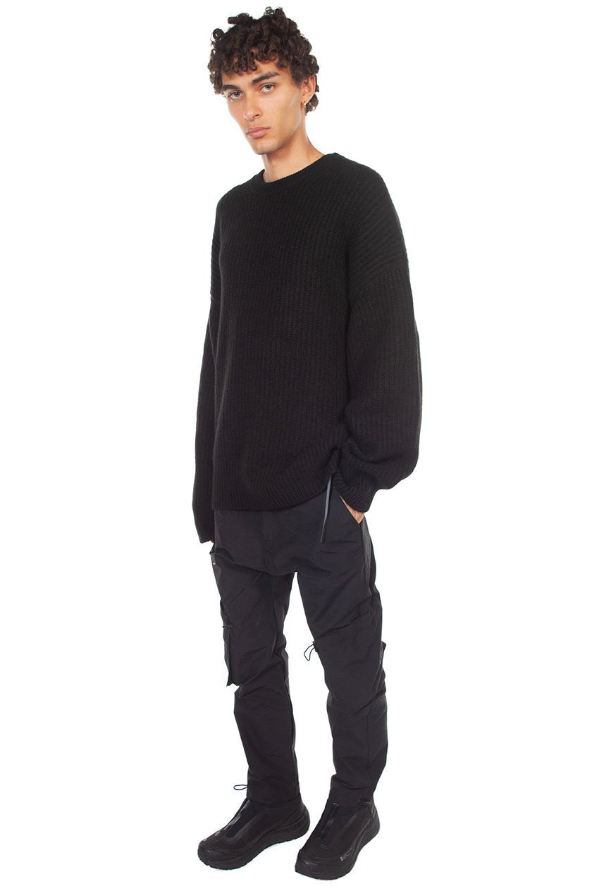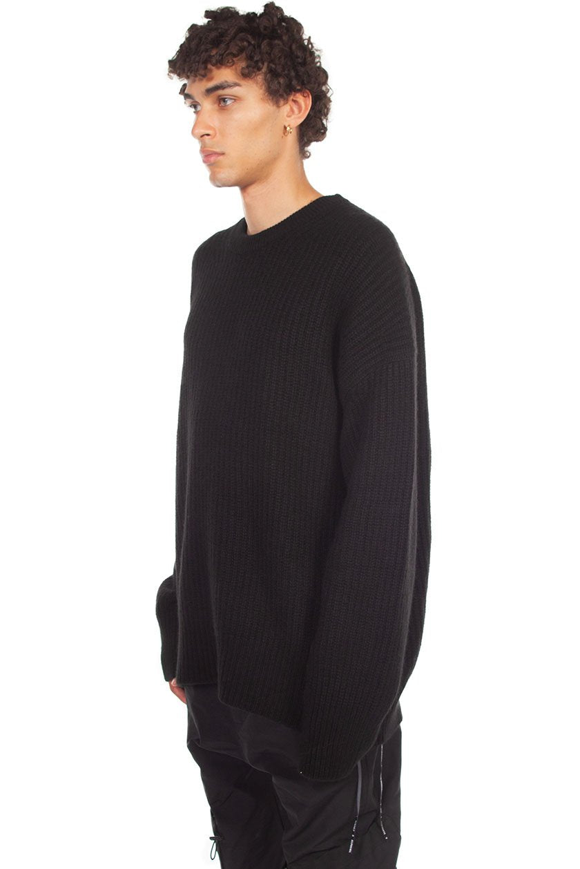 Mastermind World cashmere needle punch crewneck sweater. Oversized fit. Dropped shoulders. Engineered branding. Ribbed crewneck, Cuffs & Hem Back skull motif in grey.