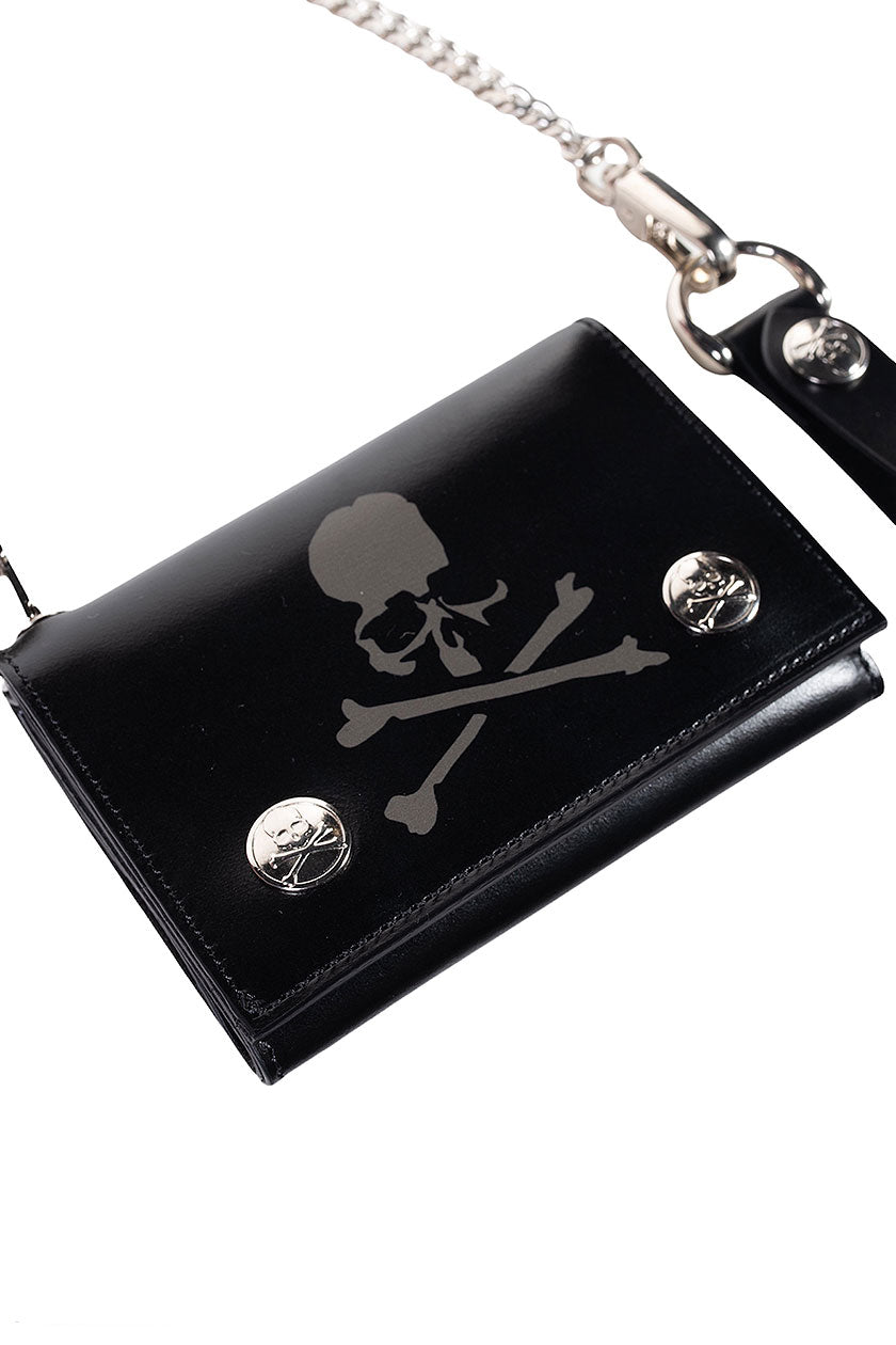 mastermind JAPAN Chained Wallet. Detachable chain. Front skull logo. Note slot. Inner coin pocket. 2 inner card slots. Press-stud closure. Silver-tone hardware