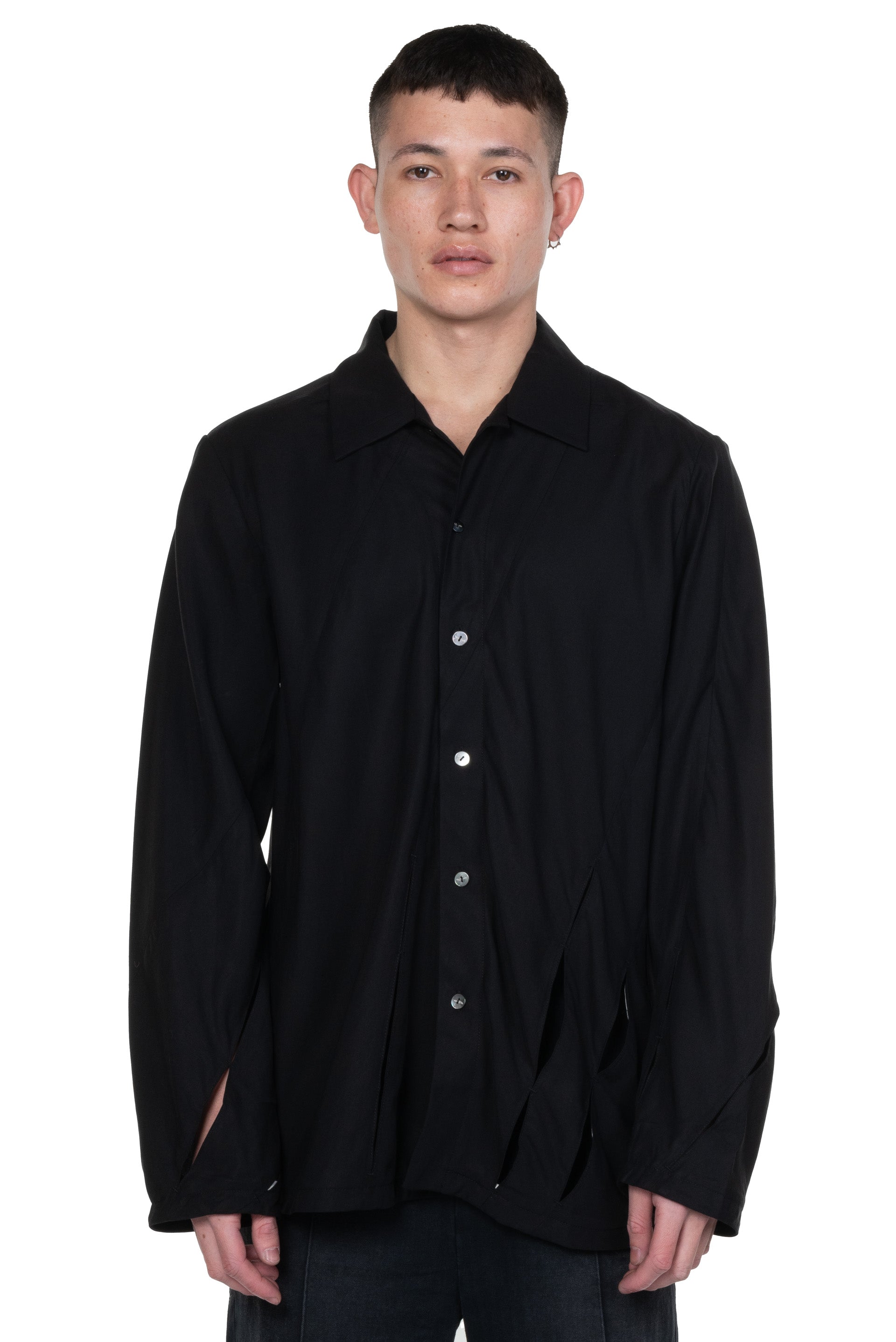 Professor. E Slit Shirt Black. Long sleeves. Button closure at front. Slit details throughout. Button at cuffs.
