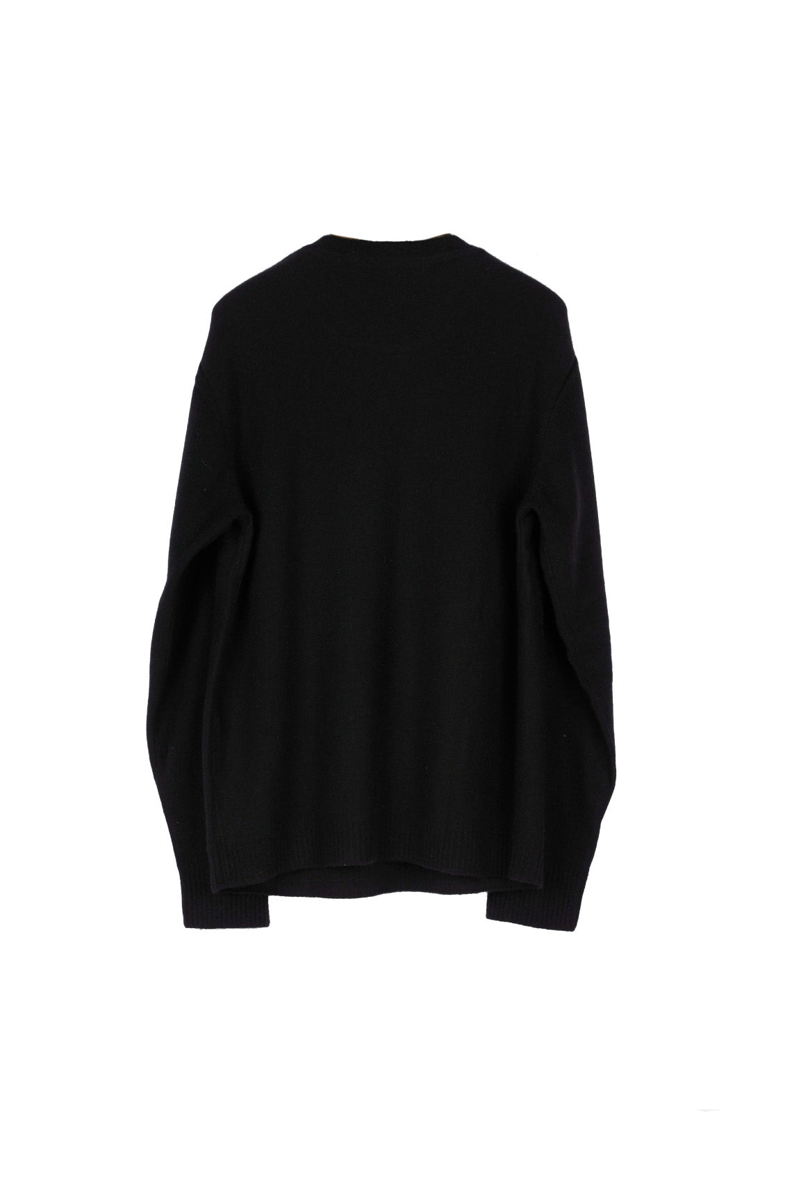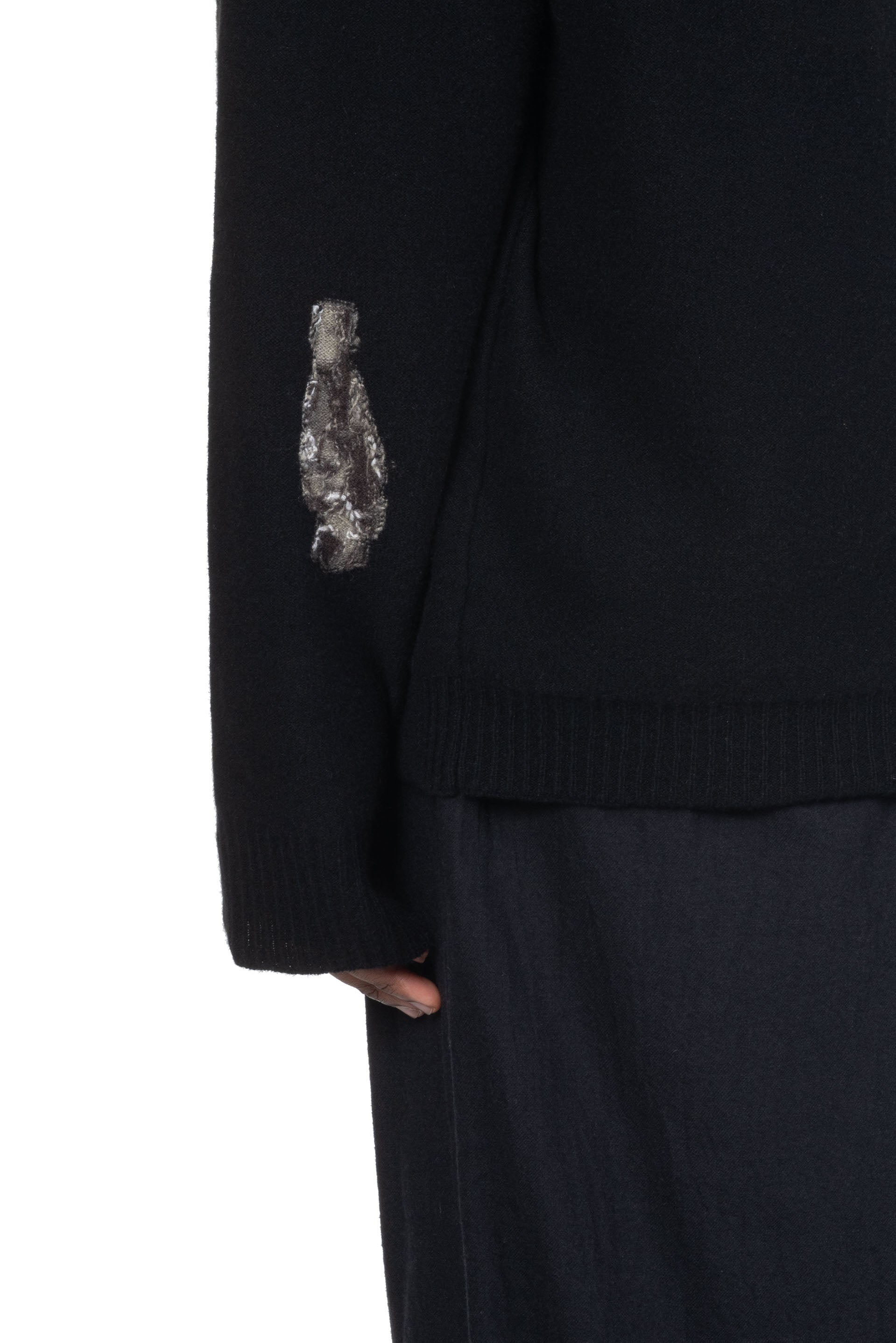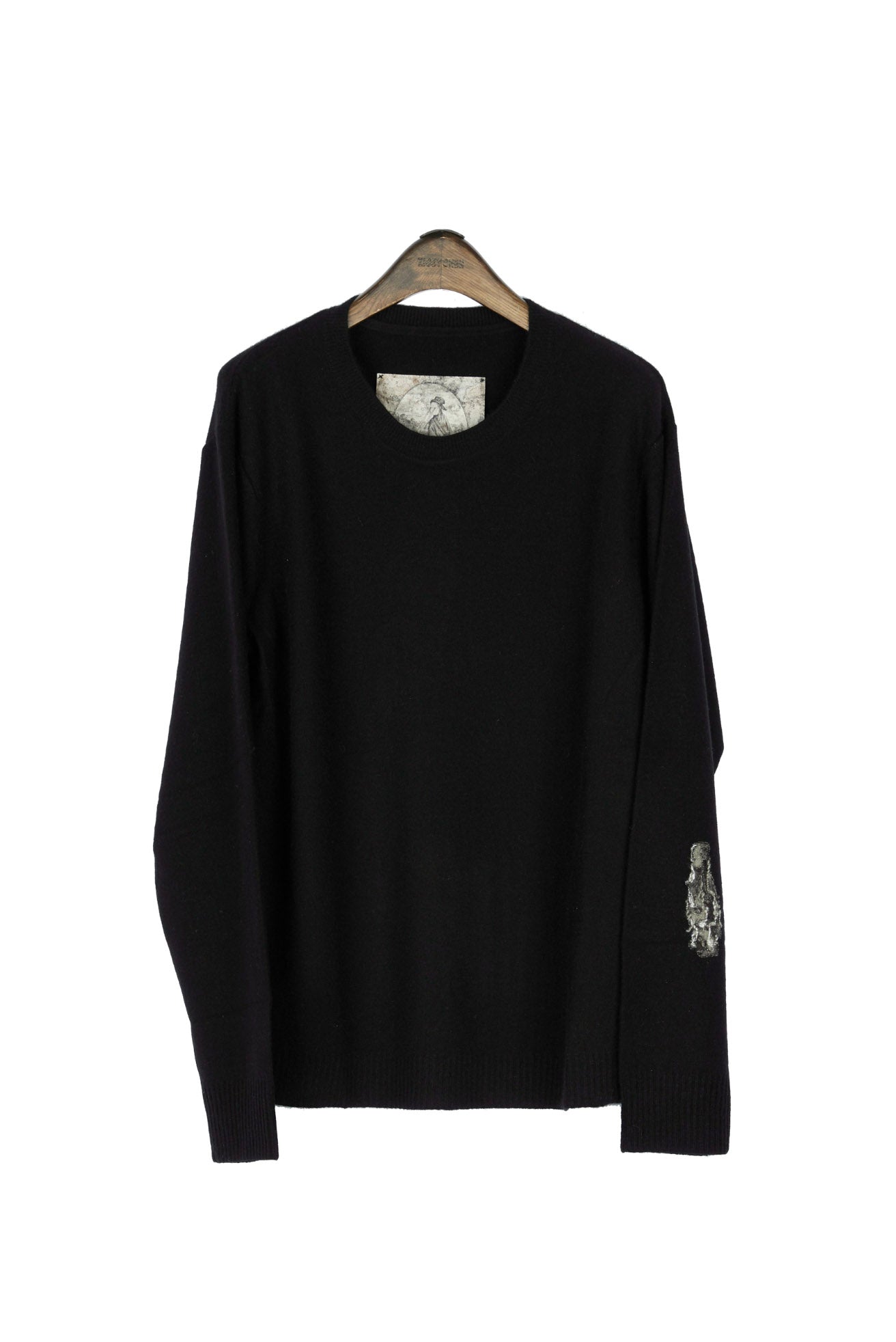 Ziggy Chen small statue intarsia sweater. Long sleeves. Loose fit. Below-hip-length. Crew-neck. Intartia of small statue on the left forearm.