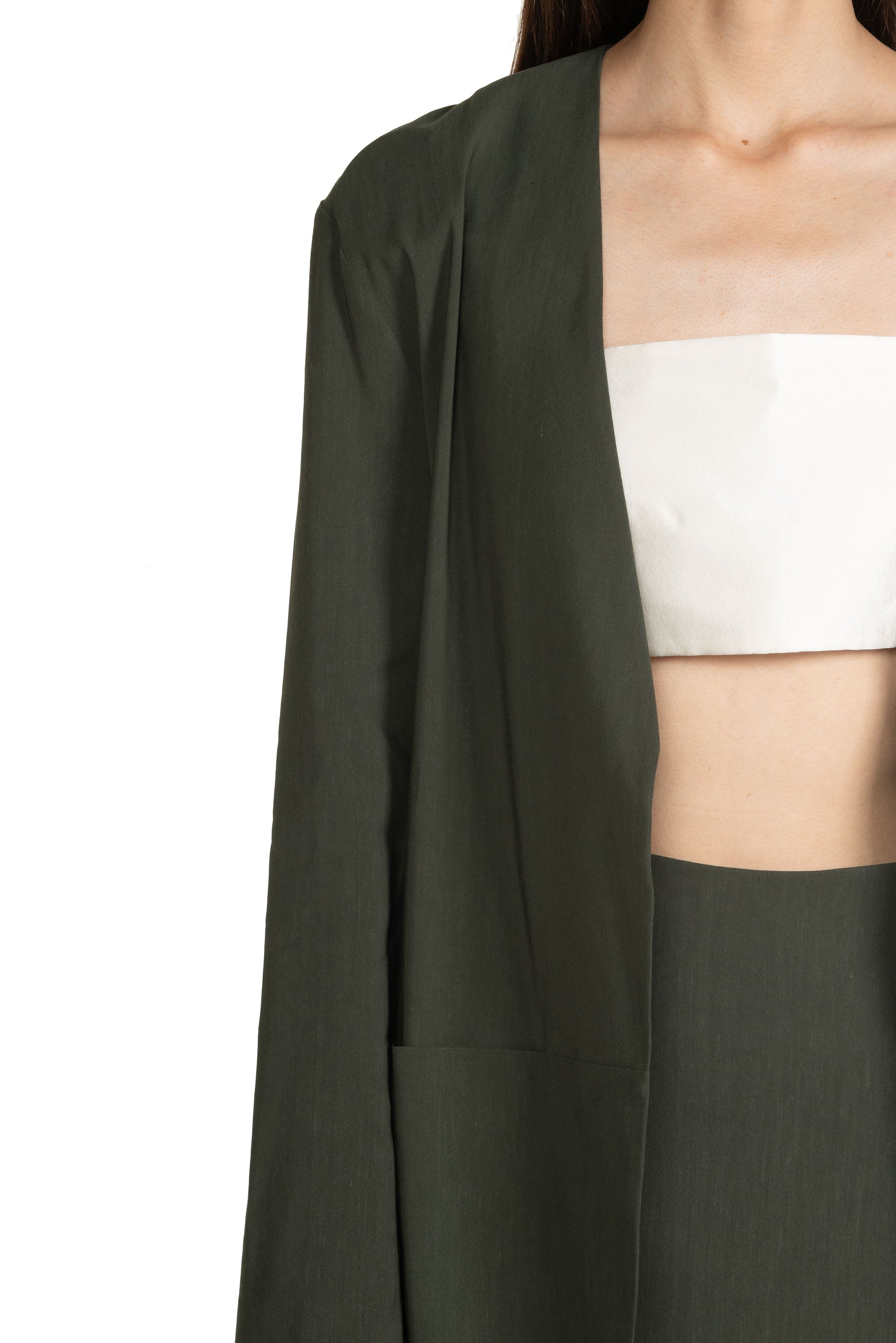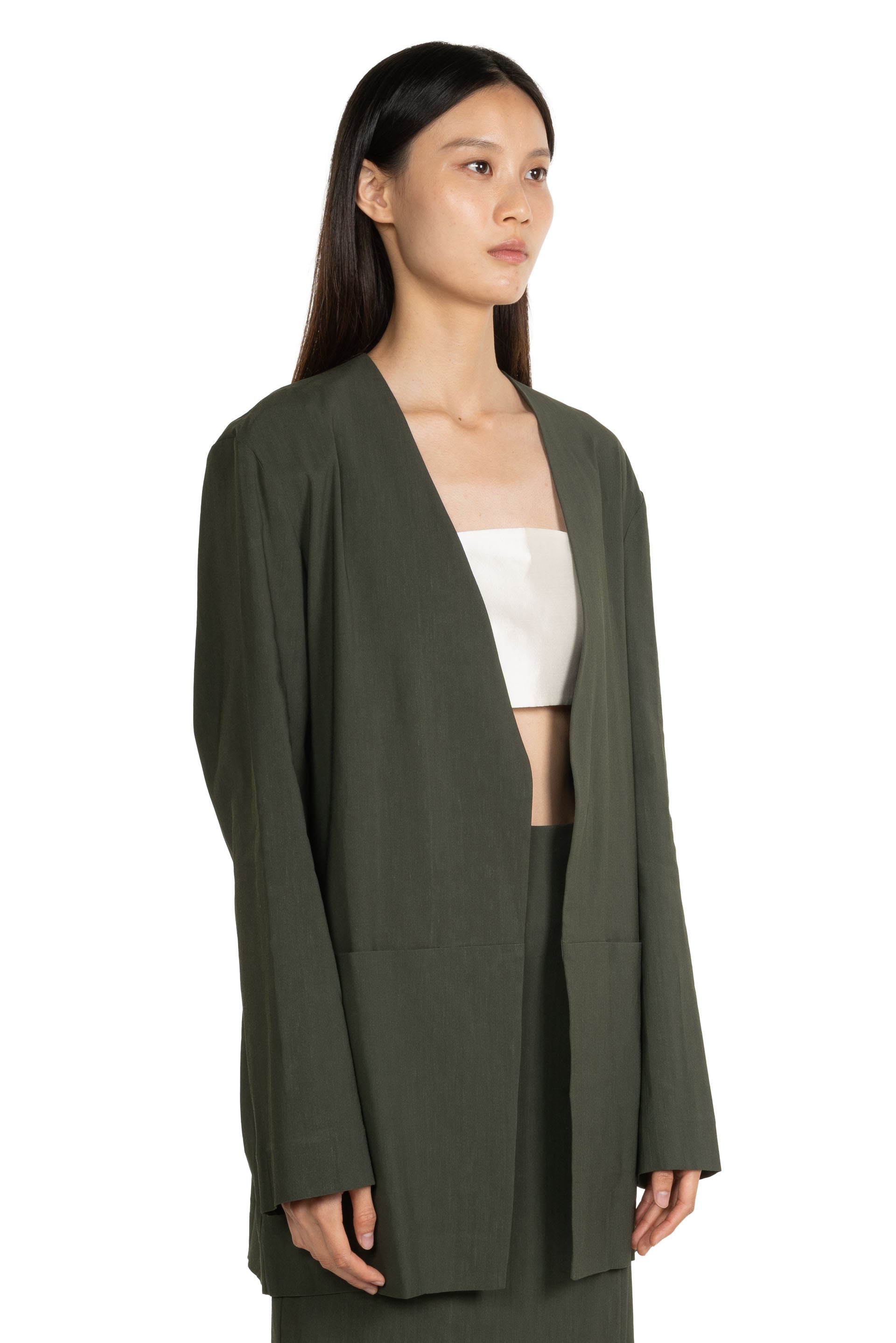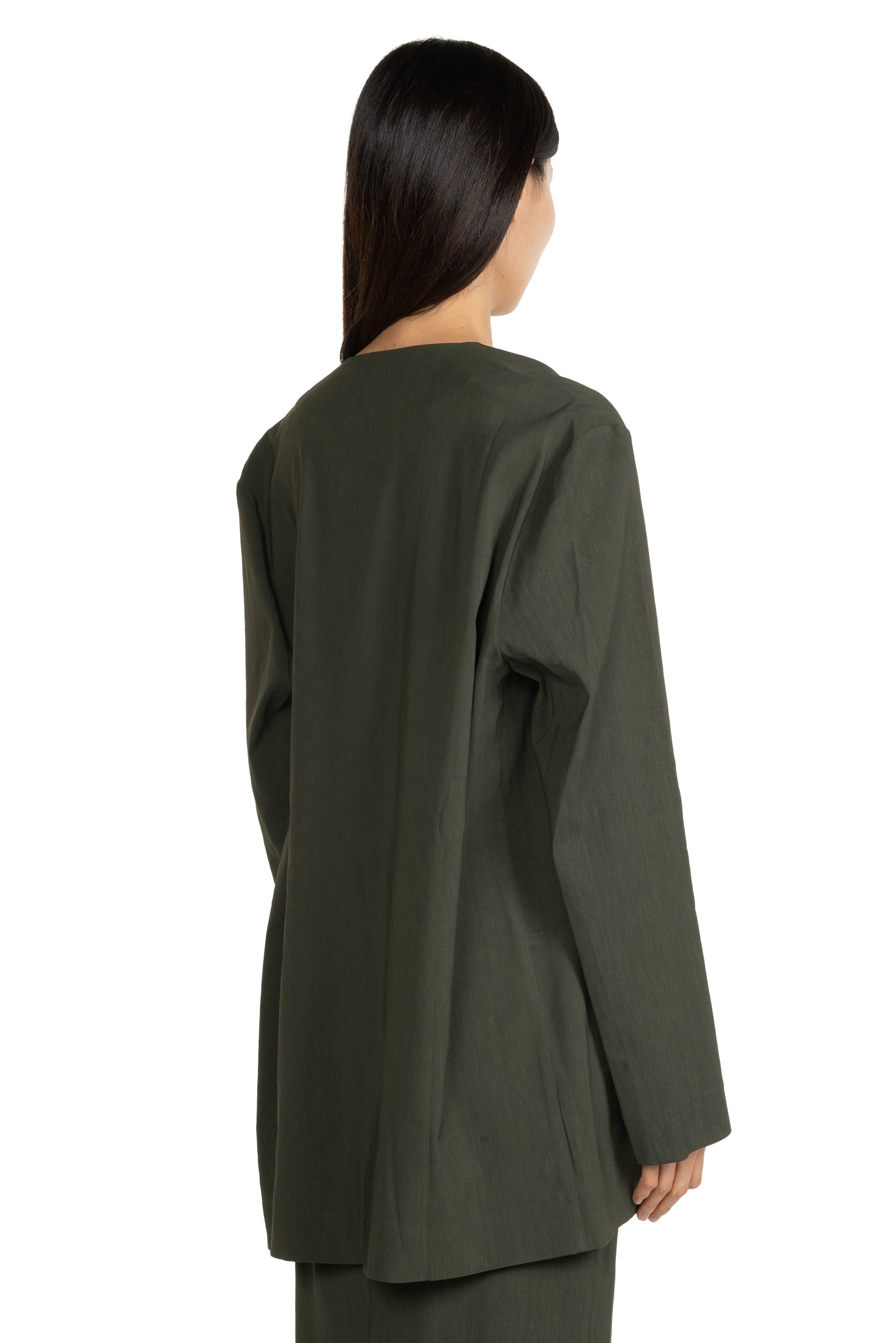 Cortana jacket made from a fabric that combines linen and virgin wool. Long sleeves. The Soto jacket has no buttons or lapels and has two inset pockets on the front.