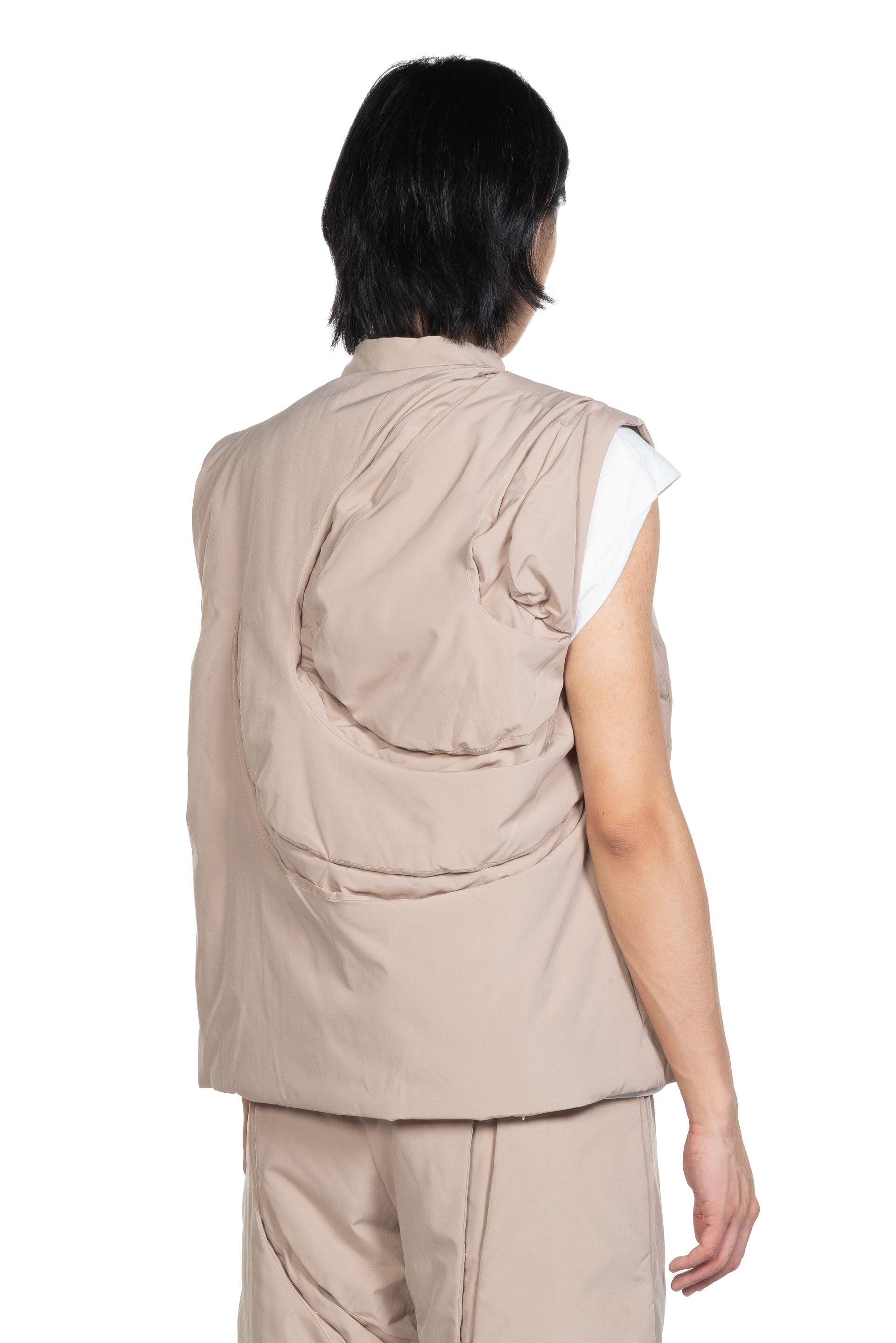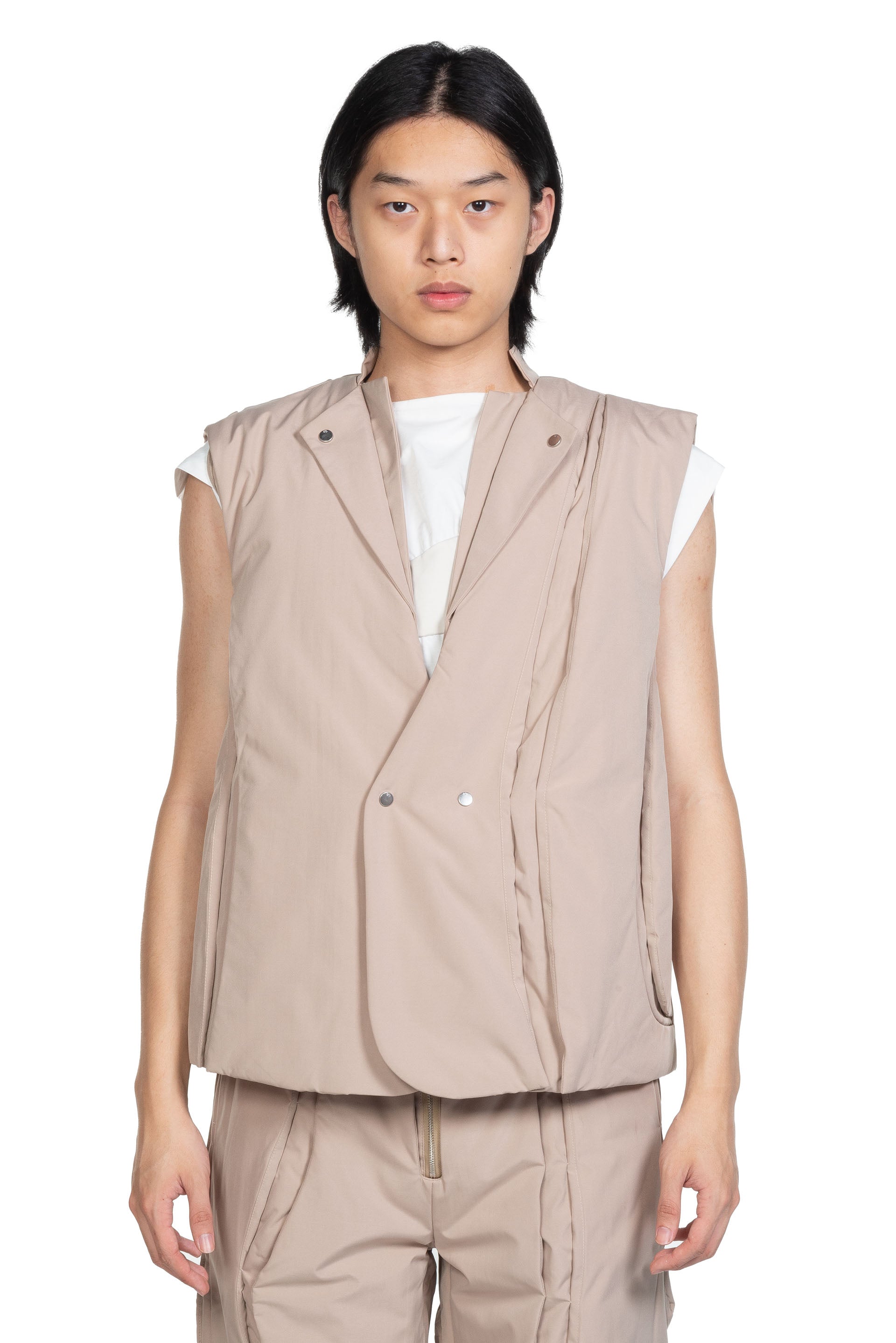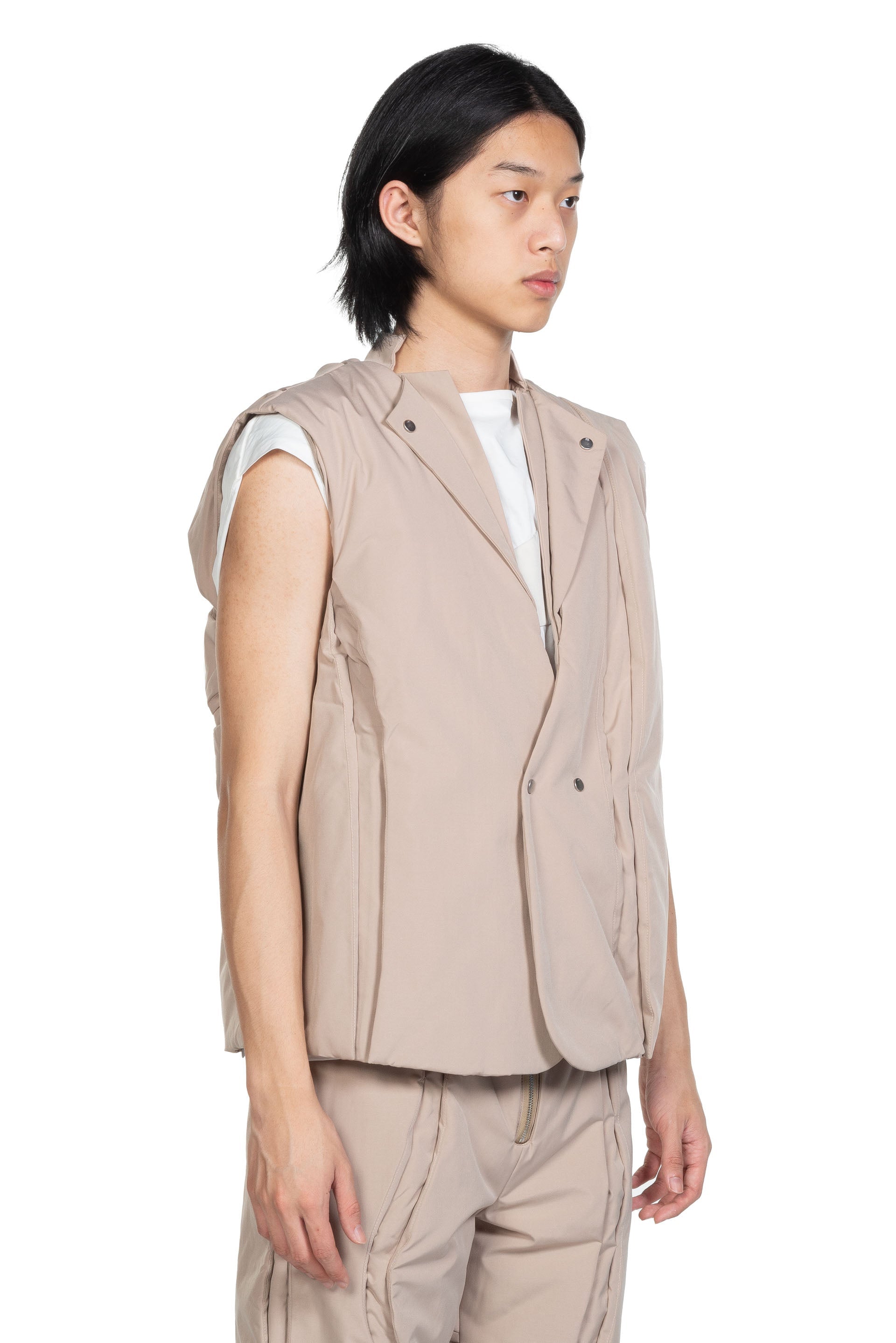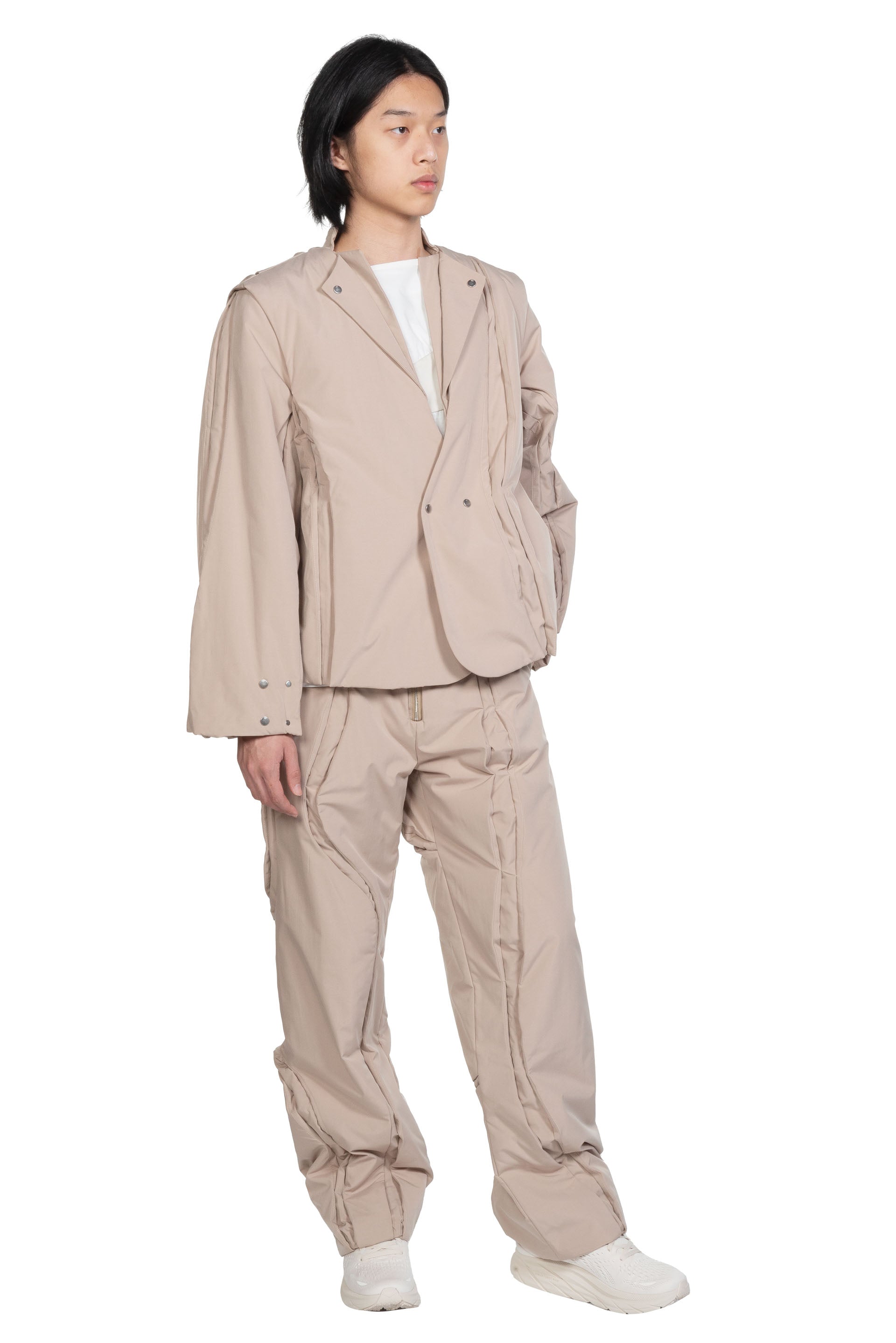 Aenrmous plays heavily with layers, asymmetry, deconstruction of pieces and detachable or adjustable elements. The brand understands trends while building something new and exciting as seen with the Spin Crevice Blazer Beige.