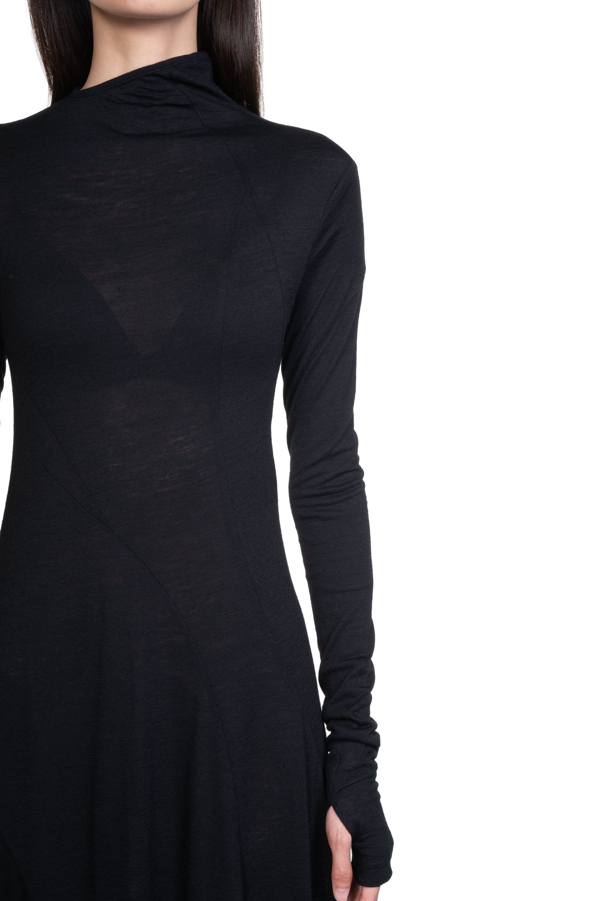 Long sleeves. High deconstructed neck. Panelled design throughout. Pleated at bottom. Soft textural wool fabric.