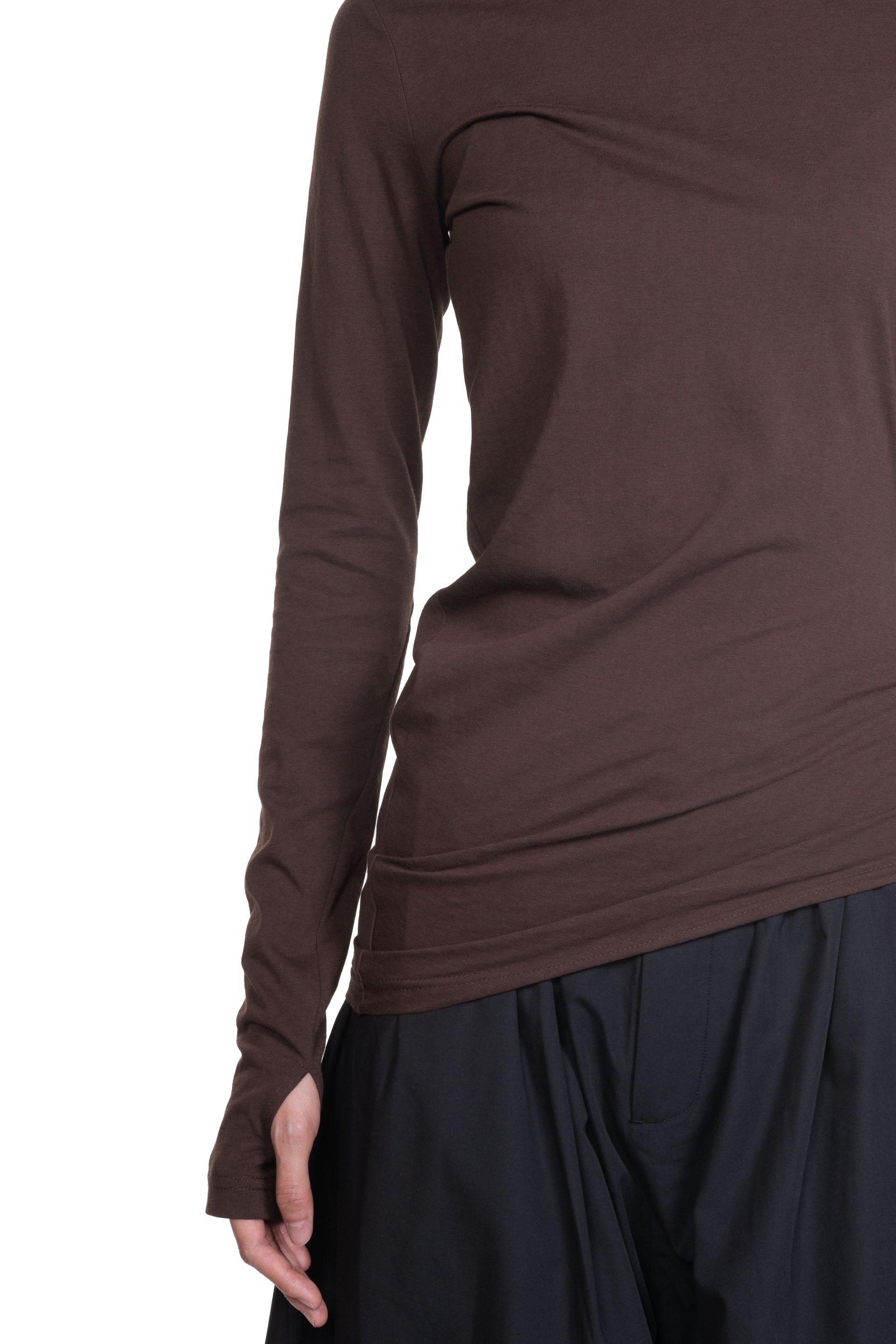 Long sleeves. Round neck. Curved "spiral" design at bottom. Asymmetrical design. Thumb hole at cuff. Soft cotton fabric.