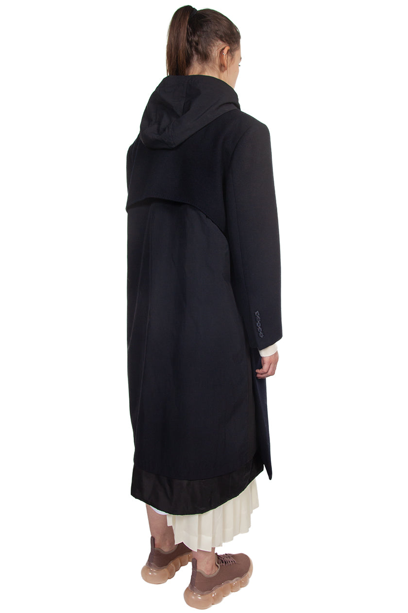 Coat with patchwork on the back by cutting the remaining parts after production of men's jackets. Hooded coat with feminine silhouette but solid appearance. A design that considers the use of what remains after production. Detachable hoodie. Button closure.