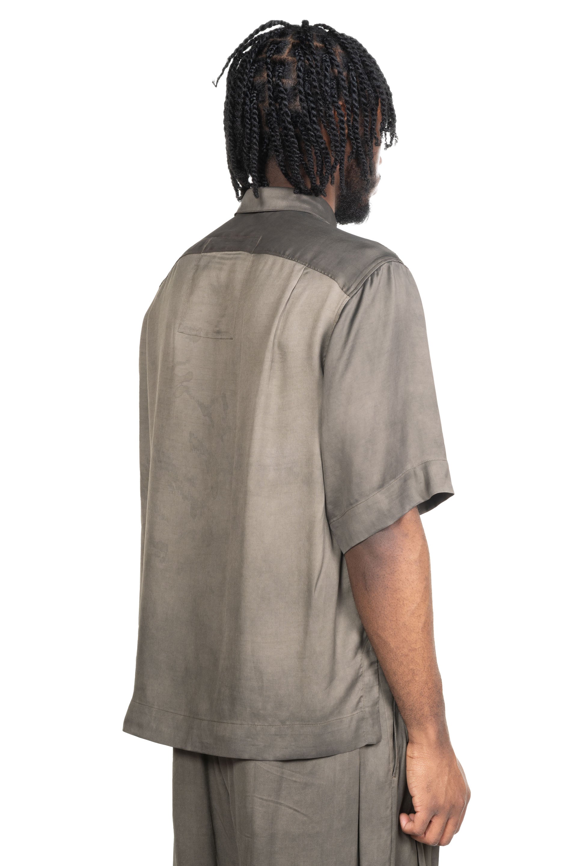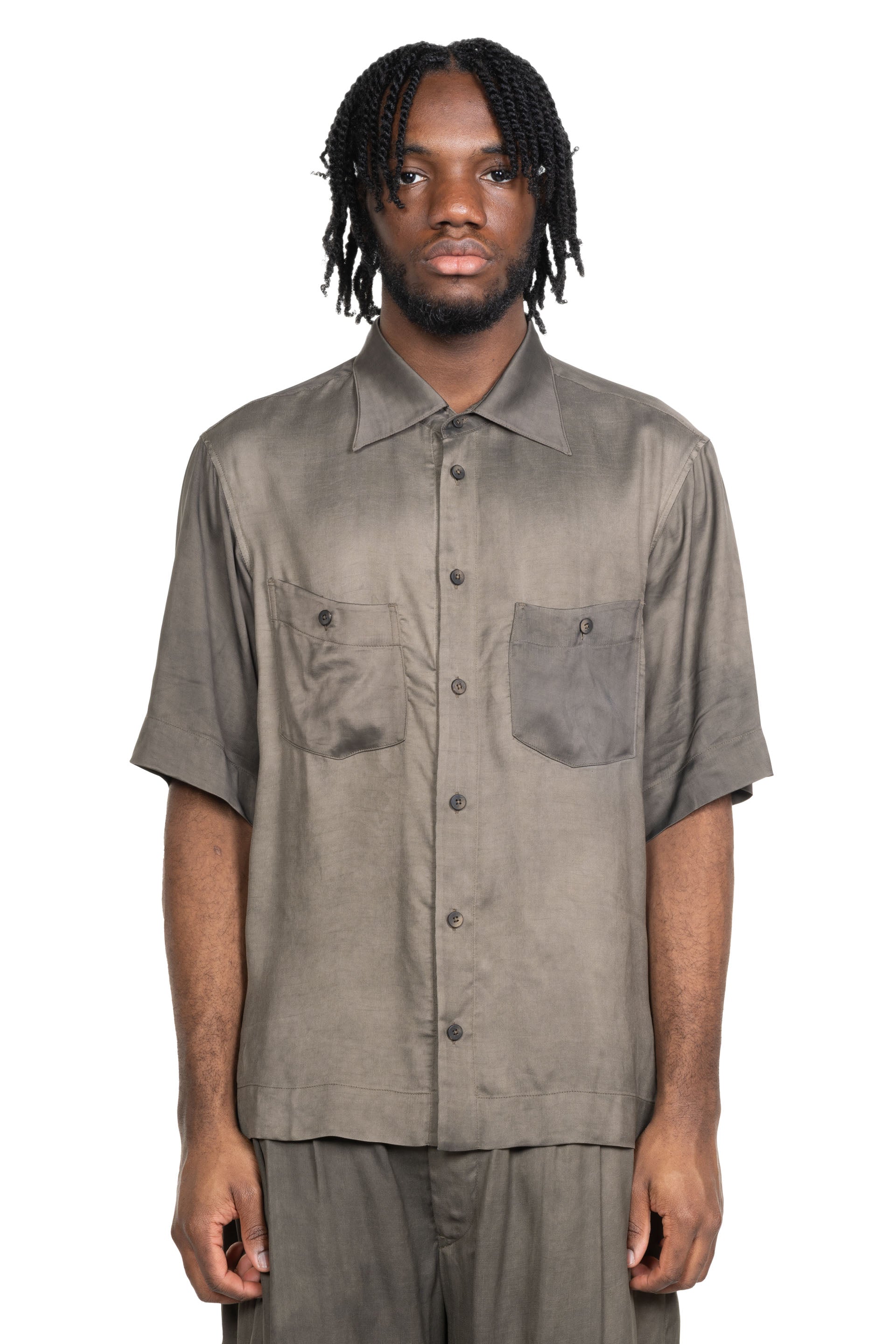 Ziggy Chen Spread Collar Short Sleeve Shirt. Button closure at front. Spread collar shirt. Dropped shoulder. Two front pockets. Boxy fit. Button closure at front. Signature slit at sides. Ziggy Chen seasonal Dye.
