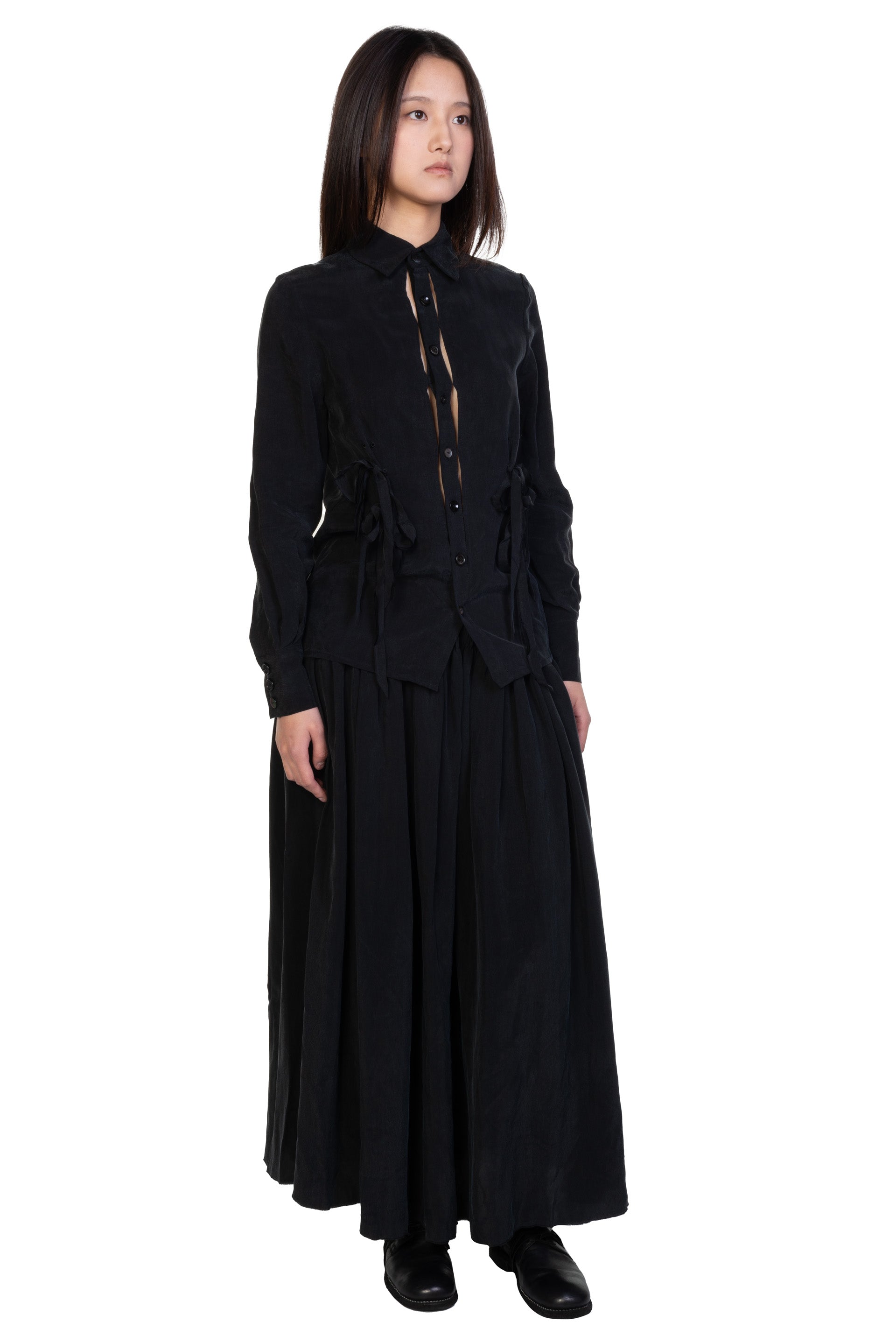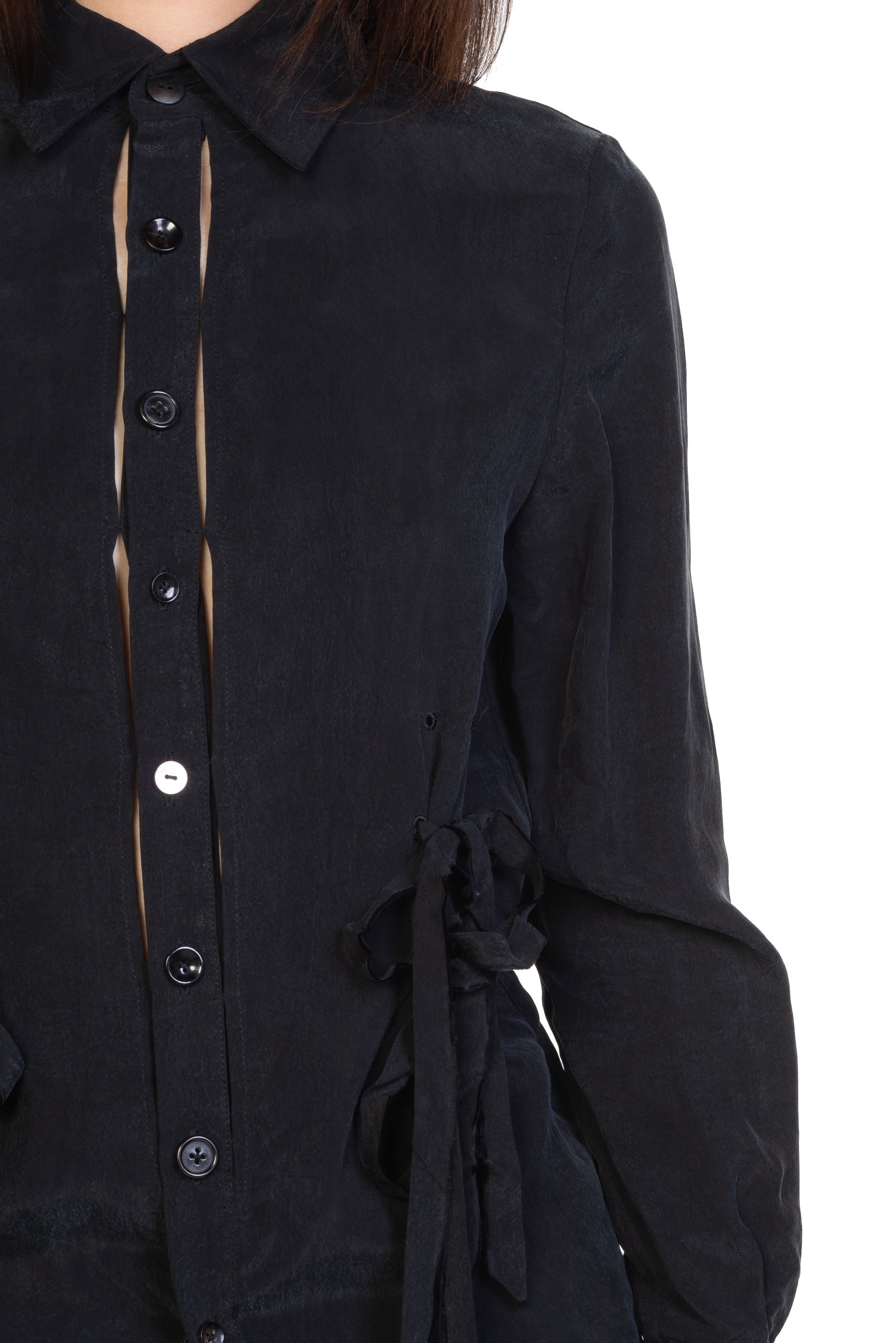 Long sleeves. Button closure at front. Button at cuffs. Ribbons details throughout.