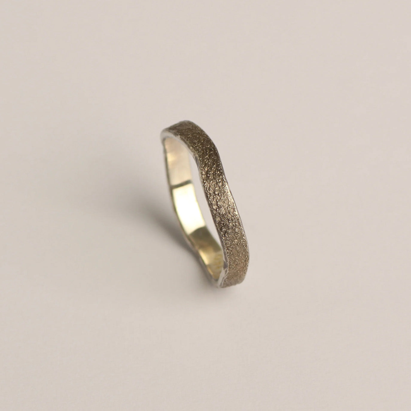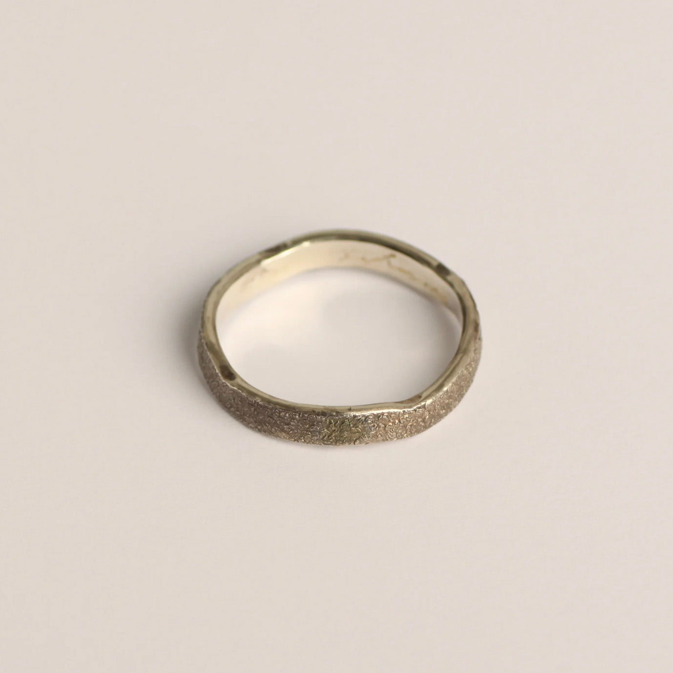 The iolom Stone Texture Ring features a sculptural surface inspired by natural stone, blending rusted and silvered textures for a raw, tactile effect. Made using traditional metalworking techniques, it celebrates imperfection, material integrity, and thoughtful craftsmanship.